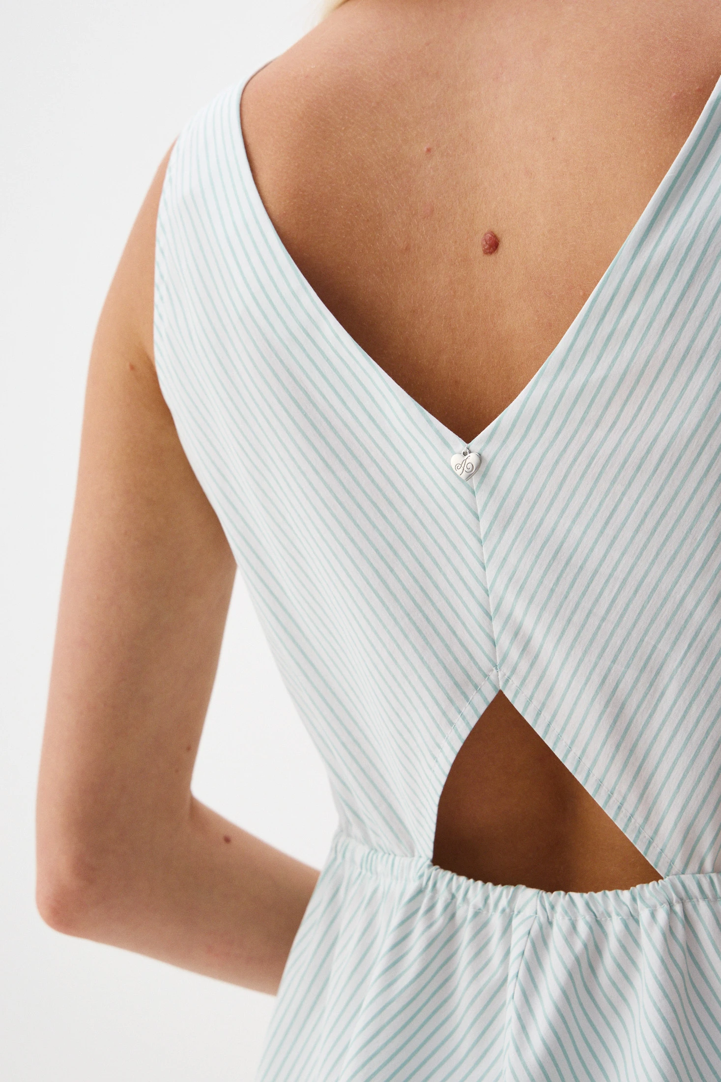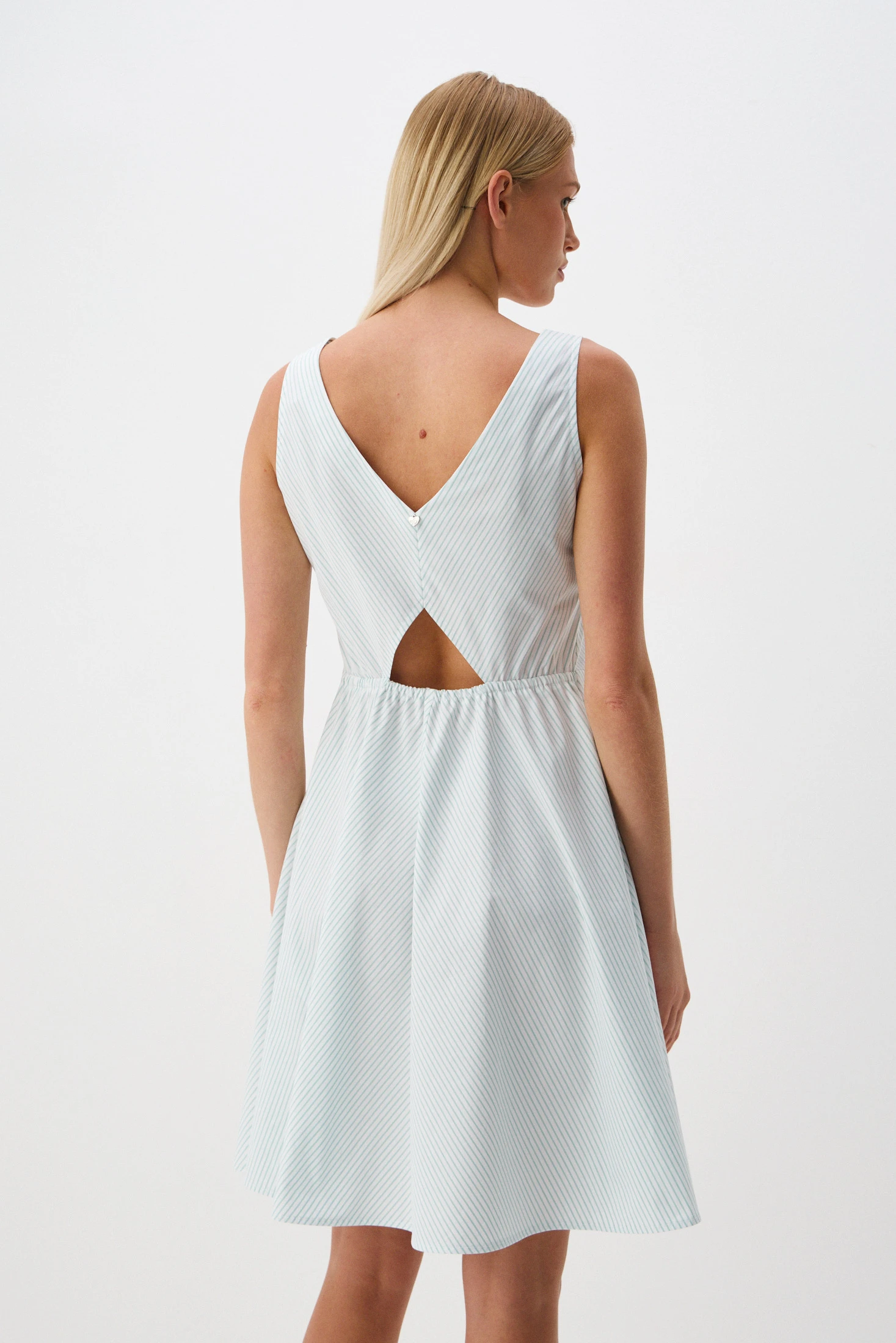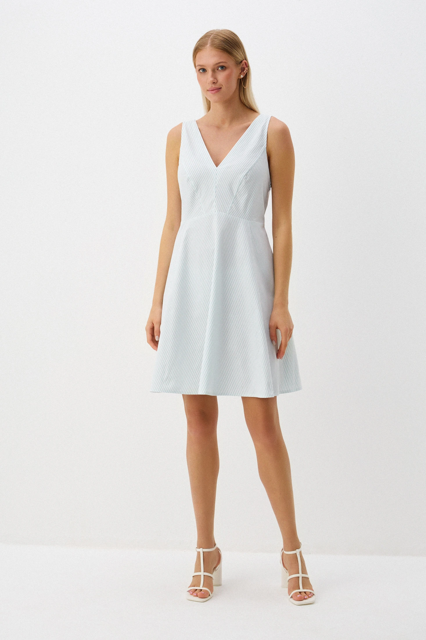 Сарафан выполнен из комфортной ткани на основе хлопка, что делает его идеальным выбором на жаркие летние дни. Фигурный подрез по линии талии создает женственный и элегантный силуэт, подчеркивая формы. V-образные вырезы по переду и спинке и юбка длины до колена добавляют сарафану деликатную соблазнительность и интересный детальный акцент.