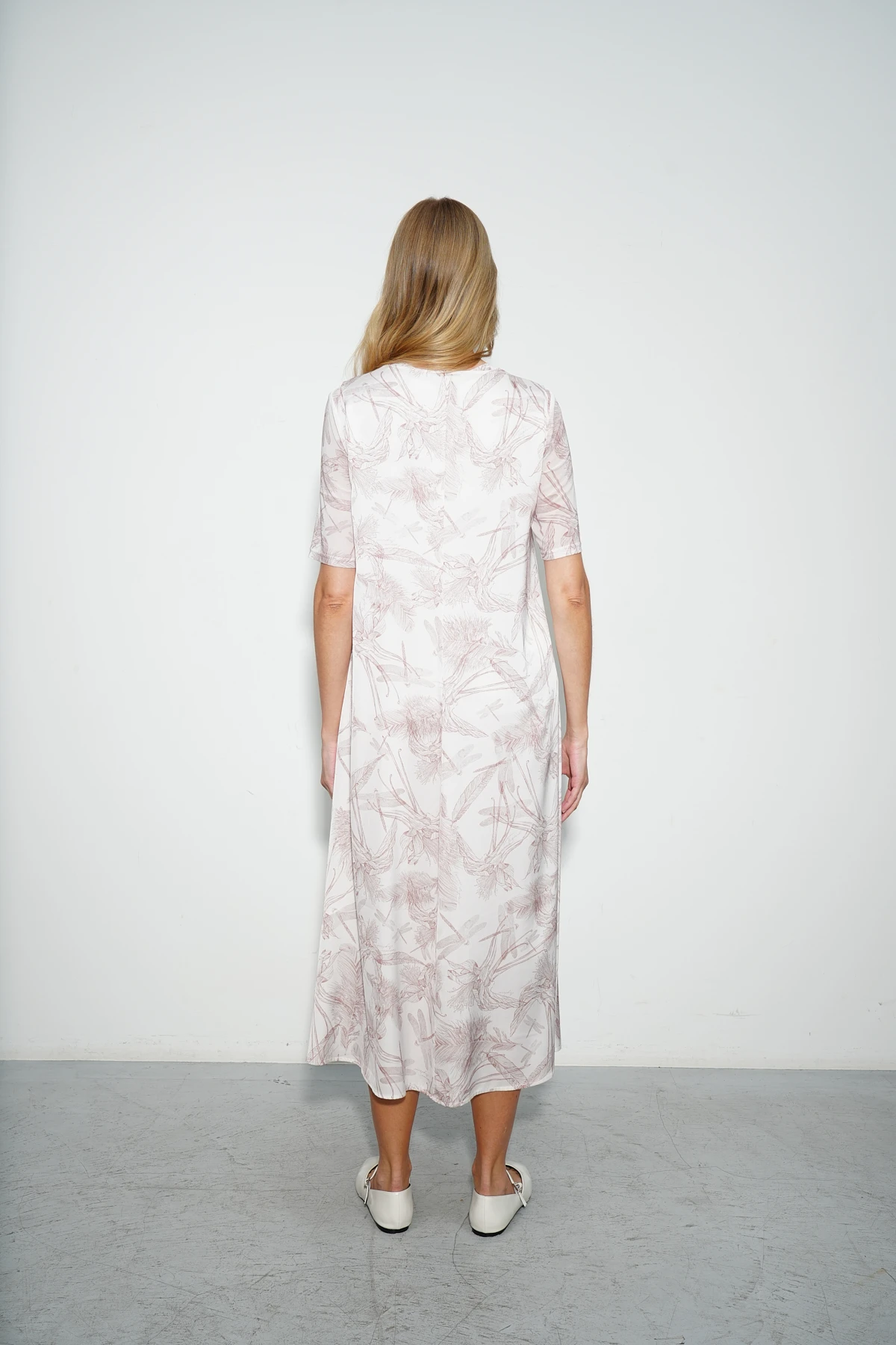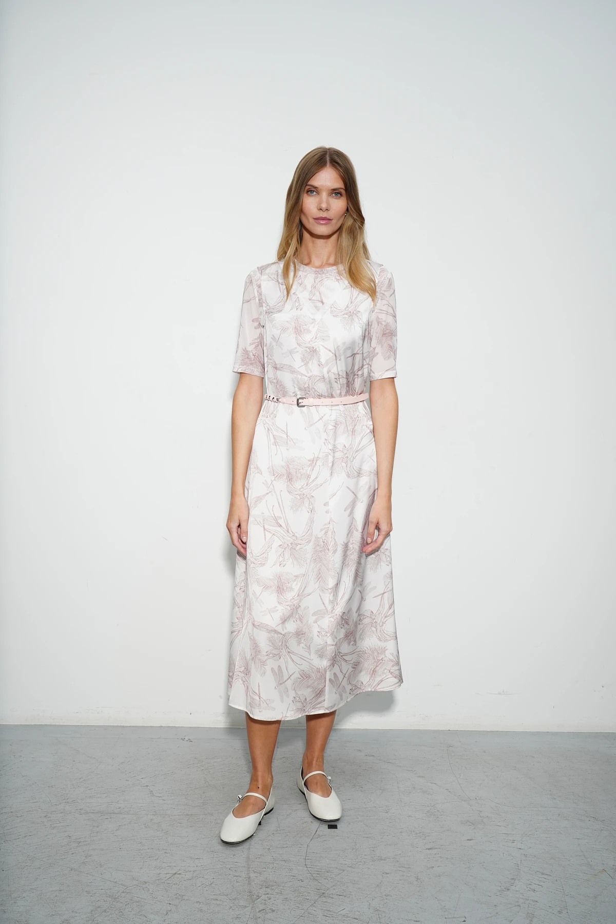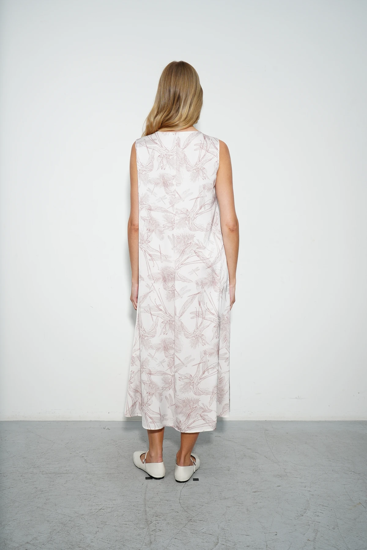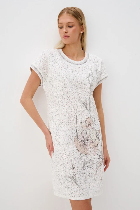 Сарафан из шелковистой вискозы с авторским принтом на нежном молочном фоне – воплощение легкости и изящества. Крой А-силуэта длины миди создает элегантный силуэт, подчёркивающий женственность и романтичность. Нагрудные вытачки обеспечивают идеальную посадку по фигуре. Изюминкой модели является V-образный вырез горловины, декорированный воздушной сеткой, которая придает образу утонченность и легкость. Сарафан станет отличным выбором как для повседневных прогулок, так и для особых моментов.