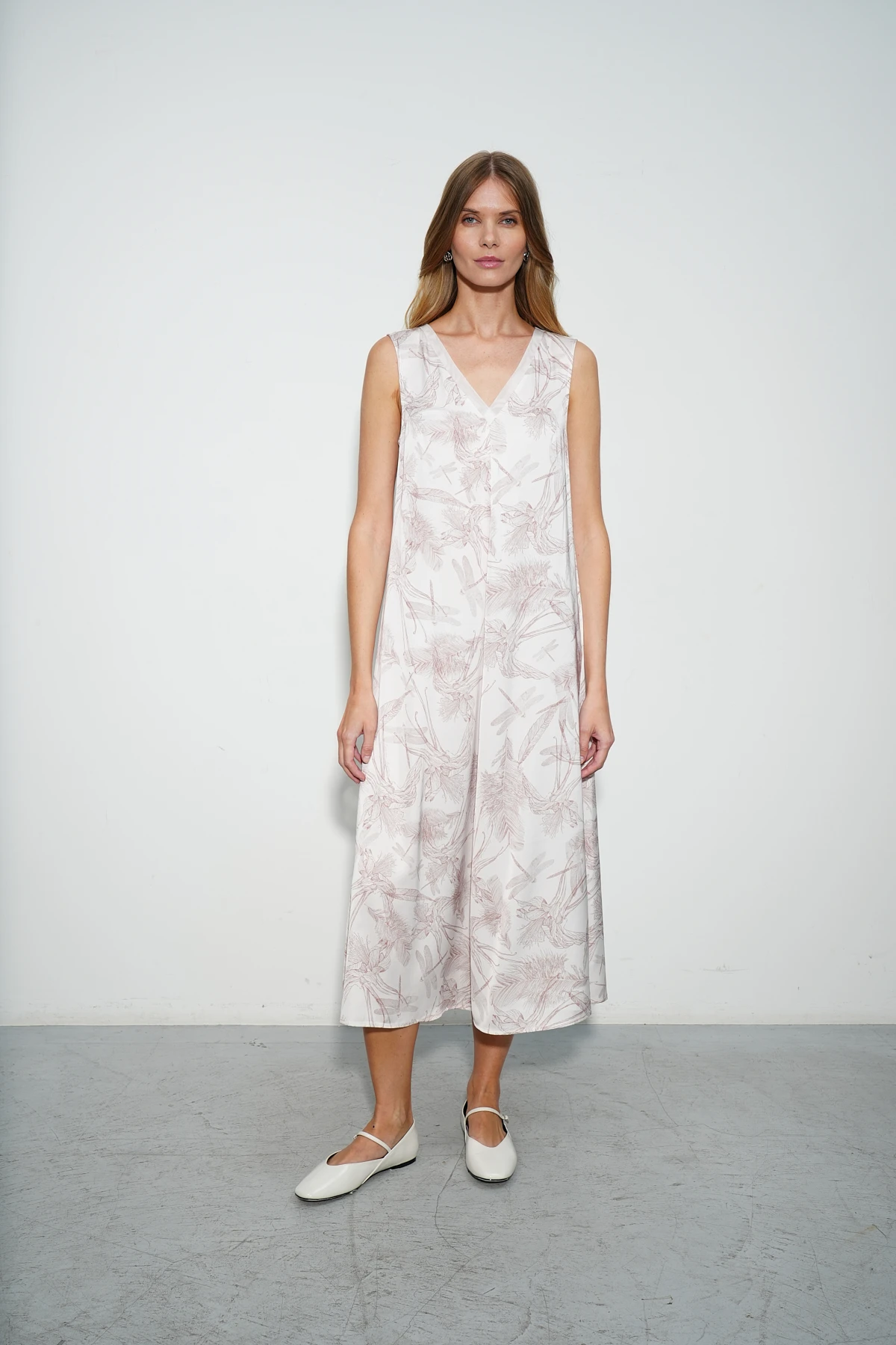 Сарафан из шелковистой вискозы с авторским принтом на нежном молочном фоне – воплощение легкости и изящества. Крой А-силуэта длины миди создает элегантный силуэт, подчёркивающий женственность и романтичность. Нагрудные вытачки обеспечивают идеальную посадку по фигуре. Изюминкой модели является V-образный вырез горловины, декорированный воздушной сеткой, которая придает образу утонченность и легкость. Сарафан станет отличным выбором как для повседневных прогулок, так и для особых моментов.