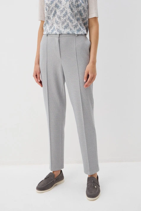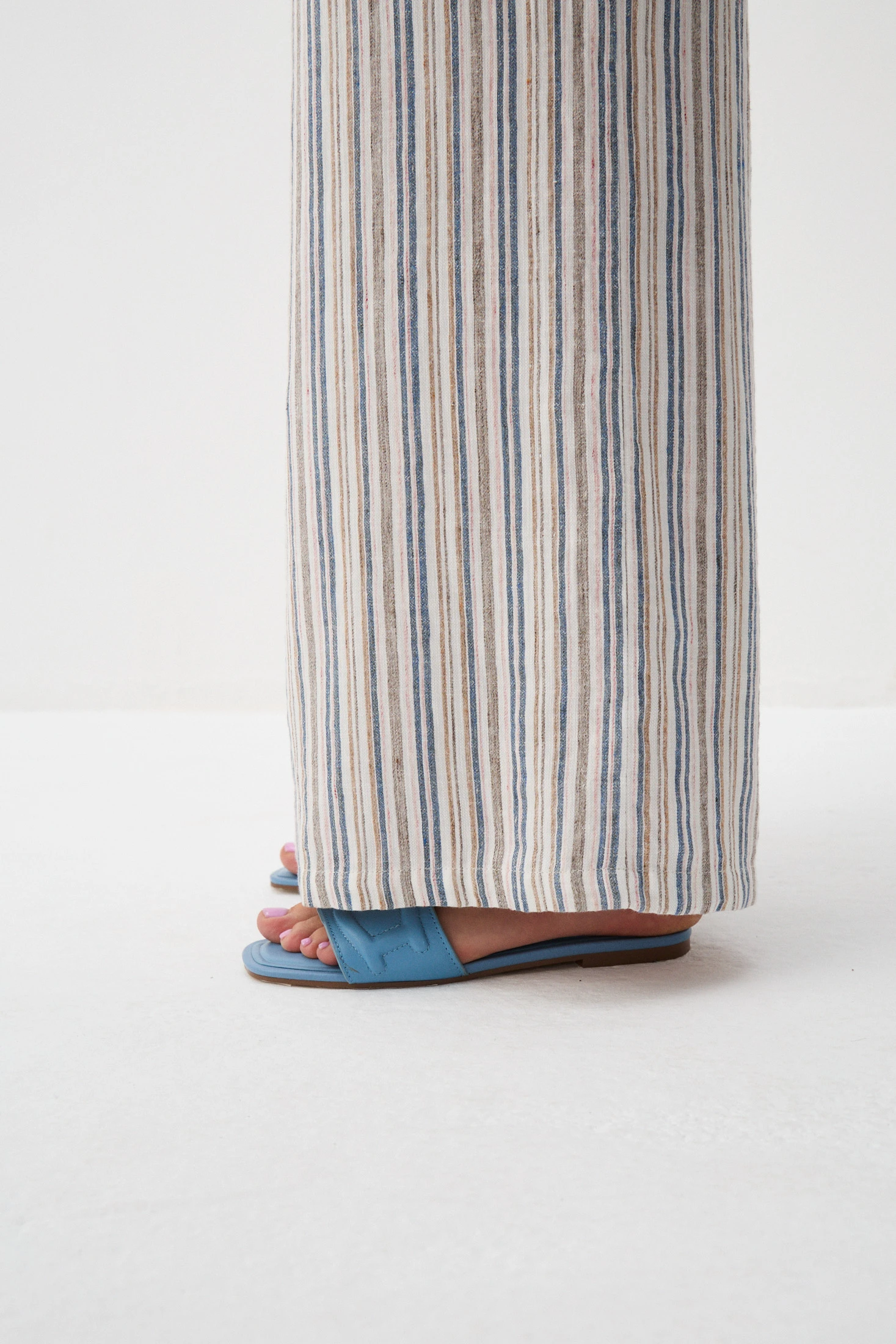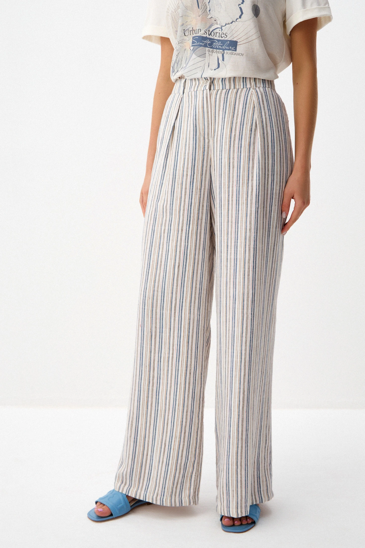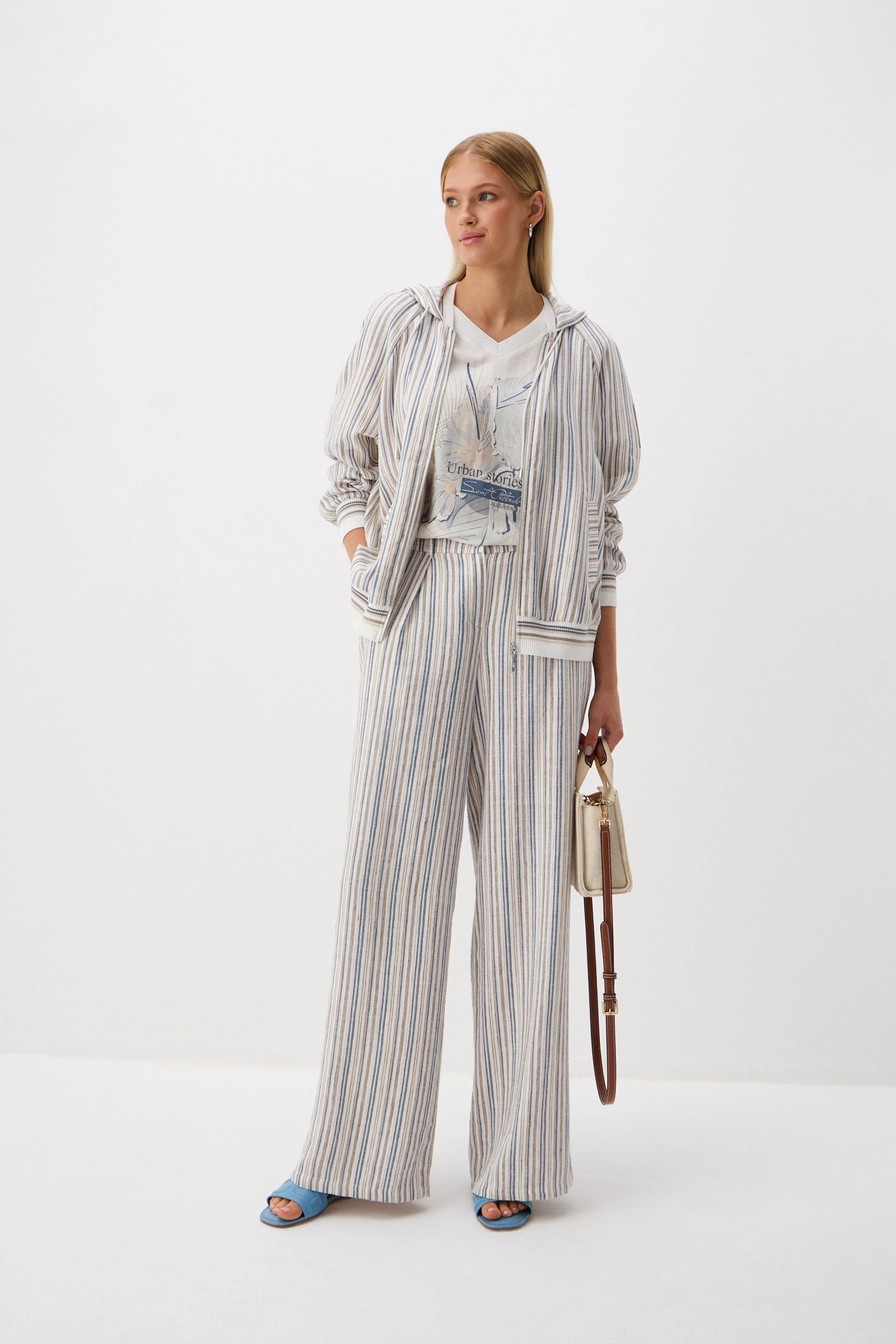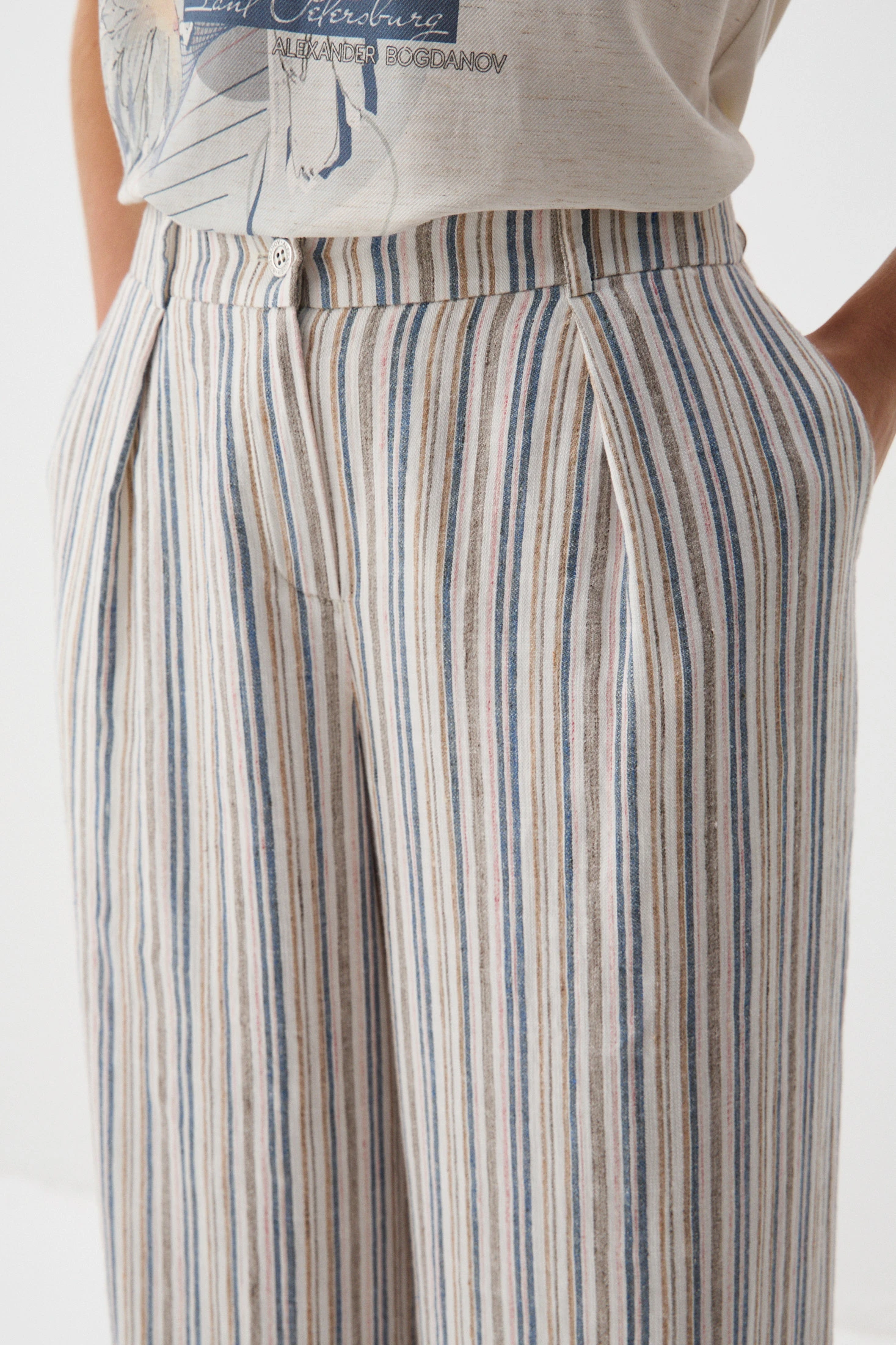 Брюки из ткани, соединившей в себе натуральные и искусственные волокна с высокой воздухопроницаемостью – хлопок, вискоза и лиоцелл. «Домотканая» фактура подчёркнута в динамичных полосках в оттенках «синий пепел», «розовый кварц», «сепия» и «корица».