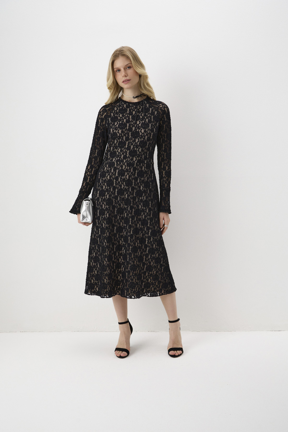 Платье из восхитительного ажурного гипюра с добавлением хлопка. Романтичные флоральные мотивы и торжественный оттенок «затмение» - смелое стилистическое столкновение в духе бренда. Перед и спинка платья дополнены подкладом телесного оттенка, создающим нюдовый эффект. Юбка А-силуэта длины миди формирует женственный силуэт. Трендовый акцент – рукава с эффектом «клёш». Круглый вырез горловины и низ рукавов оформлены деликатной рюшей.