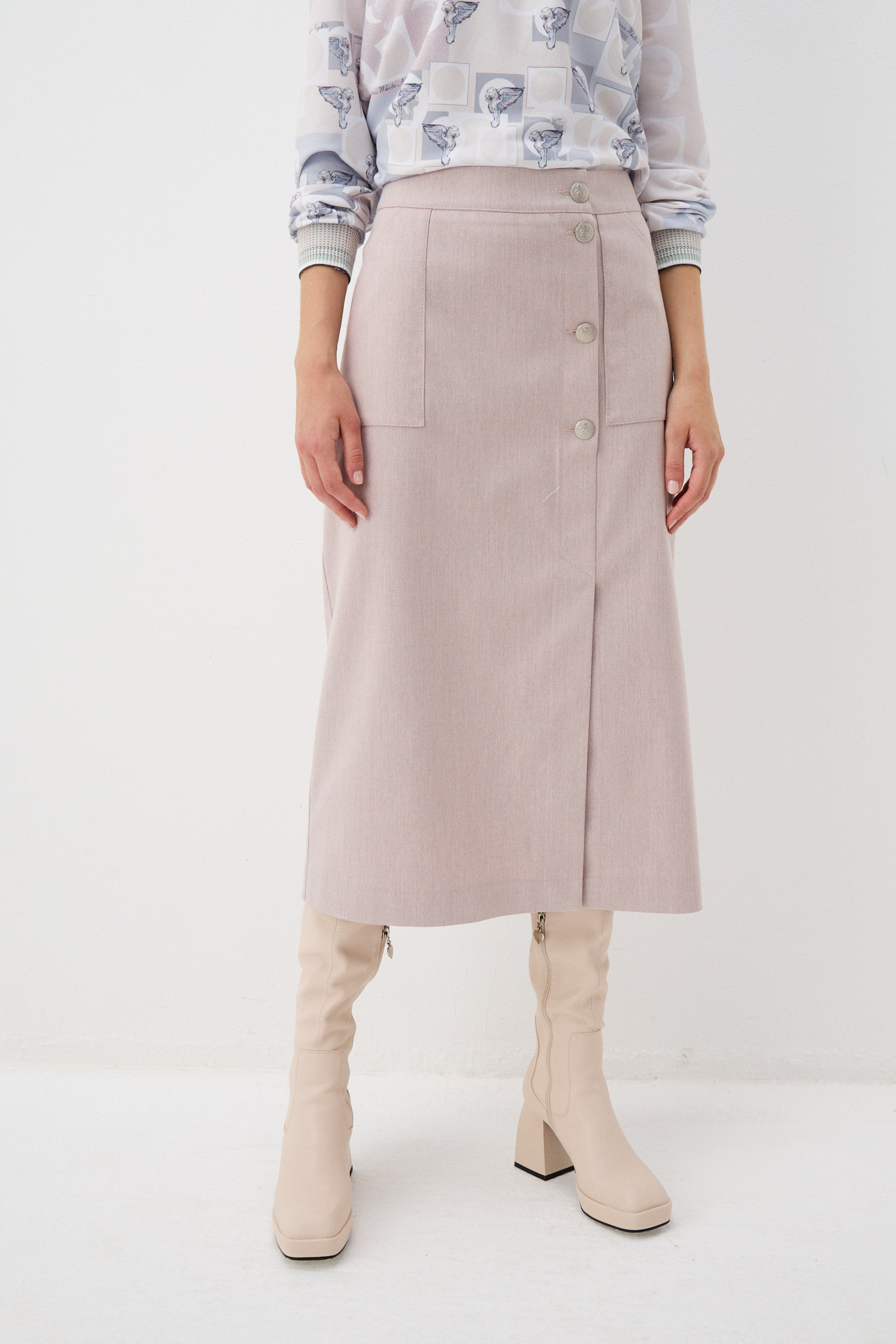 Юбка «Пастельное утро» - классика с интересными деталями. А-силуэт – создаёт гармоничные пропорции. По переду – ассиметрично расположенная высокая шлица для удобства движения, переходящая в застёжку. Вертикаль фактурных пуговиц подчеркнёт стройность ног. На прогулке, в университете, театре или офисе – юбка будет уместна везде.