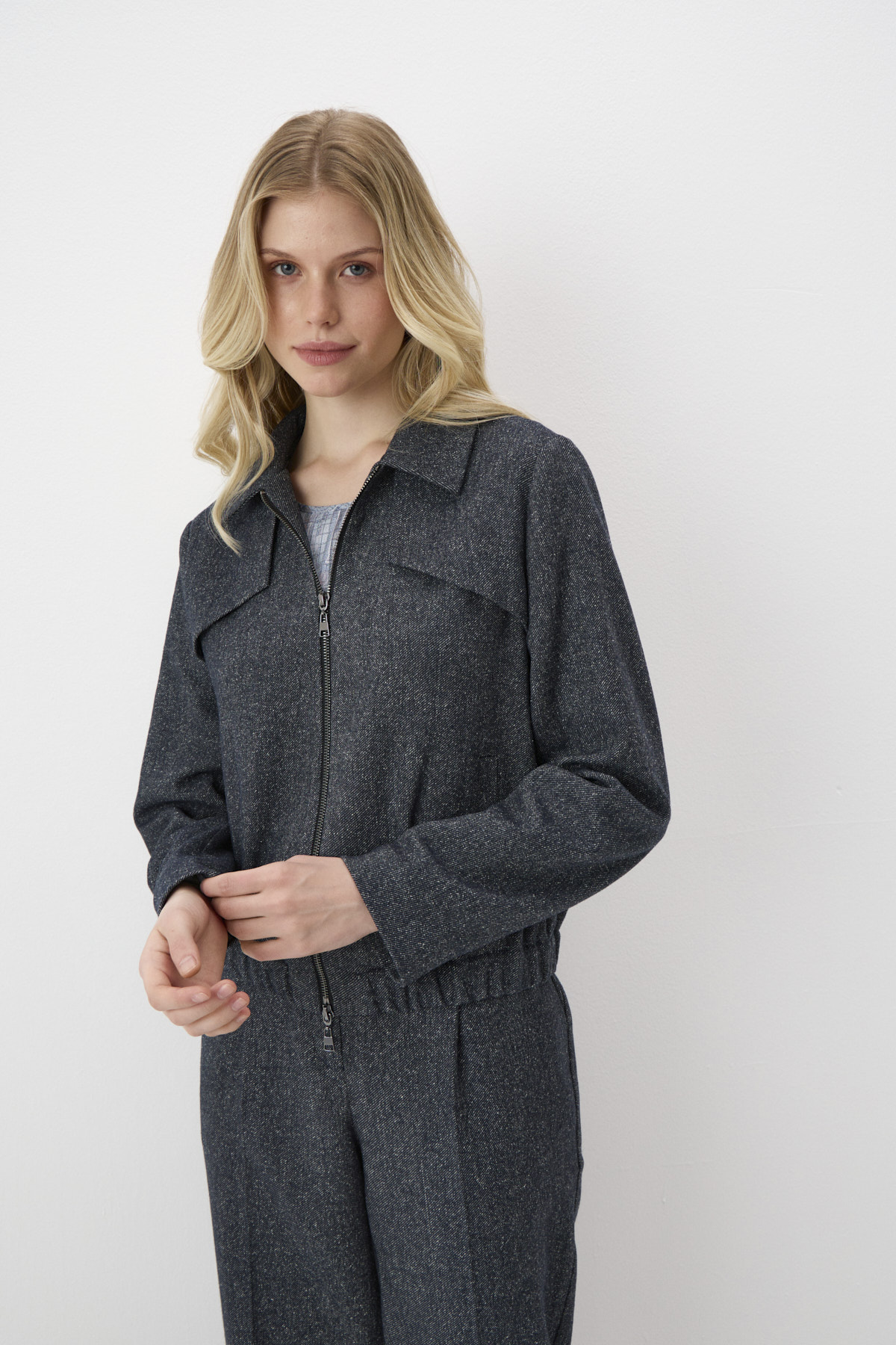 Укороченный жакет в тёмно-сером оттенке из костюмной ткани смешанного состава с добавлением натуральных волокон шерсти и шёлка. Меланжевая фактура ткани выглядит стильно и одновременно обеспечивает практичность. Жакет дополнен подкладом из тактильно приятной ткани, на которую нанесён авторский принт. Рубашечный воротник подчёркивает черты лица и придаёт образу элегантность. Оригинальная деталь – отлетные кокетки по переду – привлекает внимание. Застёжка на двустороннюю молнию из шлифованного металла.