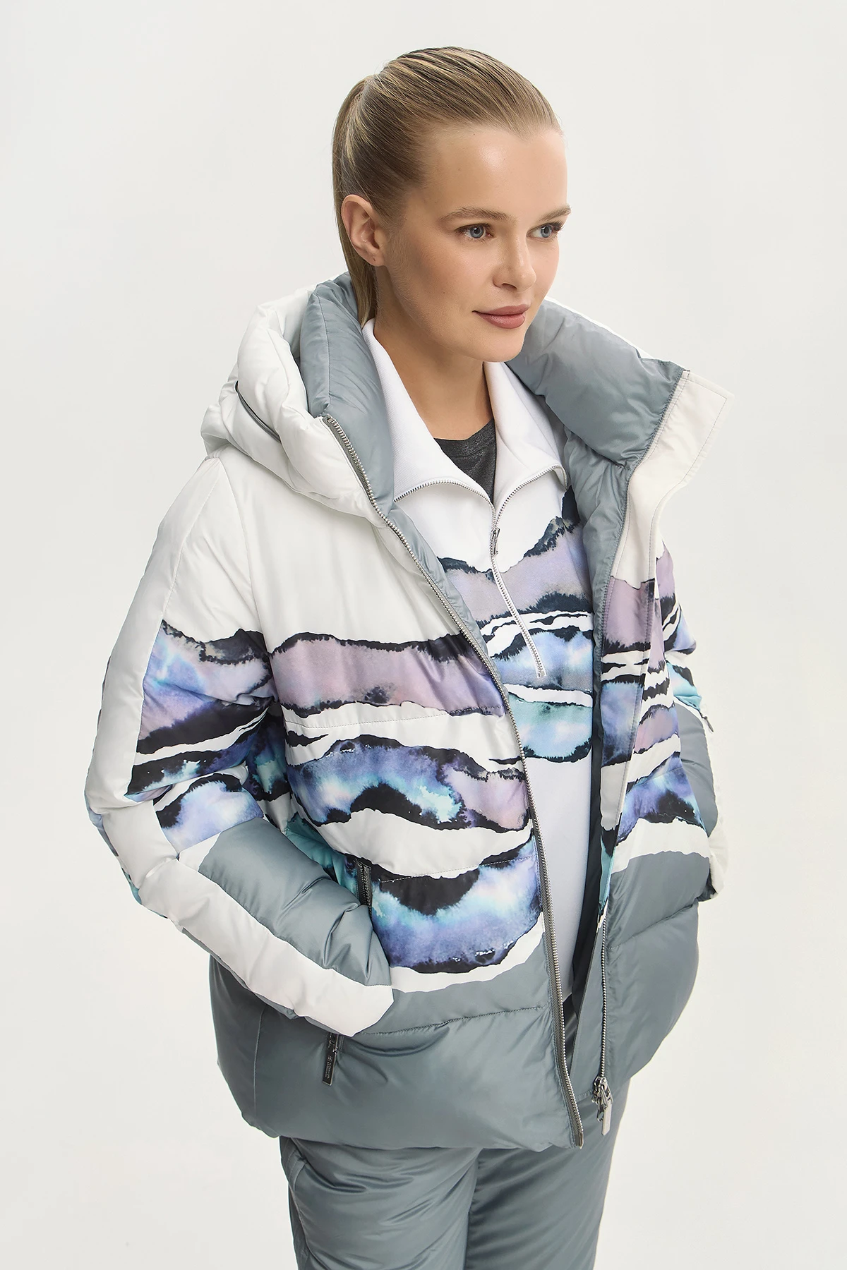 Куртка с авторским принтом — дизайнерская акцентная вещь в гардеробе, создающая художественное впечатление. Тёплый объёмный капюшон защищает от ветра и холода, эластичные регуляторы позволяют варьировать посадку. Модель тёплая и лёгкая — подходит как для городских прогулок, так и для активных выходов за пределы города. Куртка дополнена комфортными карманами.