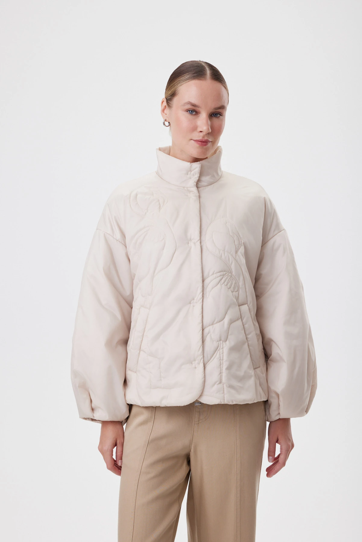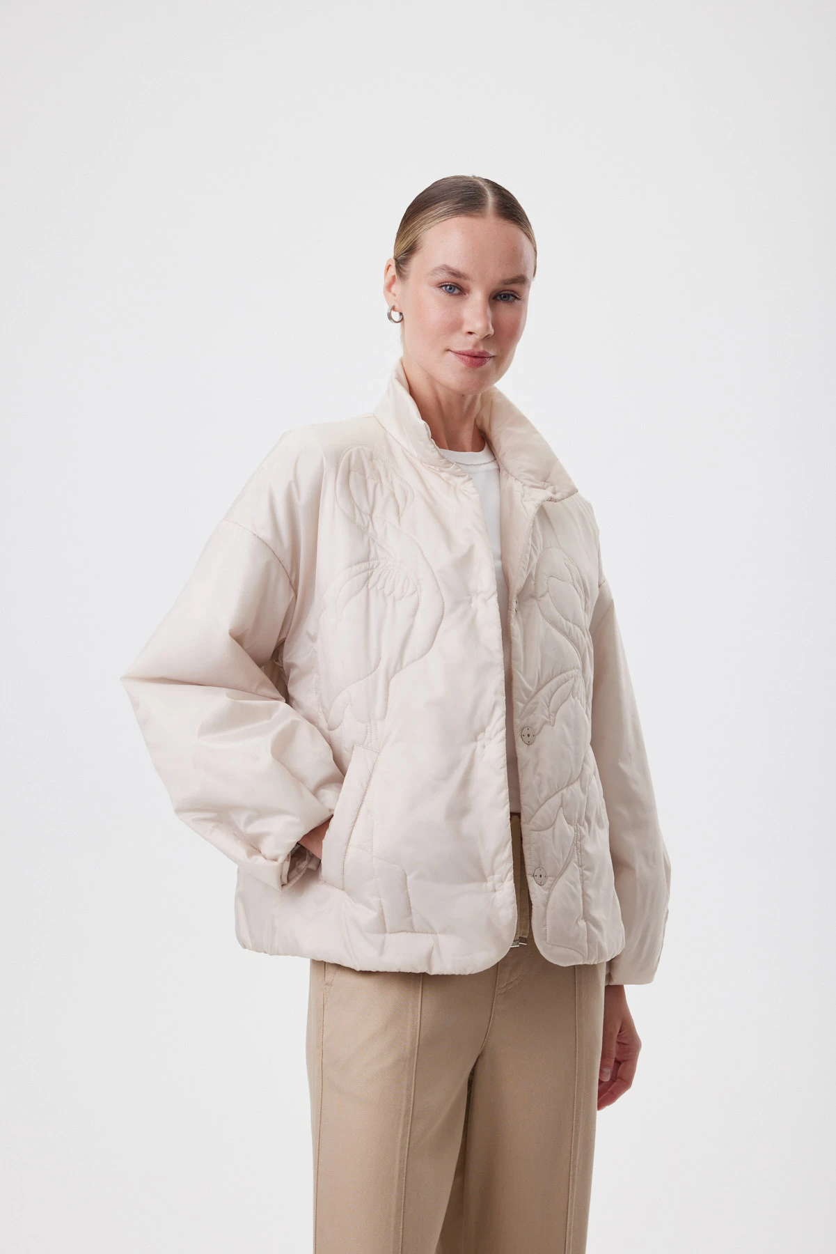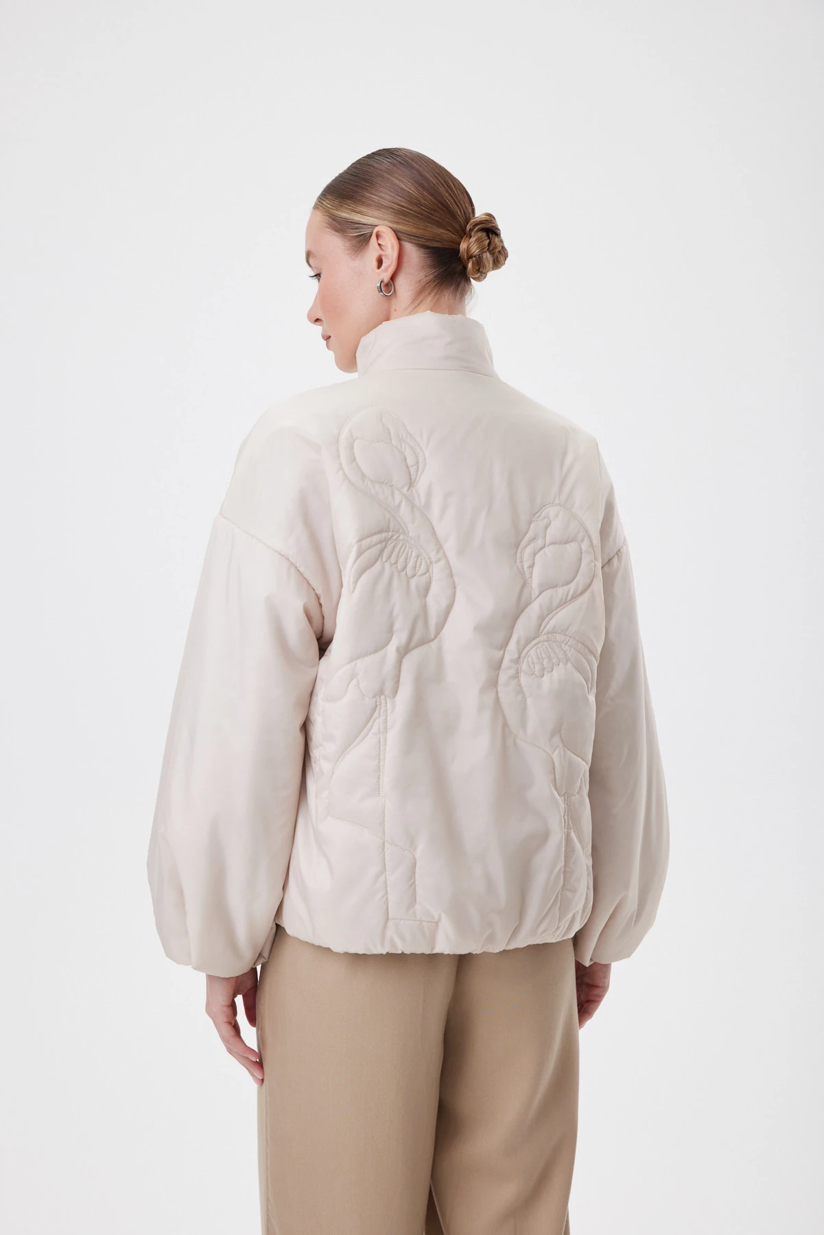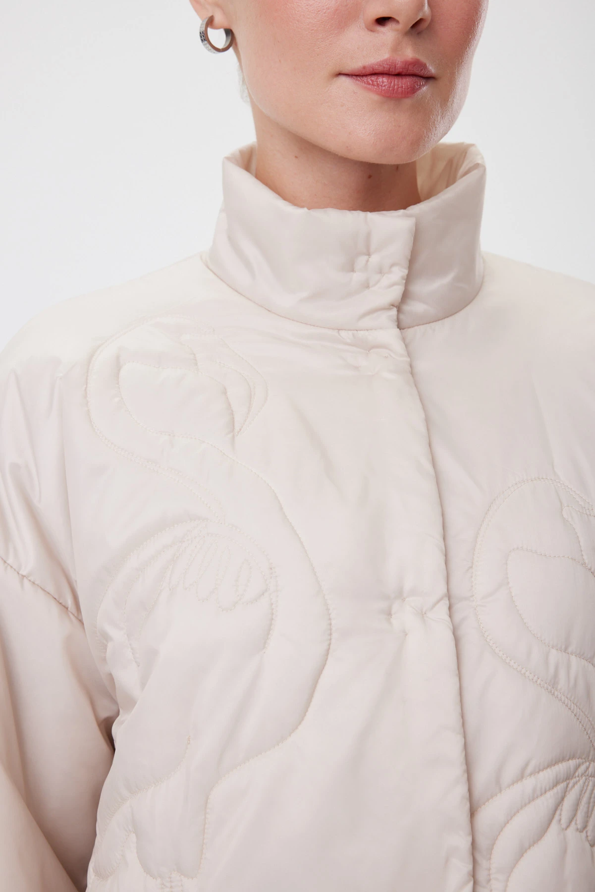 Бежевая куртка со стойкой и сложной объёмной стёжкой выглядит мягко и благородно: нити подобраны в тон, а вышивка со смещением создаёт ощущение лёгкого движения — женственно и без лишних акцентов. Лаке со слегка сатиновой поверхностью даёт «пухлую» фактуру, ткань пластичная, приятная на ощупь и совсем не шуршит. Силуэт вдохновлён лёгкой фуфайкой, но переосмыслен современно: спущенное плечо формирует мягкий контур, стойка добавляет собранности, а округлая линия борта делает образ цельным и аккуратным. Внутри — утеплитель Isosoft: воздушный, пластичный, удерживает тепло без лишнего объёма и сохраняет ровную форму. Завершает модель авторская подкладка с графичным рисунком на тон светлее — «секретная» деталь, которая даёт ощущение внутреннего свечения и премиальности.