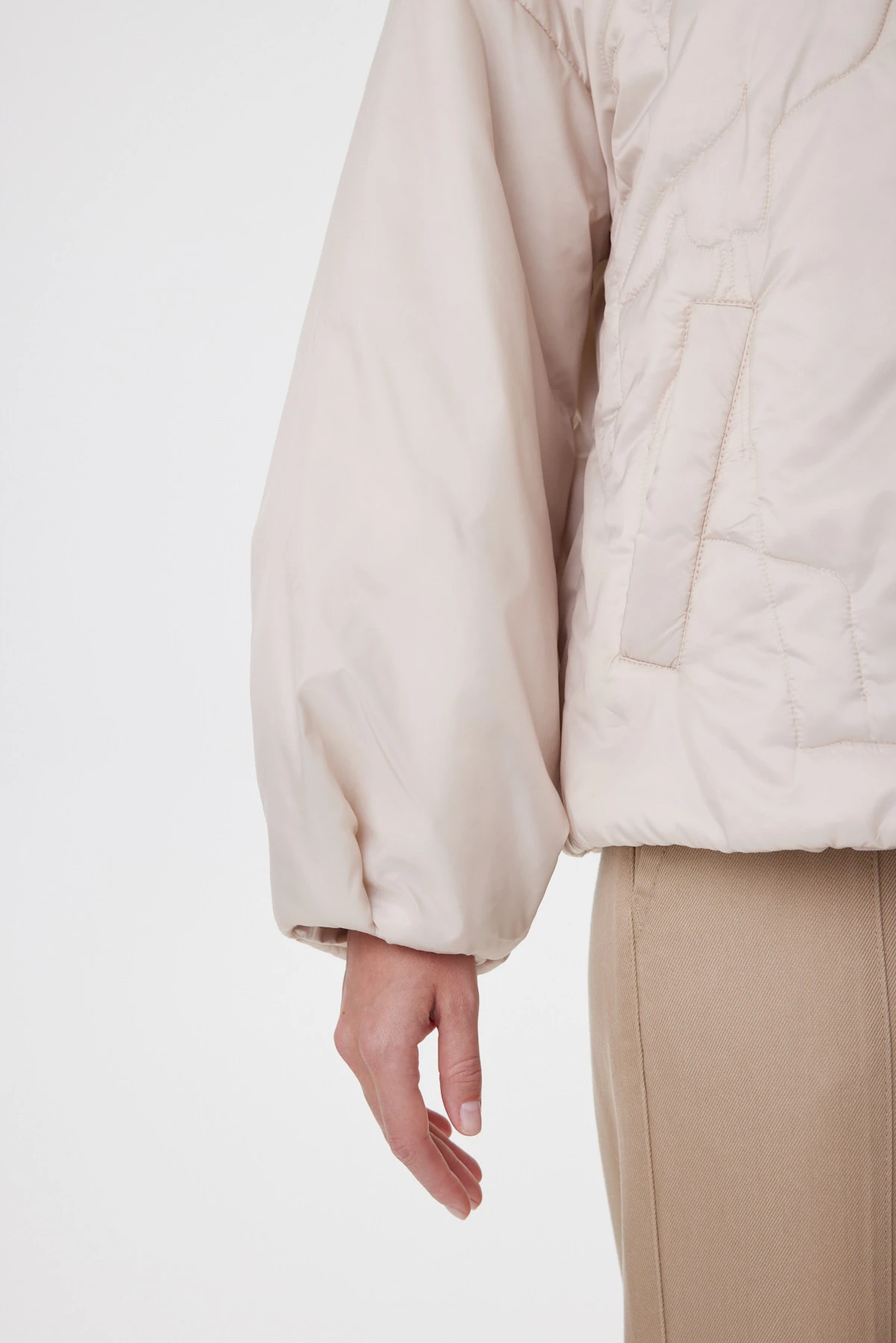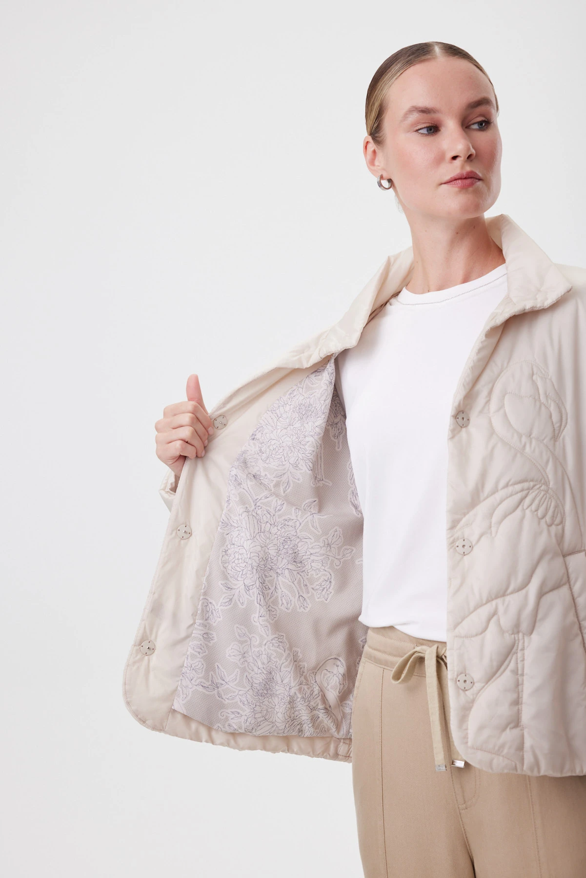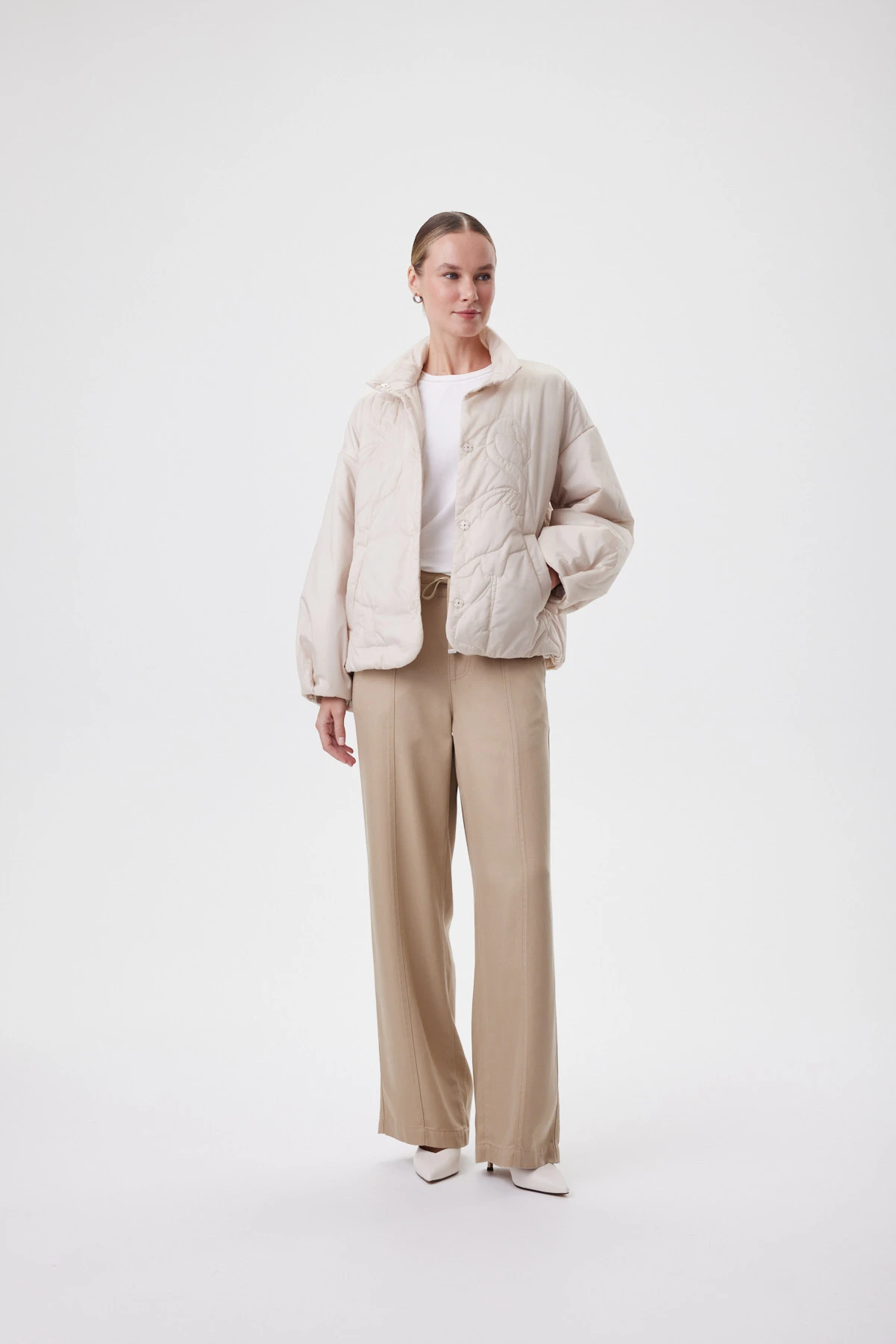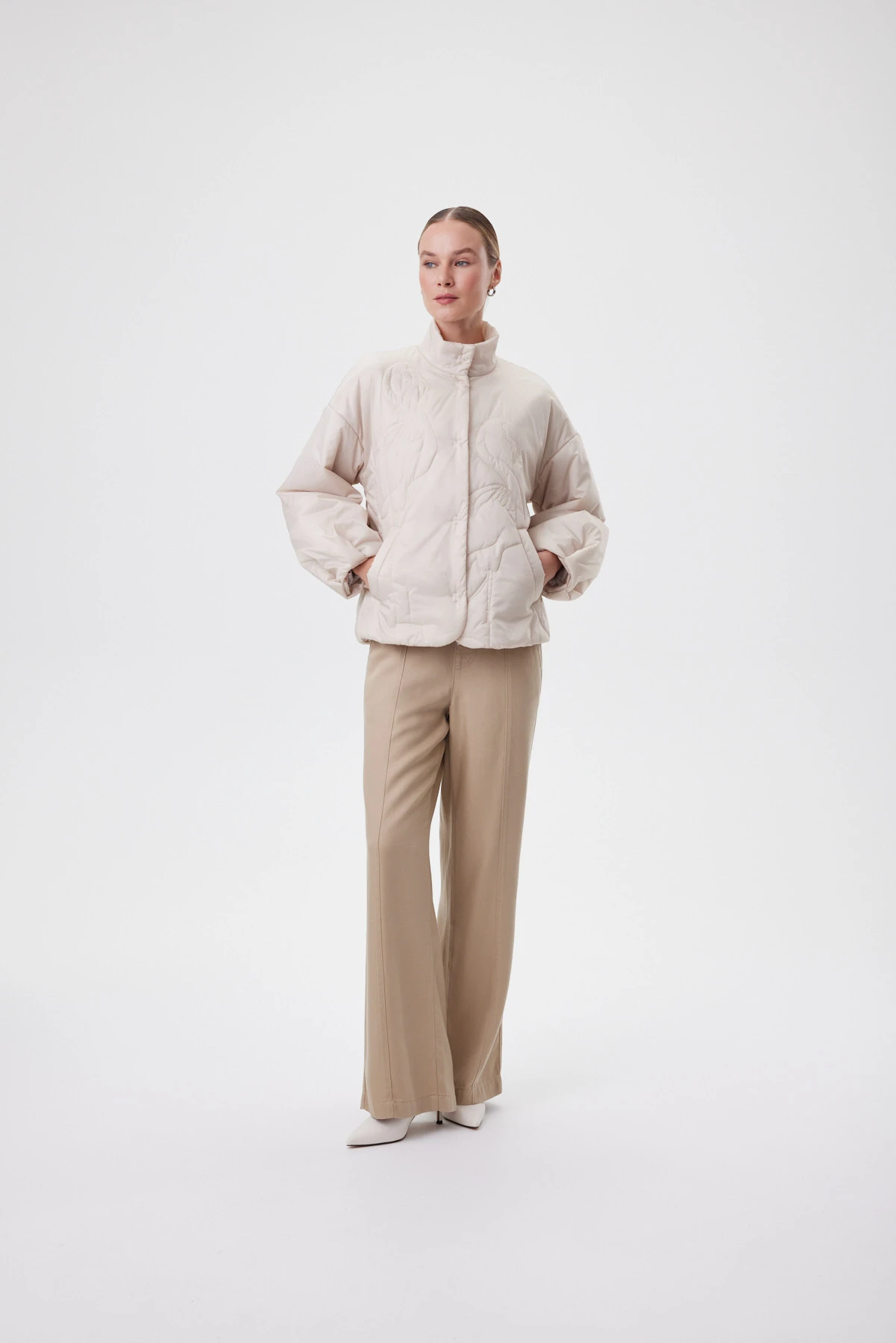 Бежевая куртка со стойкой и сложной объёмной стёжкой выглядит мягко и благородно: нити подобраны в тон, а вышивка со смещением создаёт ощущение лёгкого движения — женственно и без лишних акцентов. Лаке со слегка сатиновой поверхностью даёт «пухлую» фактуру, ткань пластичная, приятная на ощупь и совсем не шуршит. Силуэт вдохновлён лёгкой фуфайкой, но переосмыслен современно: спущенное плечо формирует мягкий контур, стойка добавляет собранности, а округлая линия борта делает образ цельным и аккуратным. Внутри — утеплитель Isosoft: воздушный, пластичный, удерживает тепло без лишнего объёма и сохраняет ровную форму. Завершает модель авторская подкладка с графичным рисунком на тон светлее — «секретная» деталь, которая даёт ощущение внутреннего свечения и премиальности.