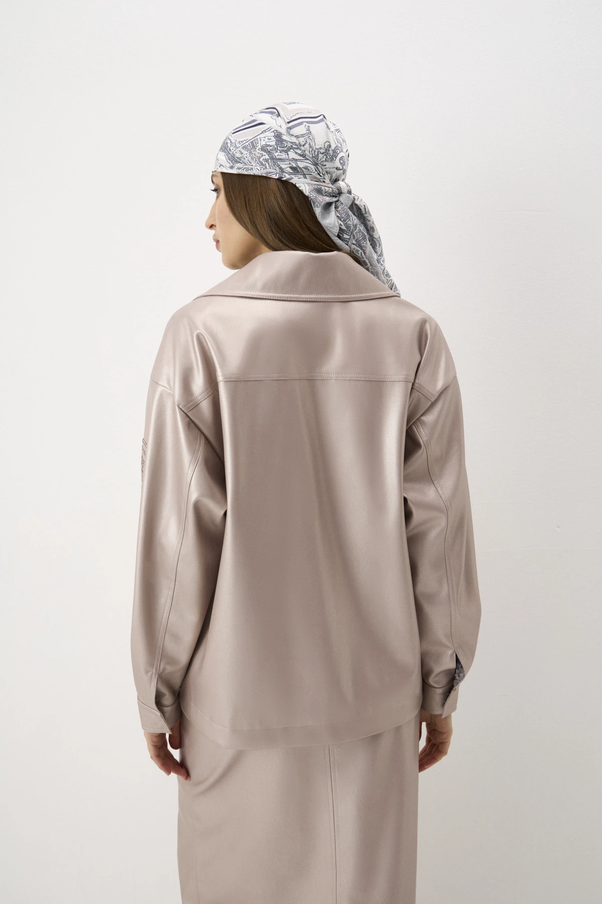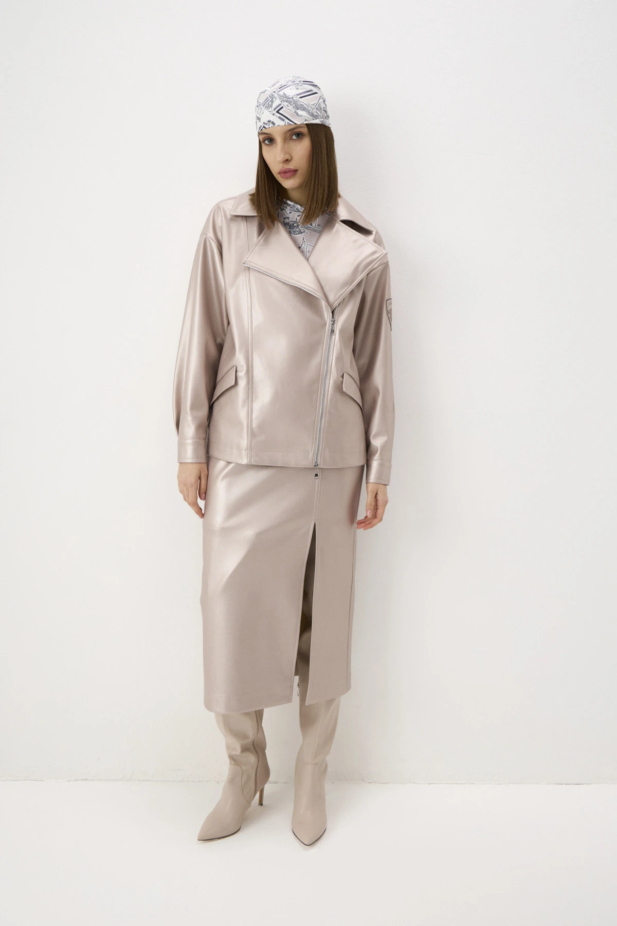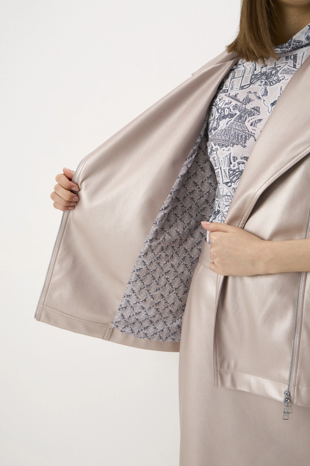 воротник. Куртка выполнена из мягкой плотной практичной экокожи в пудровом оттенке с перламутровым переливом. На левом рукаве – авторский шеврон с изображением одного из символов коллекции – кареты – и надписью «Saint-Petersburg». Двусторонняя застёжка-молния из белого металла и манжеты рукавов застёгиваются на кнопки. Куртка дополнена брендированным подкладом.