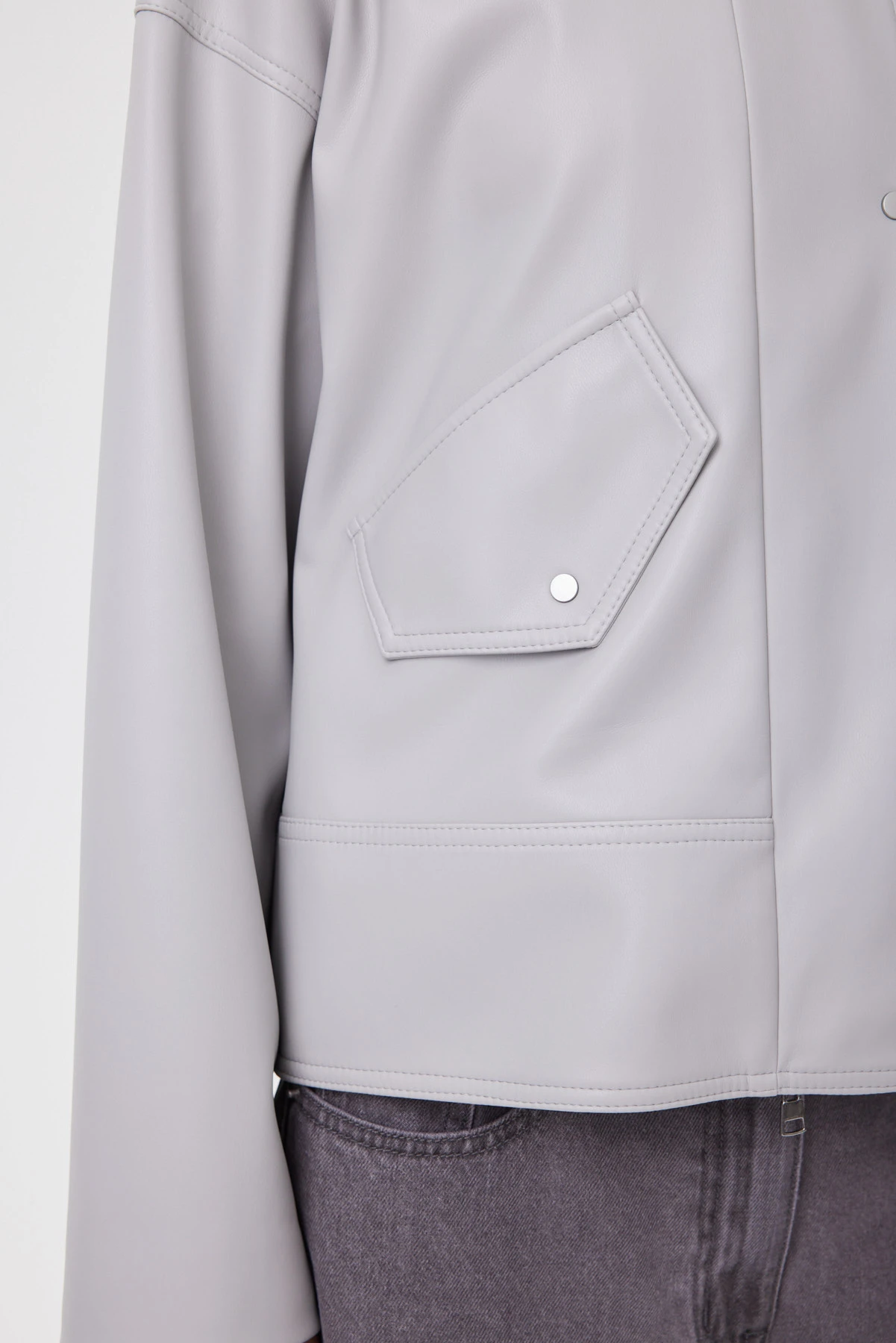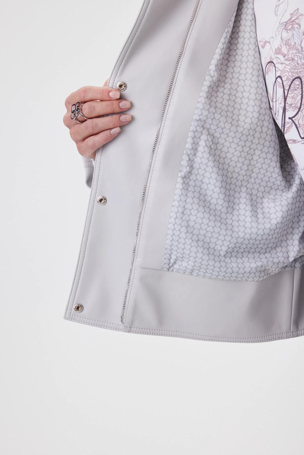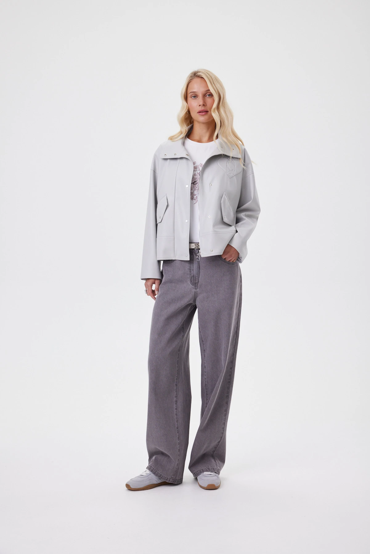 Графитовая куртка — современная классика с характером: сдержанная, но выразительная. На фоне строгого оттенка особенно эффектно звучит акцентный шеврон спереди справа — объёмное сердце с вышитым фламинго, как тонкий знак эмоций внутри минимализма. Воротник-стойка и крупные клапаны формируют собранный силуэт, а спущенное плечо и свободный рукав делают посадку комфортной и непринуждённой. Материал куртки — новая генерация экокожи, далёкая от стереотипов «плёнки» и дерматина. Материал не перегревается, приятен в носке в городе и в поездках, а подкладка с сердечным принтом добавляет образу романтики.