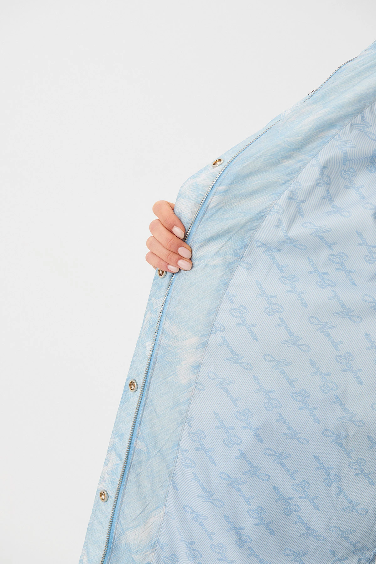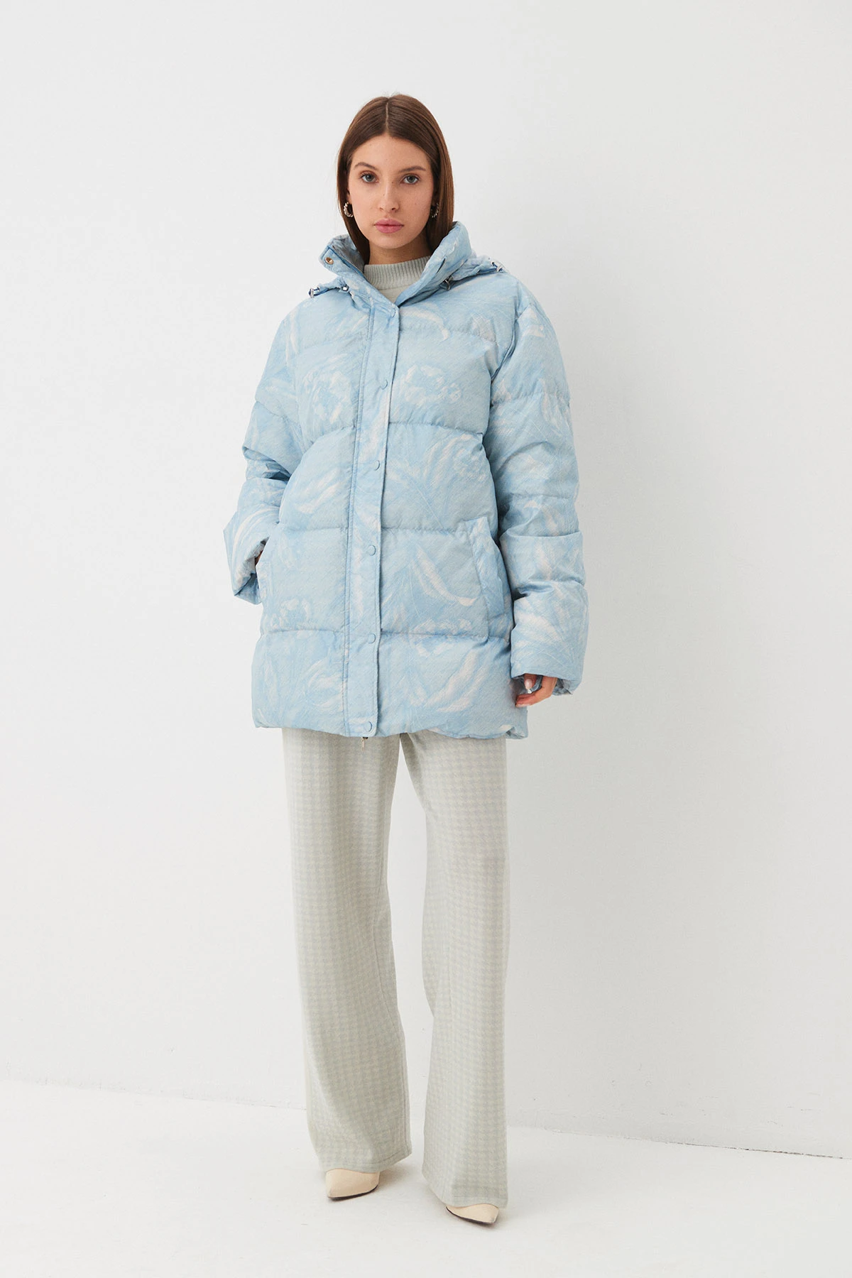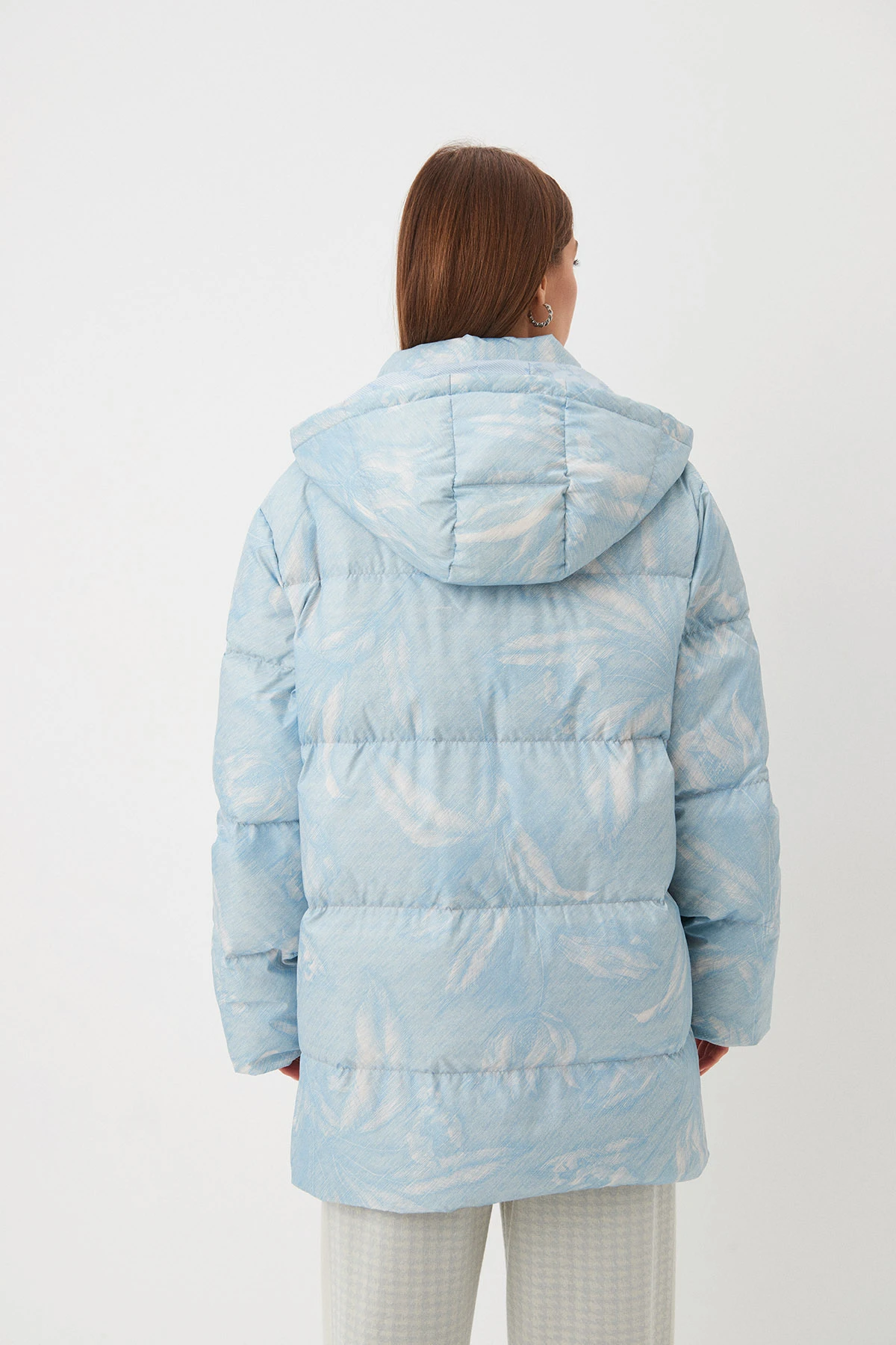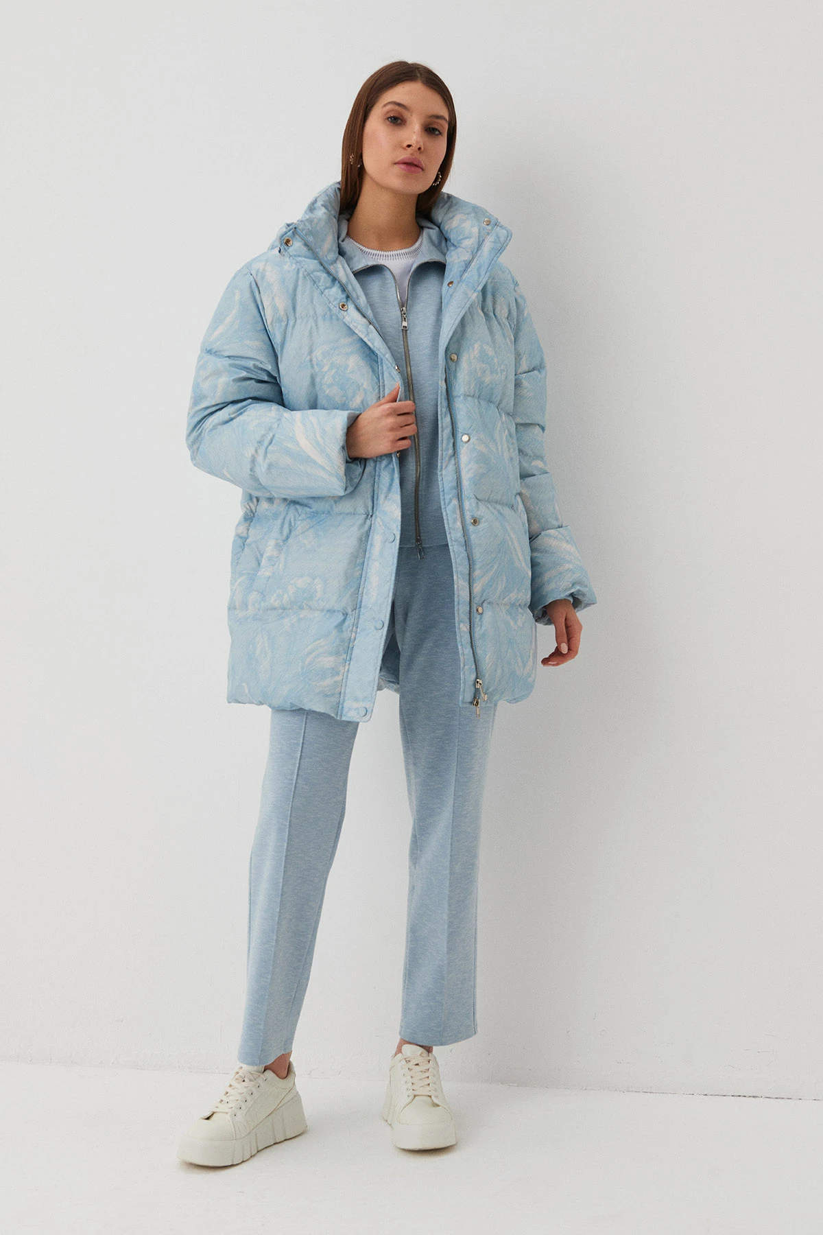 Ткань:Новинка! Пуховик выполнен из высококачественного практичного стёганого лаке, защищающего от ветра и дождя, и утеплён новым для бренда материалом – смеси пуха и пера, благодаря чему пуховик лёгкий и хорошо защищает от холода. Авторский флоральный принт «Зимний вальс» изображает стилизованные тюльпаны в небесно-голубых оттенках.