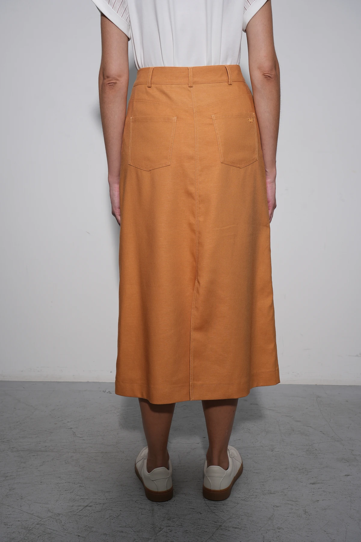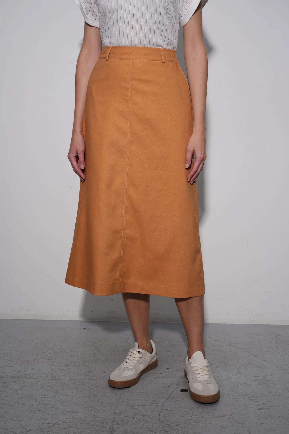 Юбка миди А-силуэта в шафрановом оттенке – стильное и практичное решение. Смесь фактурного льна, мягкой вискозы и прочного полиэстера обеспечивает комфорт, износостойкость и несминаемость. Лаконичная вышивка бабочки на накладном кармане и отстрочки по швам добавляют индивидуальности и расслабленной стилистики. Крой с кокеткой, накладными карманами и шлицей создает гармоничный силуэт. Потайная молния в боковом шве и шлевки на поясе обеспечивают удобство. Юбка легко впишется в casual образы, сочетаясь с топами и легкими блузами.