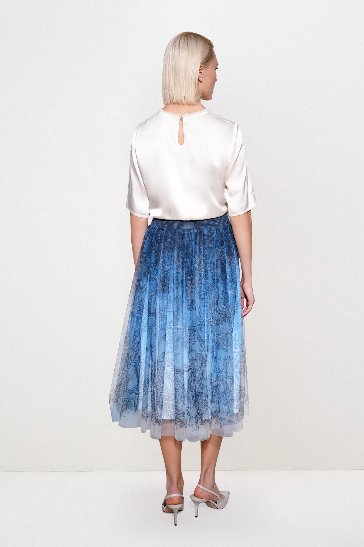 Юбка А-силуэта длины миди из воздушной сетки с авторским принтом на фоне цветовой растяжки в небесных оттенках. Принт пропитан ощущением прогулки по Петербургу, где каждый шаг напоминает о его великолепной истории. Особую игру света создаёт подклад, принт которого поддерживает цветовую растяжку основного принта и вертикаль, повторяющую складки. Пояс из трикотажной авторской бейки является не только функциональным элементом, обеспечивающим посадку, но и стильным акцентом.