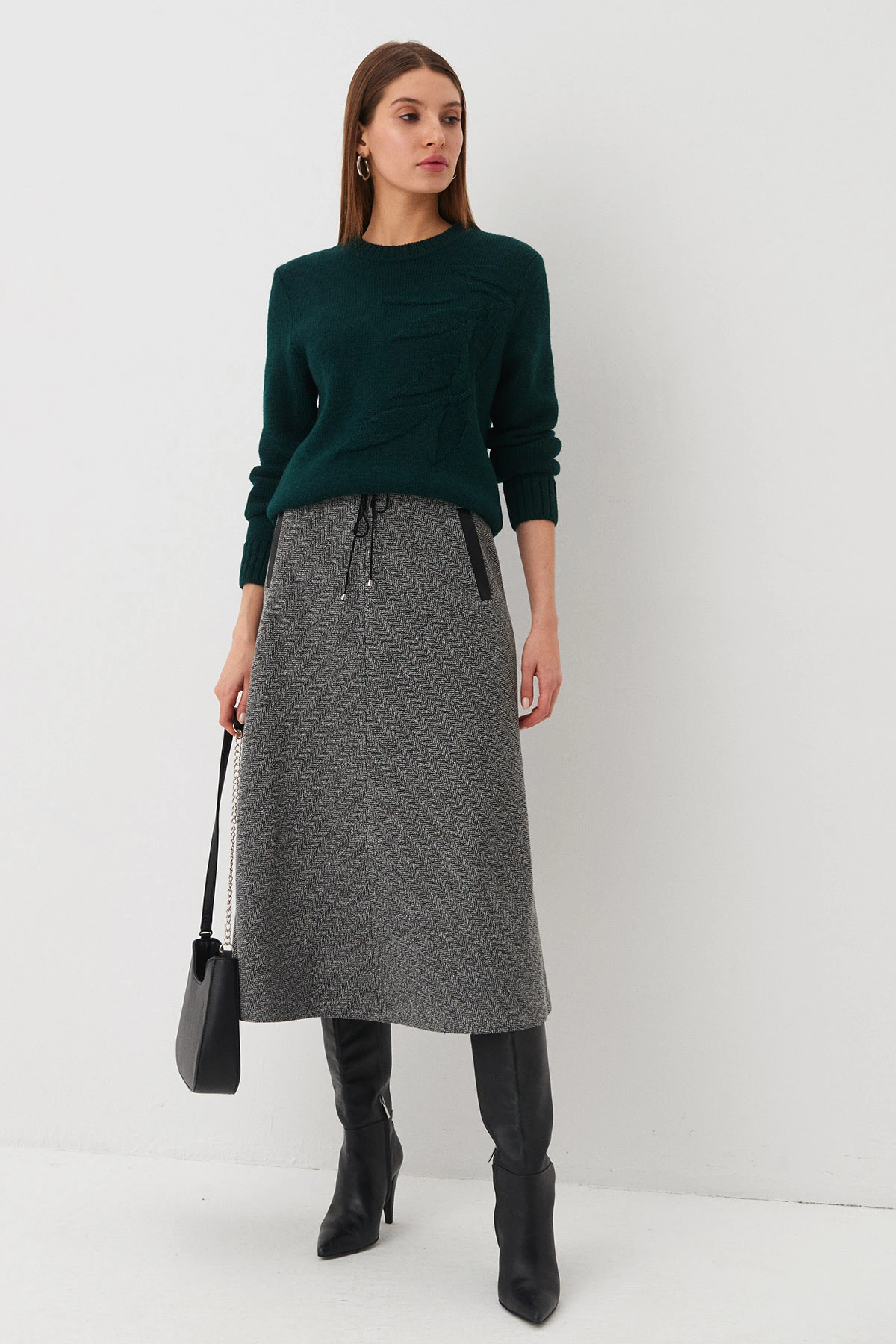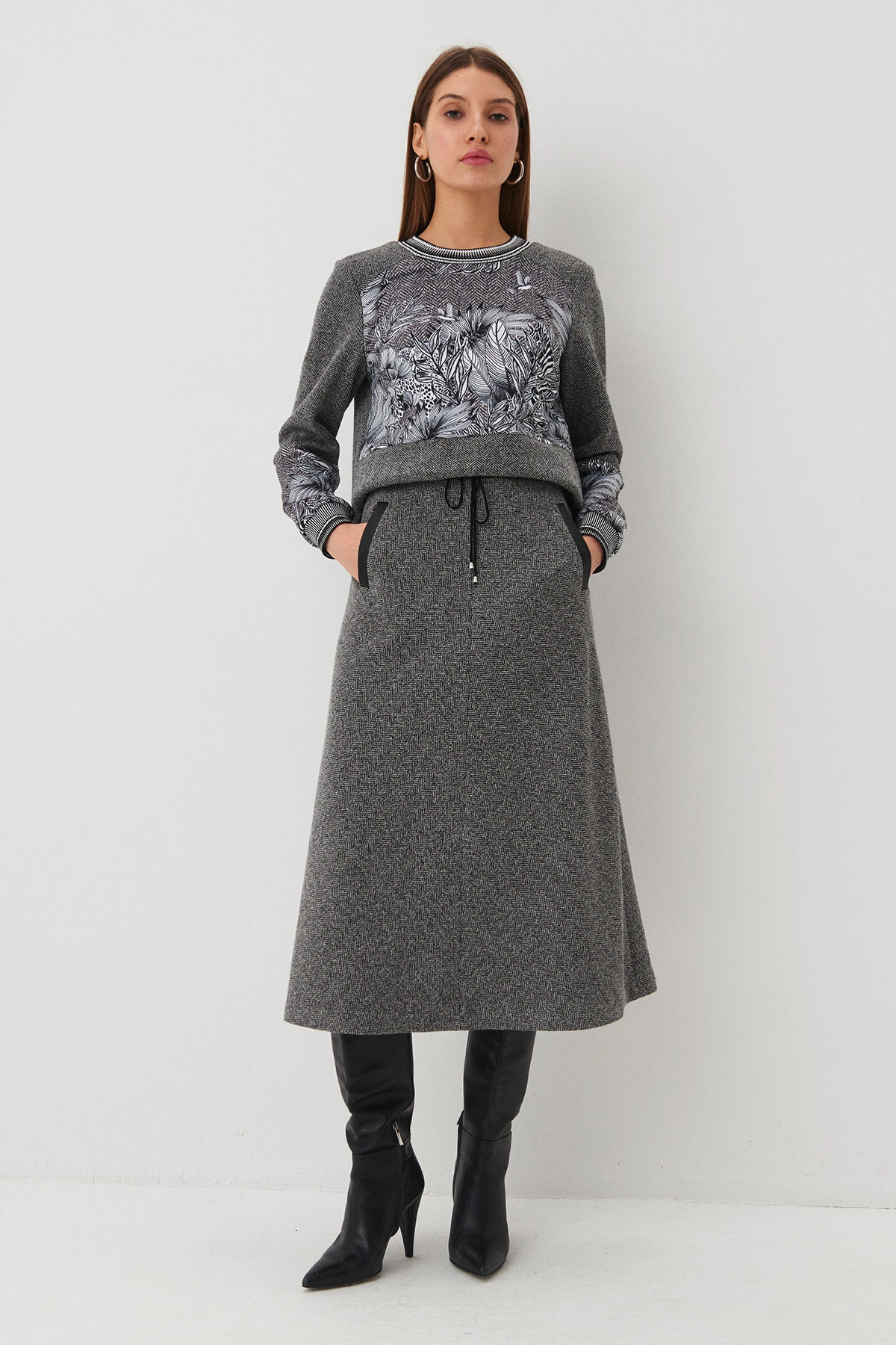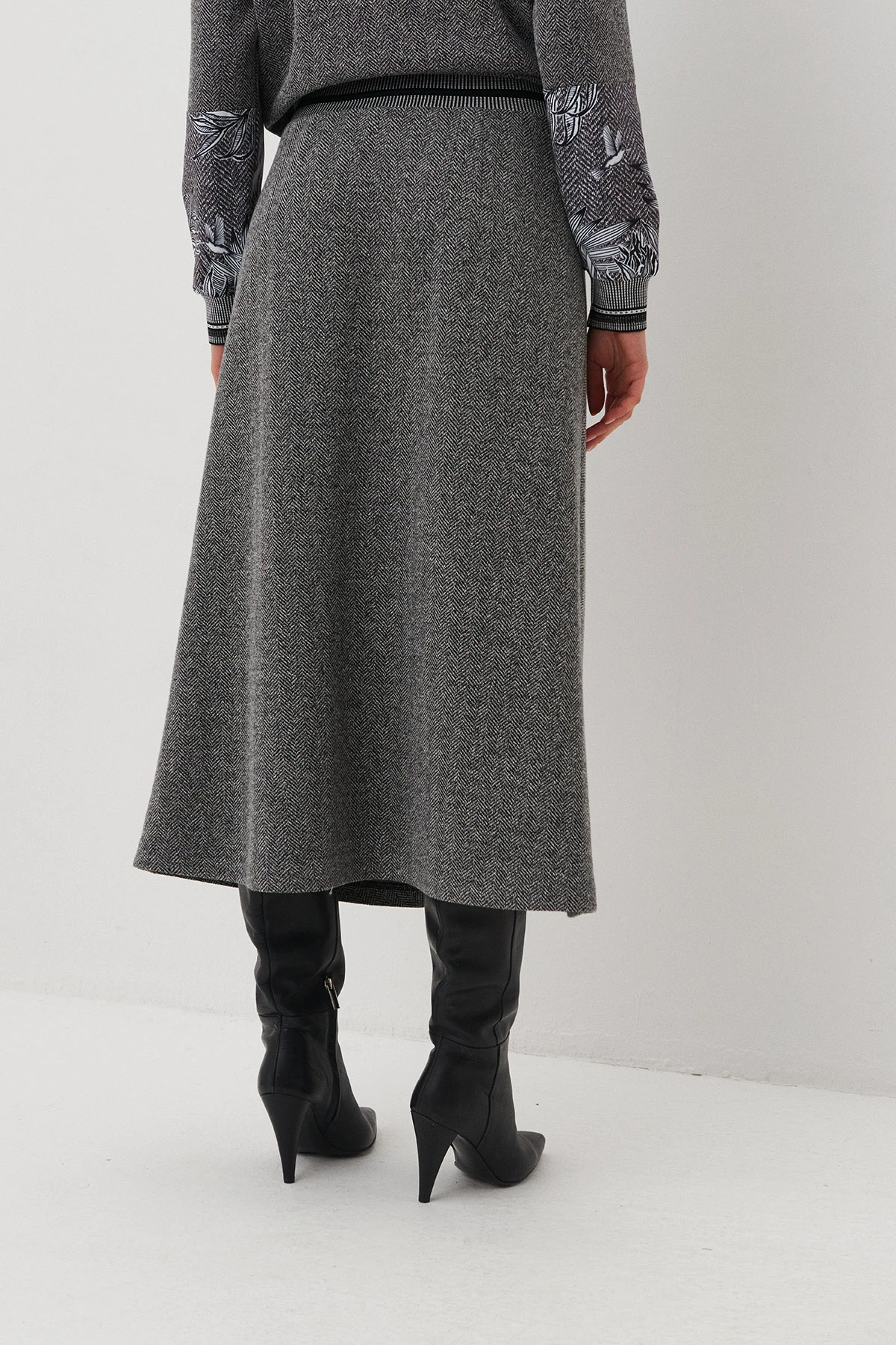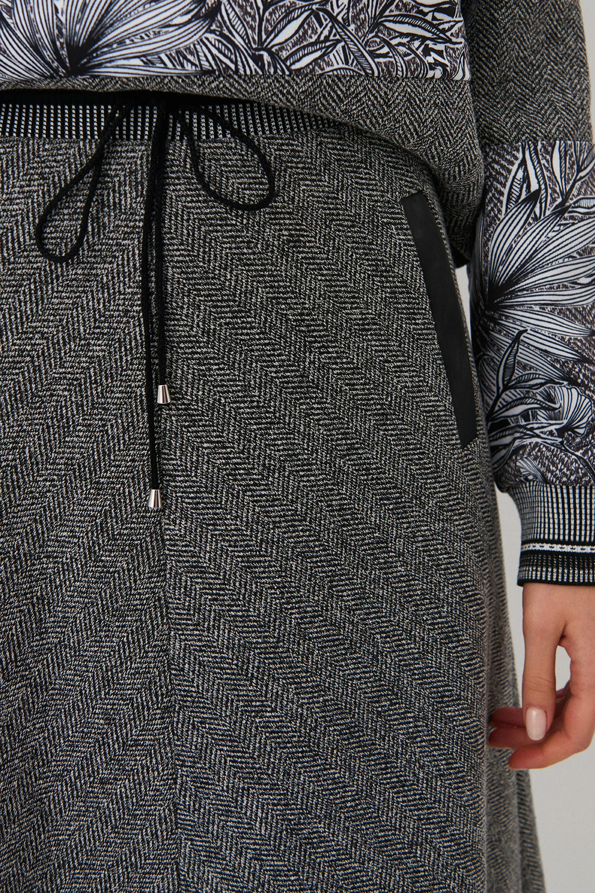 Ткань:Юбка из ткани смешанного состава на основе хлопка с раппортом «ёлочка» в ахроматических оттенках.