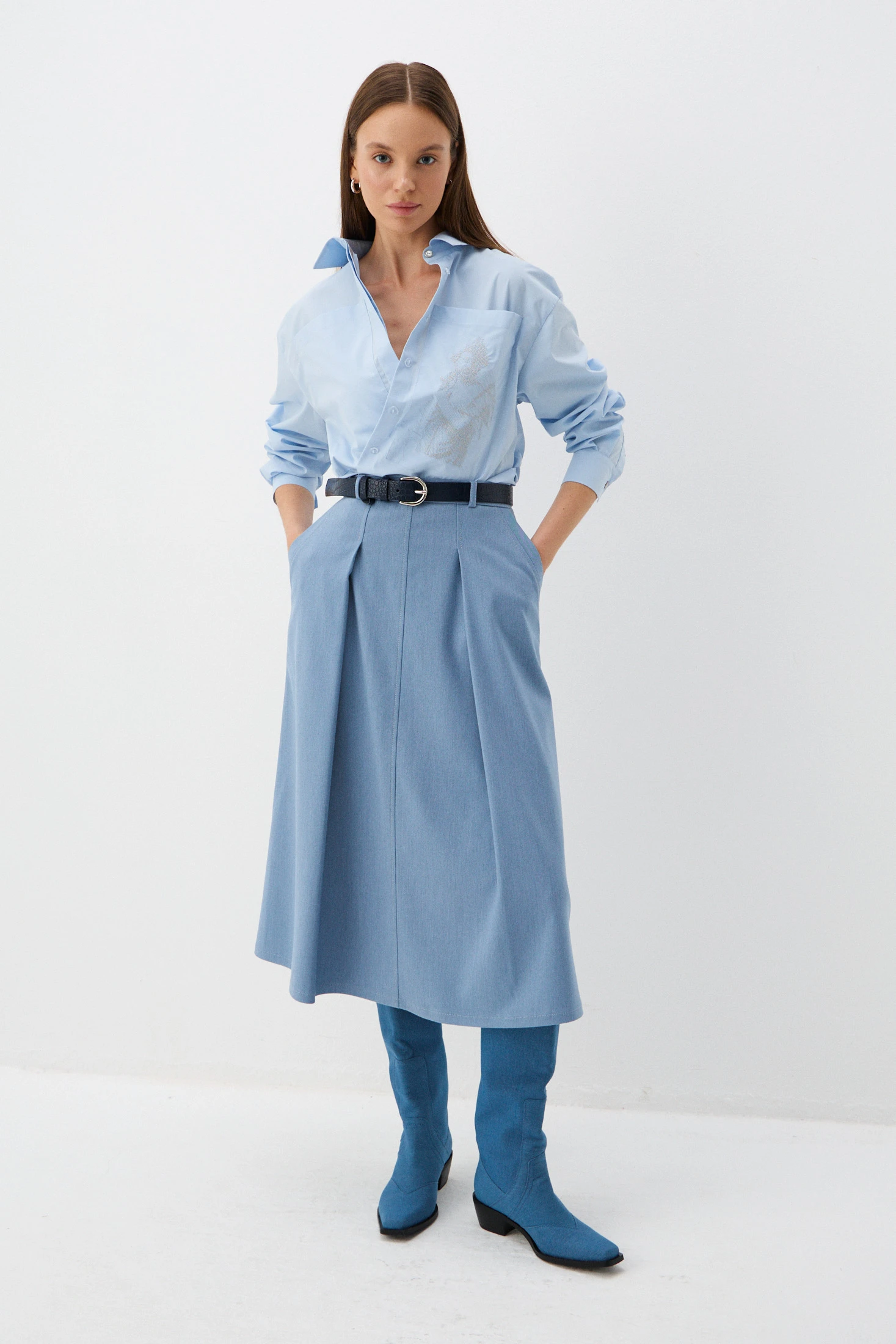 Новинка среди ассортимента юбок – женственный и элегантный стиль soft new look. Классический крой формирует силуэт, подчёркивающий достоинства фигуры. Важная деталь – притачной пояс – обеспечивает идеальную посадку, делая акцент на талии. По переду – вытачки, от которых заложены две складки, создающие женственный объём. Юбка «Новая Голландия» - классика на все времена.