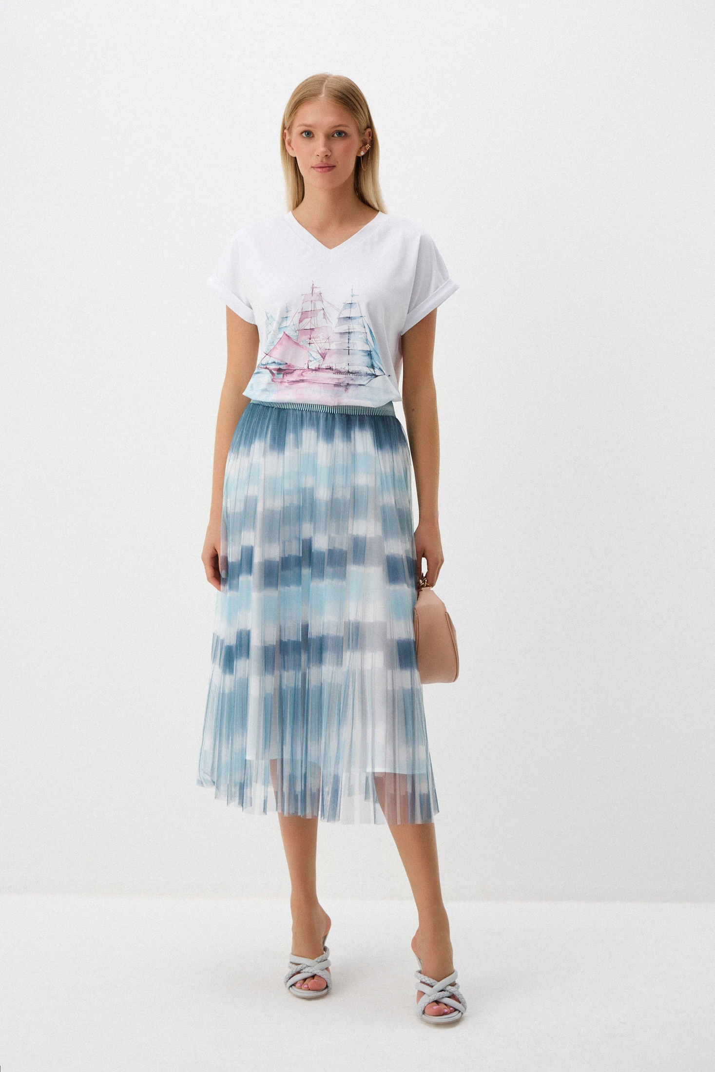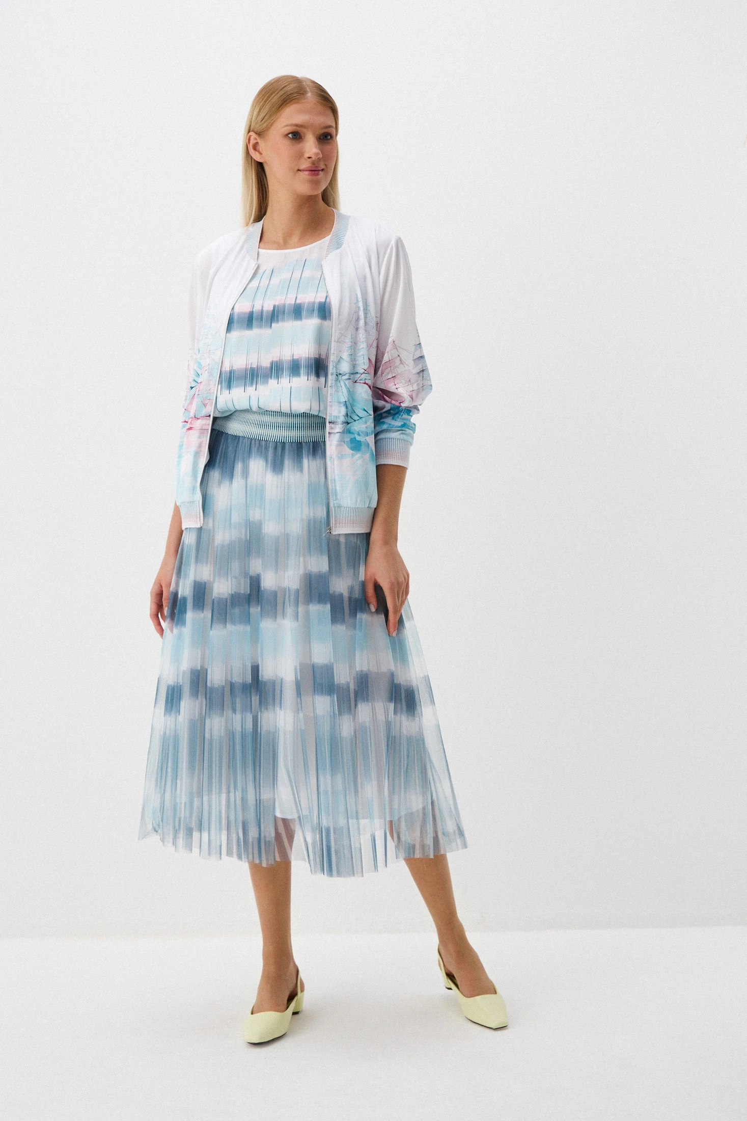 Воздушная юбка из сетки – классика бренда ALEXANDER BOGDANOV. Такая юбка подчёркивает женственность и утончённость – летящий силуэт придаёт необыкновенный флёр образу. Чередование полос морских оттенков и нейтрального «белый шёпот» в сочетании с односторонними складками добавляют воздушности. Стилистические вариации образов с юбкой безграничны – от спорт-шик до casual, от повседневного до романтического. Модель придётся по вкусу всем любительницам total look – завершите образ одноимённым топом или джемпером.