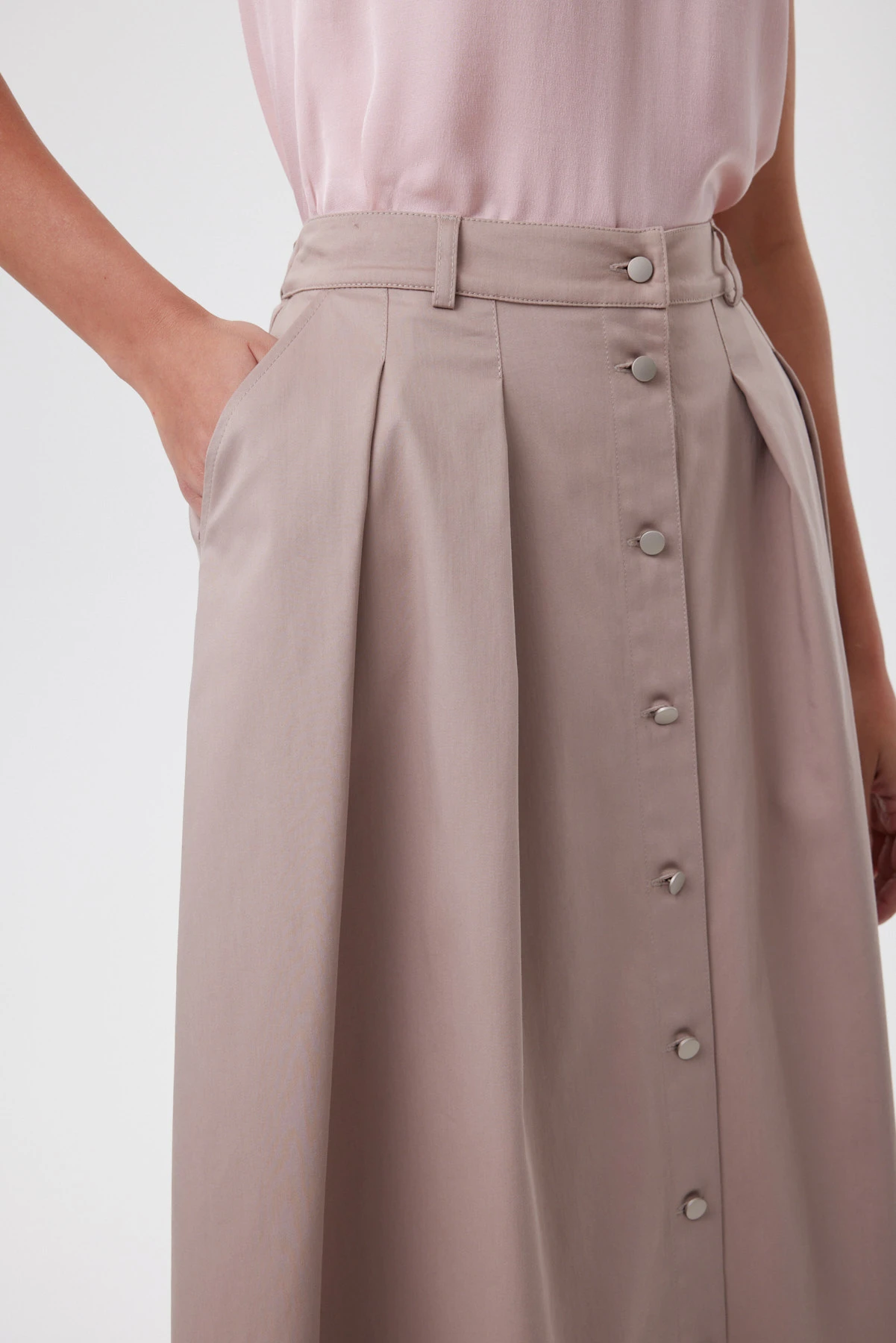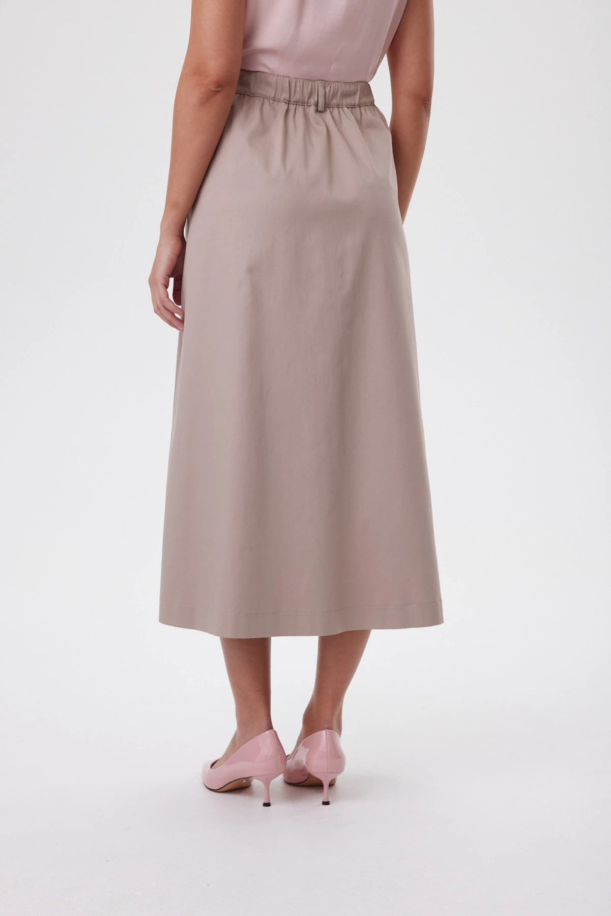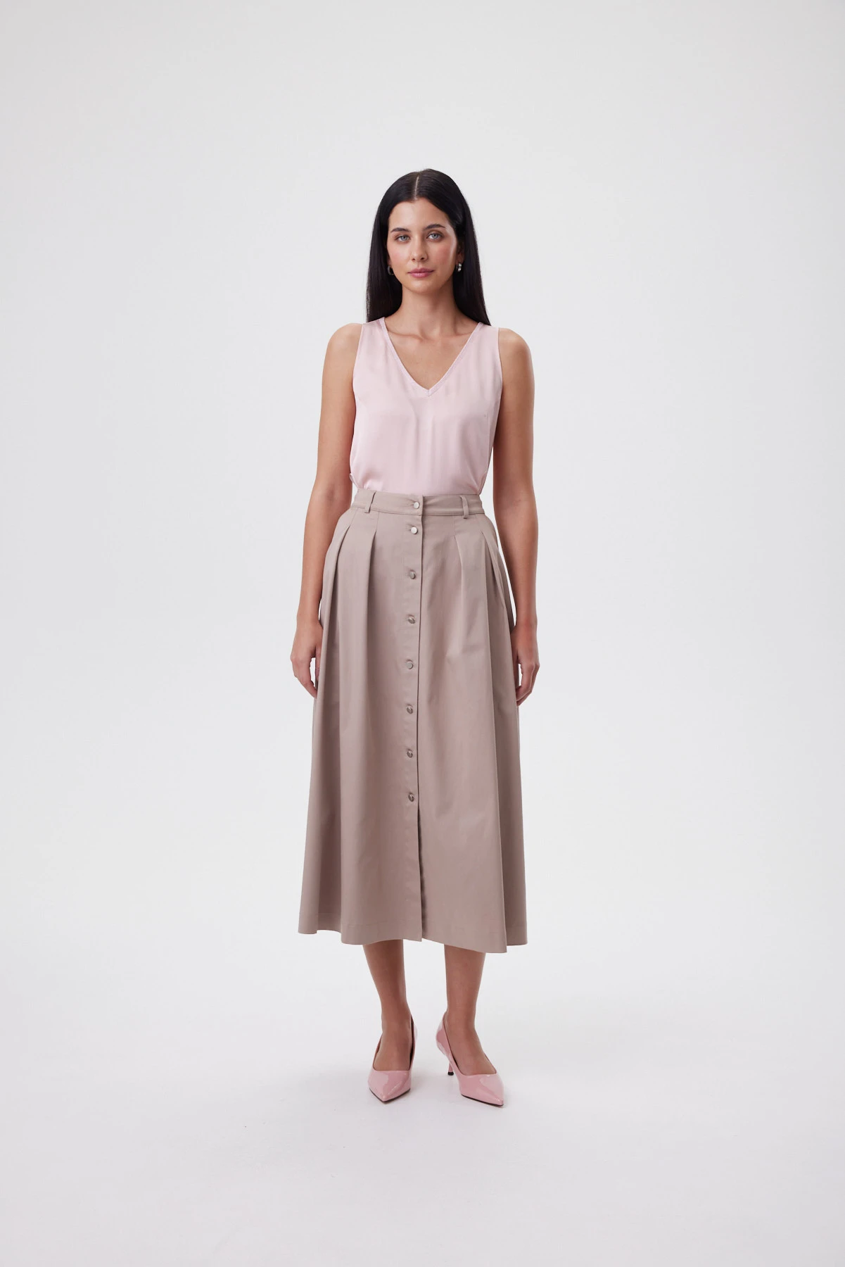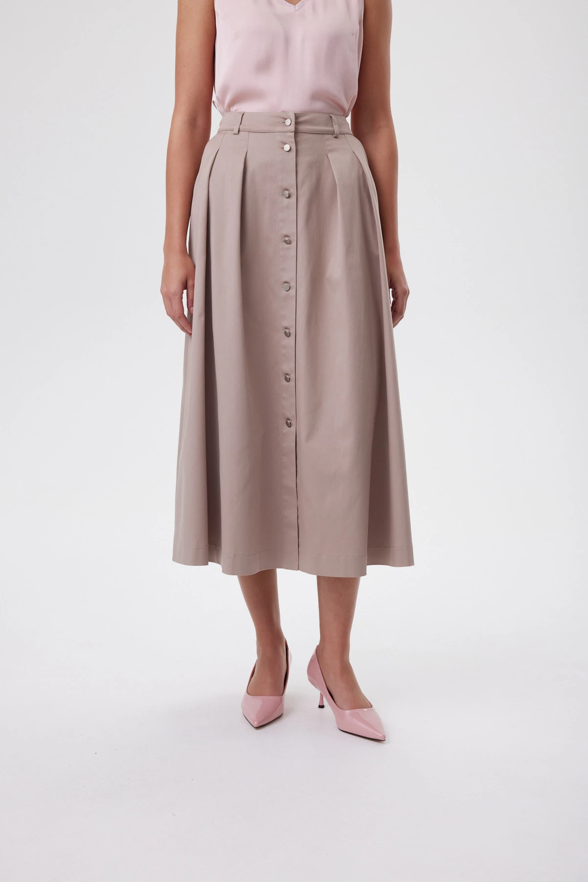 Юбка А-силуэта мягко ниспадает от талии, создаёт пространство и лёгкое движение при ходьбе. Две складки с каждой стороны фиксируют посадку — талия становится тоньше, а линия ног — длиннее. Сквозная застёжка на пуговицы добавляет графики и держит силуэт собранным, без «романтической» избыточности. Шлёвки дают возможность усилить талию ремнём или оставить образ мягким и расслабленным. Оттенок «миндальный нюд» работает как тёплый свет: освежает, и легко сочетается с белыми, шоколадными, денимом и чёрными акцентами.