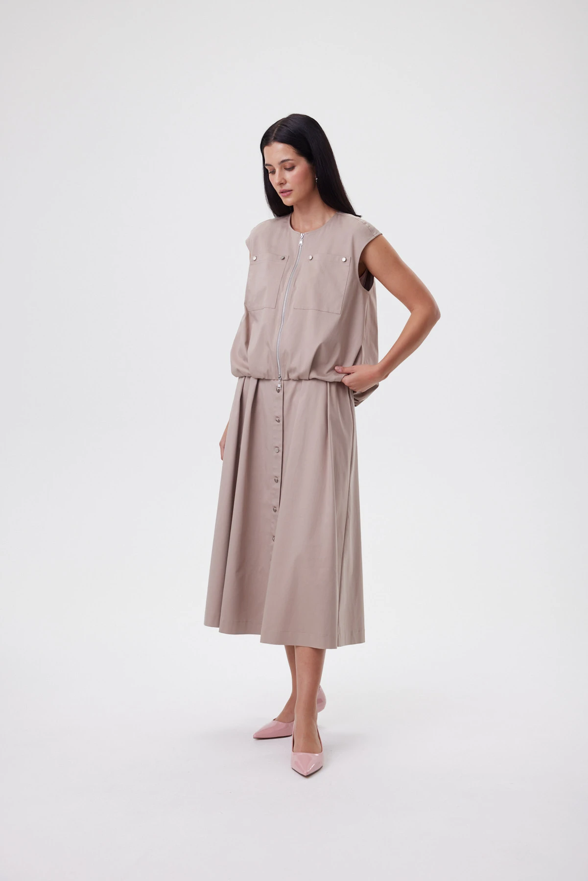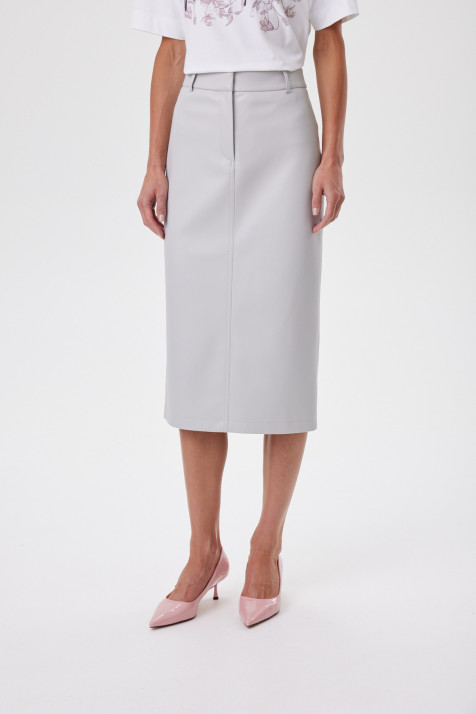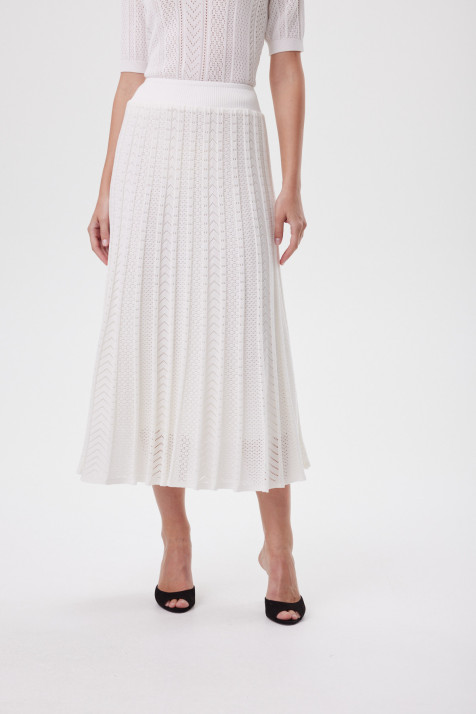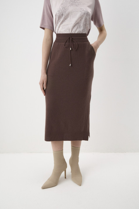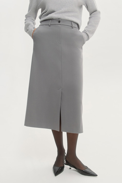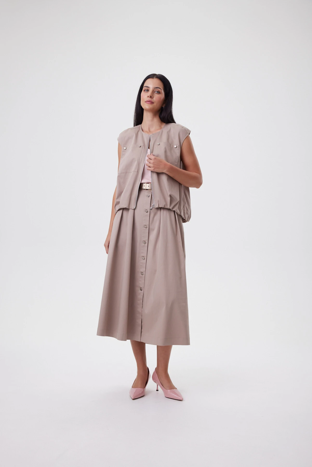 Юбка А-силуэта мягко ниспадает от талии, создаёт пространство и лёгкое движение при ходьбе. Две складки с каждой стороны фиксируют посадку — талия становится тоньше, а линия ног — длиннее. Сквозная застёжка на пуговицы добавляет графики и держит силуэт собранным, без «романтической» избыточности. Шлёвки дают возможность усилить талию ремнём или оставить образ мягким и расслабленным. Оттенок «миндальный нюд» работает как тёплый свет: освежает, и легко сочетается с белыми, шоколадными, денимом и чёрными акцентами.