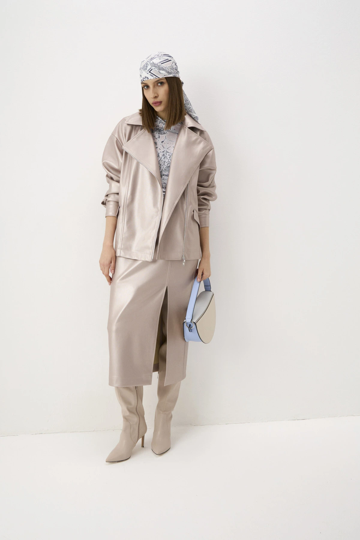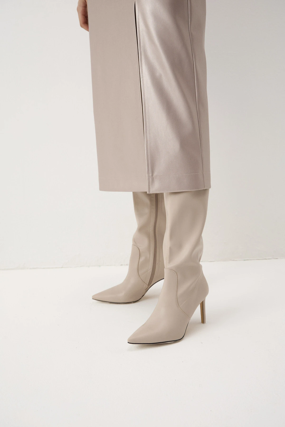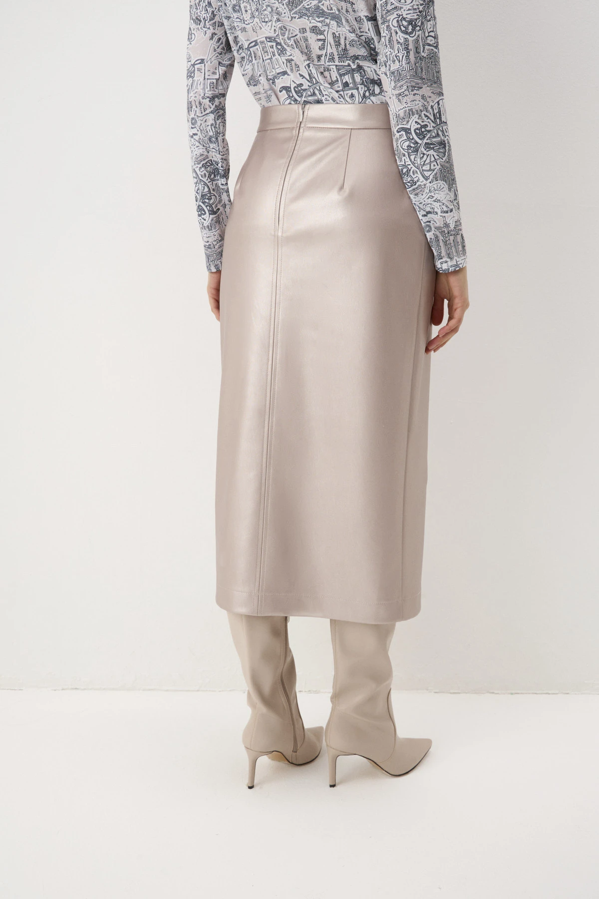 Прямая юбка длины миди из мягкой плотной практичной экокожи в пудровом оттенке с перламутровым переливом. Высокий разрез обеспечивает комфорт в движении и придаёт нотку игривости. По переду – декоративная отстрочка, имитирующая карманы. Притачной пояс обеспечивает фиксацию юбки на талии. Застёжка на молнию.