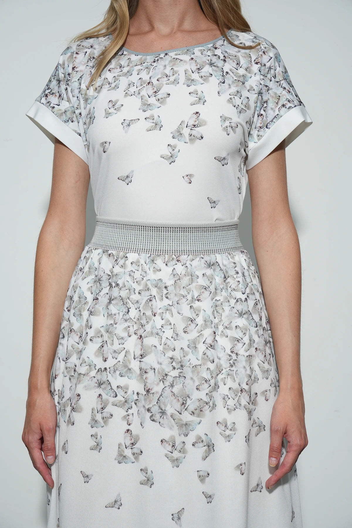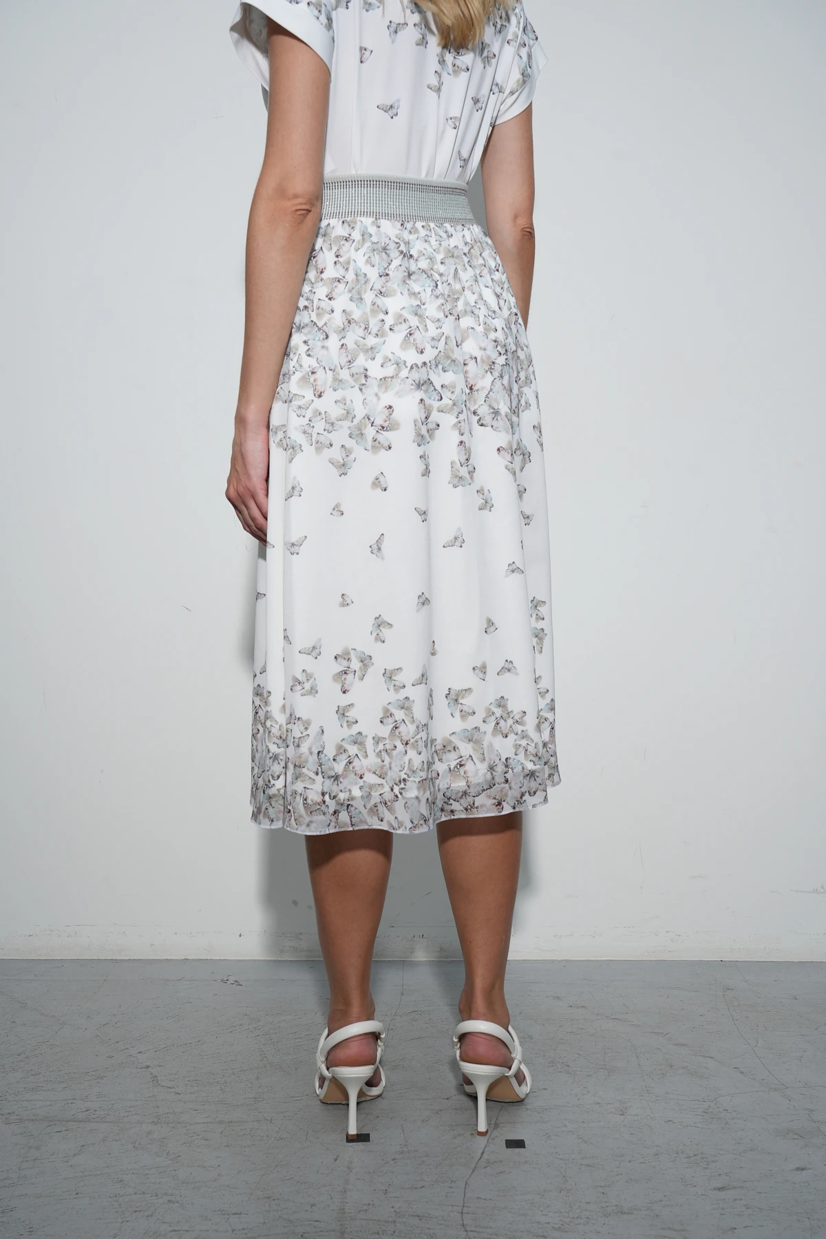 Юбка из лёгкого летящего шифона с авторским принтом на молочном фоне воплощает грацию и лёгкость. Купонное расположение принта акцентирует внимание на тонкой талии и изящных щиколотках, создавая утончённый силуэт. Для непрозрачности модель дополнена монохромным подкладом. Юбка А-силуэта длины миди выполнена на трикотажном поясе. Широкая бейка пояса гармонично сочетает оттенки принта, создавая завершённый образ. Юбка идеально подойдёт для романтичных и повседневных летних образов.