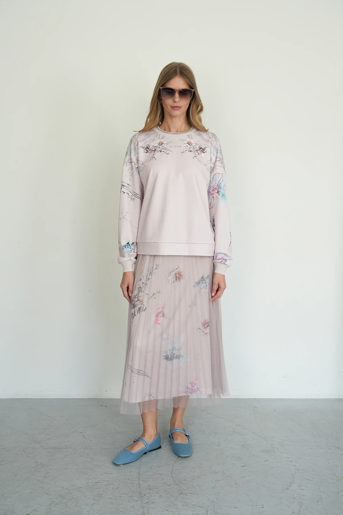 Летящая двухслойная юбка — изысканное сочетание легкости и стиля. Верхний слой из воздушной сетки в нюдовом оттенке с изысканным гофре создаёт романтичное и невесомое настроение. Нижний слой выполнен из эластичного бифлекса с авторским принтом «Романтика приключений», добавляющим яркий акцент. Юбка А-силуэта длины миди подчёркивает женственность, а пояс на эластичной ленте обеспечивает комфортную посадку и универсальность. Юбка станет прекрасным дополнением для элегантных и повседневных образов, идеально сочетаясь с топами и блузами.