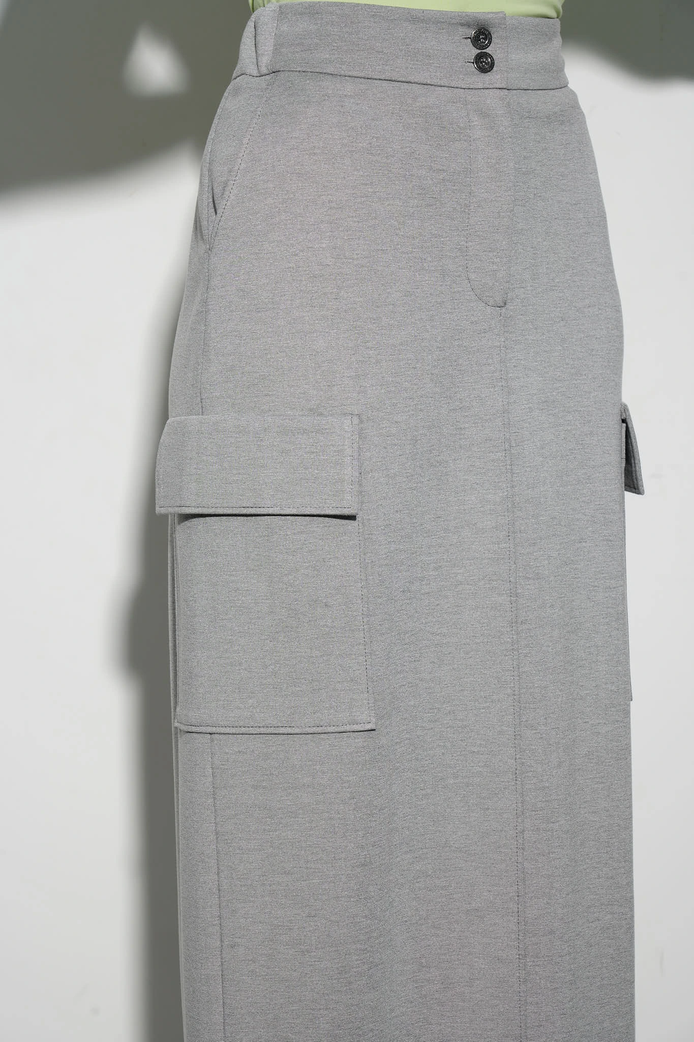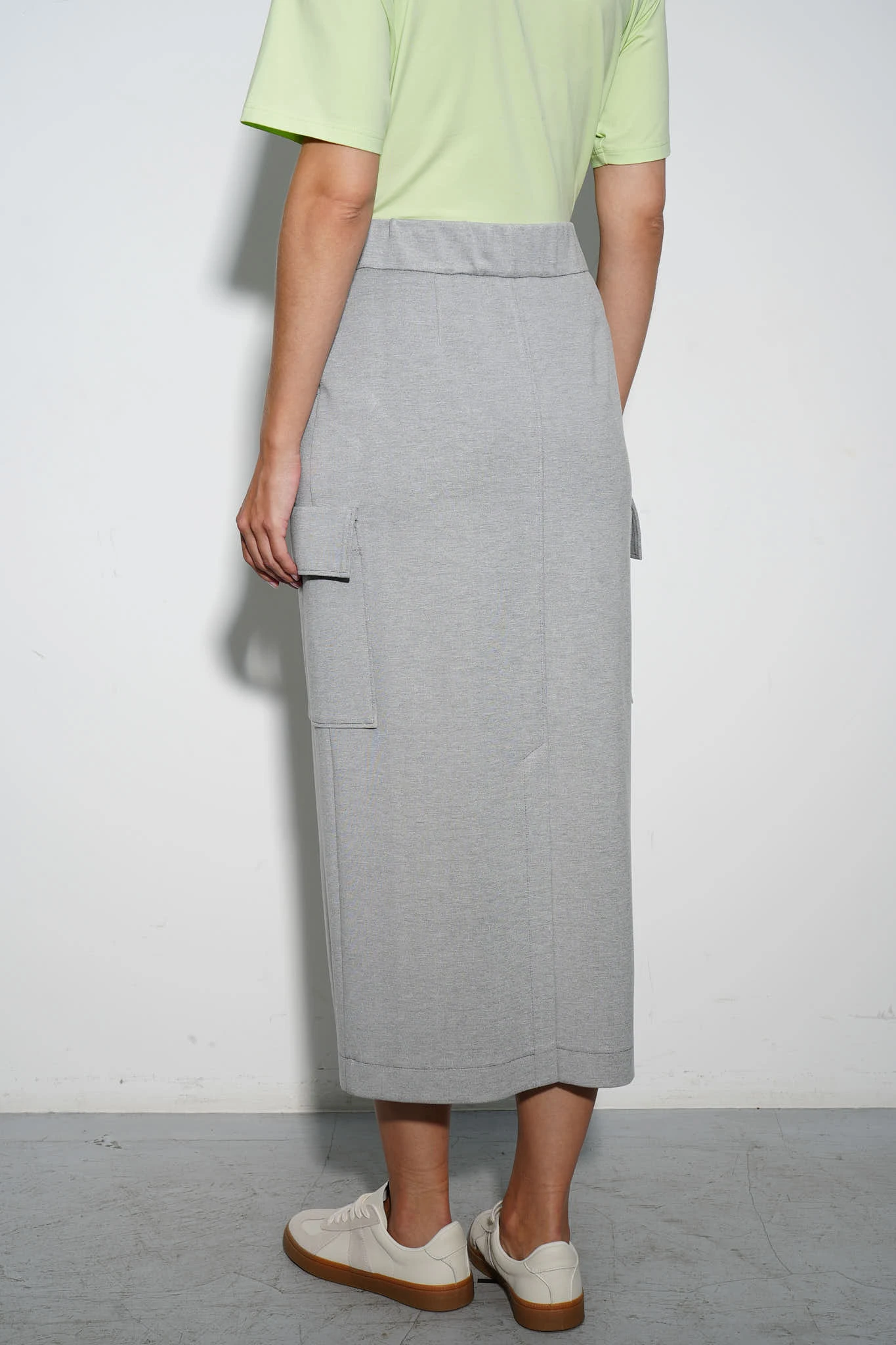 Юбка длины миди прямого силуэта в сером меланжевом оттенке из мягкого трикотажа на основе вискозы. Высокая посадка подчёркивает талию, а карманы с клапанами в стиле карго добавляют образу актуальности и функциональности. Лаконичные отстрочки и высокая шлица формируют изящный силуэт. Юбка идеально дополнит ваш гардероб, позволяя создавать элегантные и расслабленные образы на каждый день.