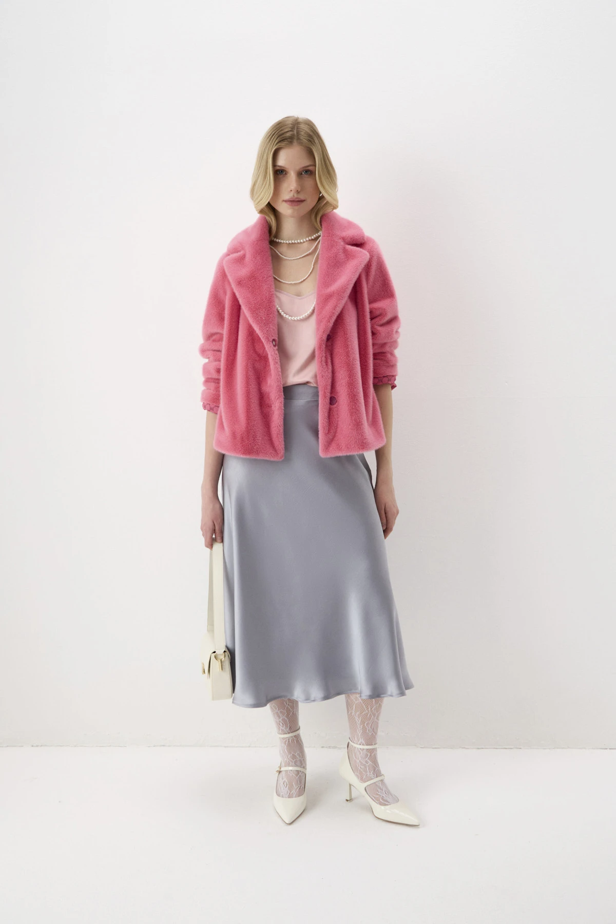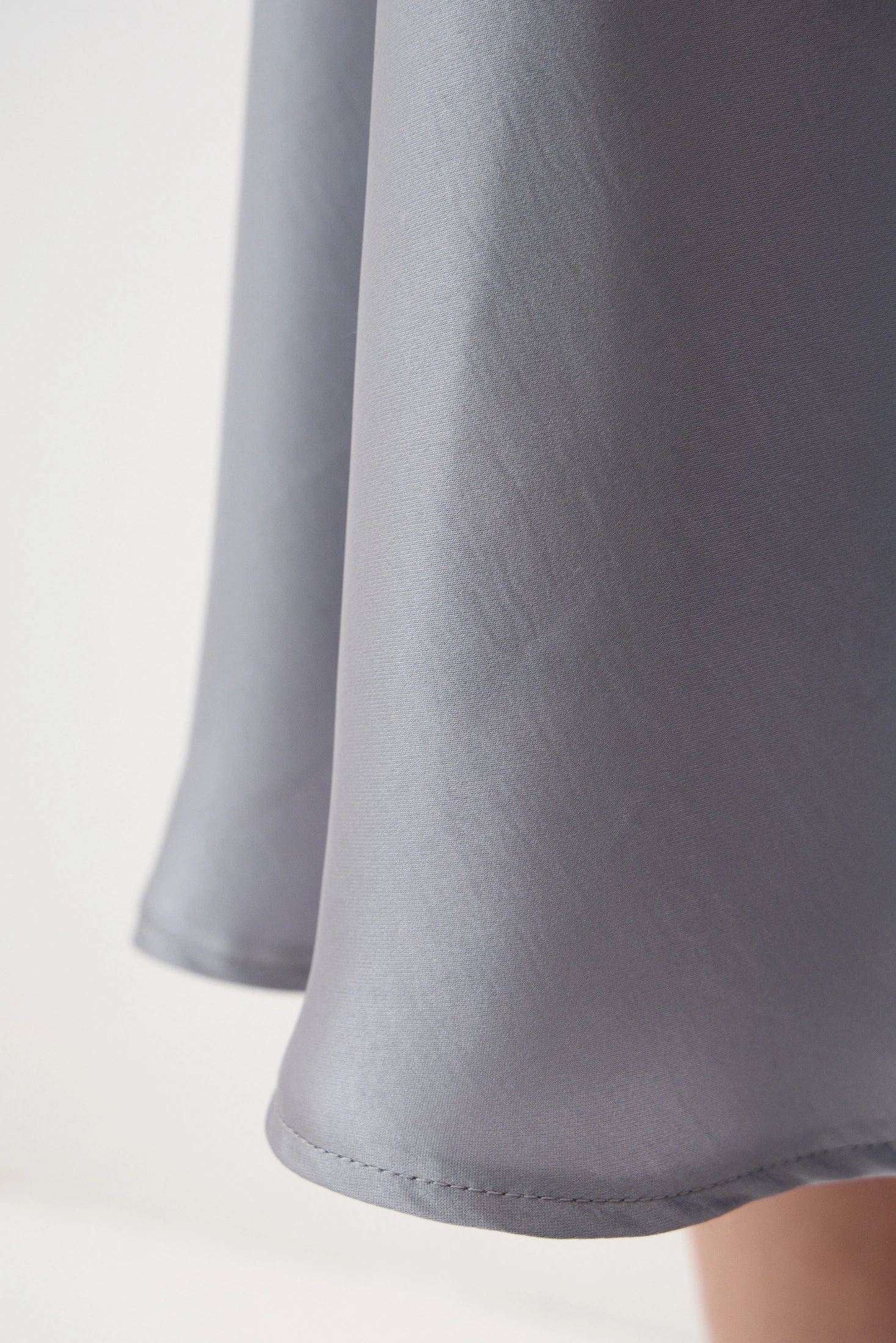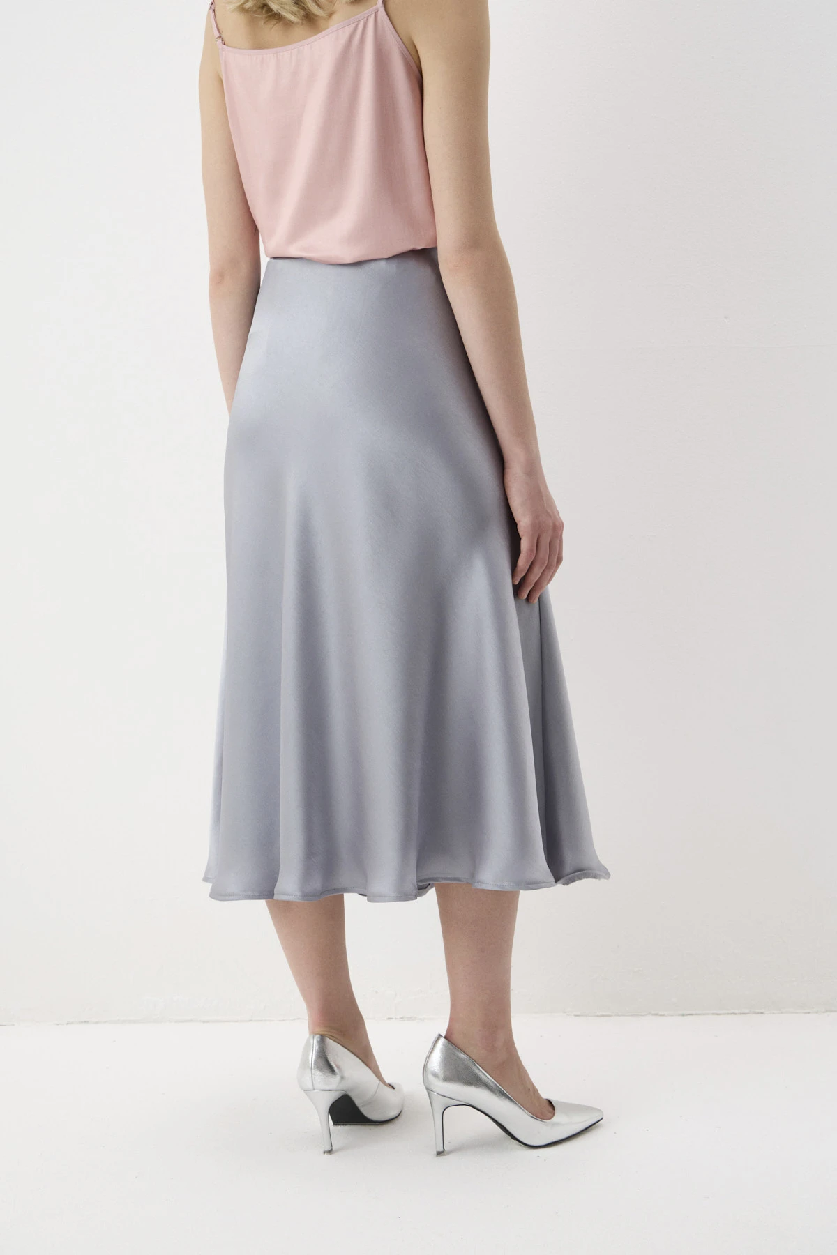 Юбка А-силуэта из струящейся вискозы с атласной фактурой в сером оттенке. Длина миди создаёт лёгкий и женственный силуэт. Модель дополнена подкладом; застёжка на потайную молнию в боковом шве. Юбка придаст образу нотку роскоши и утонченности.