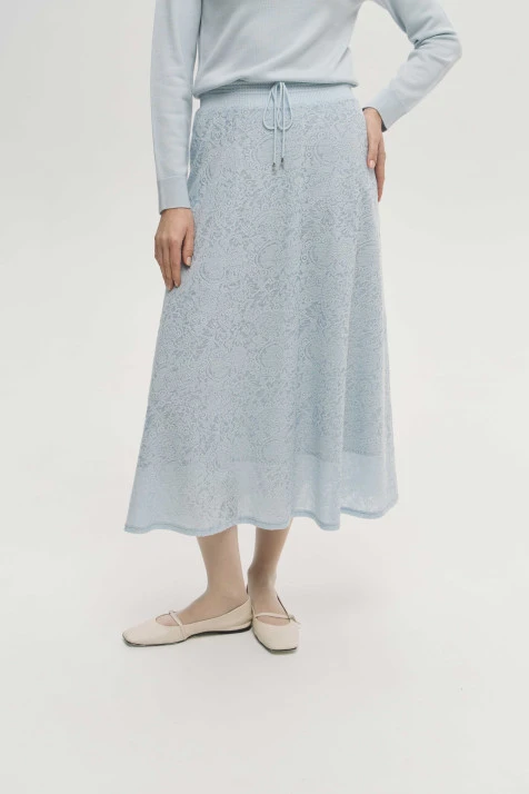 Женственная юбка А-силуэта длины миди подходит для разных типов фигуры и подчёркивает талию. Контрастное кружево и двуслойная фактура придают образу визуальный интерес и создают романтичное настроение. Мягкий подклад на основе вискозы обеспечивает комфорт и гигроскопичность. Оттенок «синяя тень» — сложный, глубокий, универсальный — легко сочетается как с нейтральной гаммой, так и с насыщенными цветами. Юбка легко трансформируется из дневного образа в вечерний — достаточно сменить аксессуары и обувь.