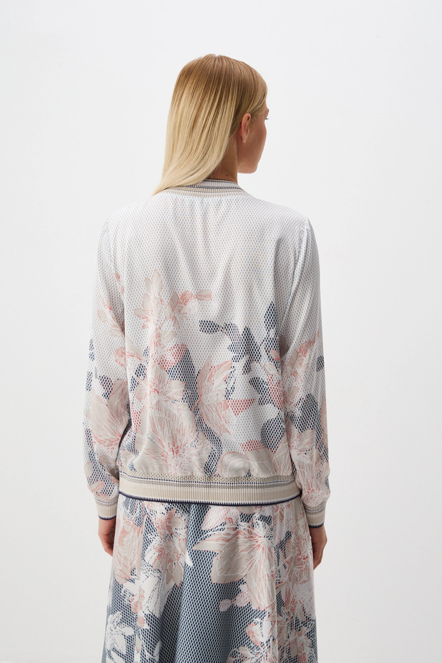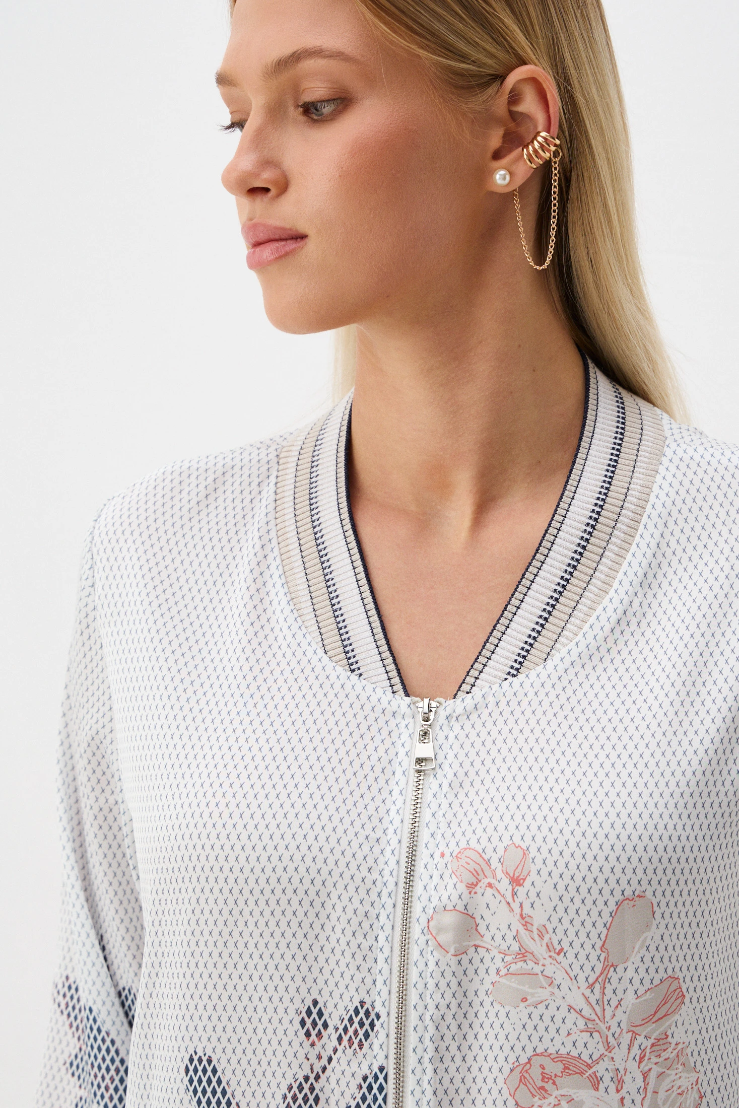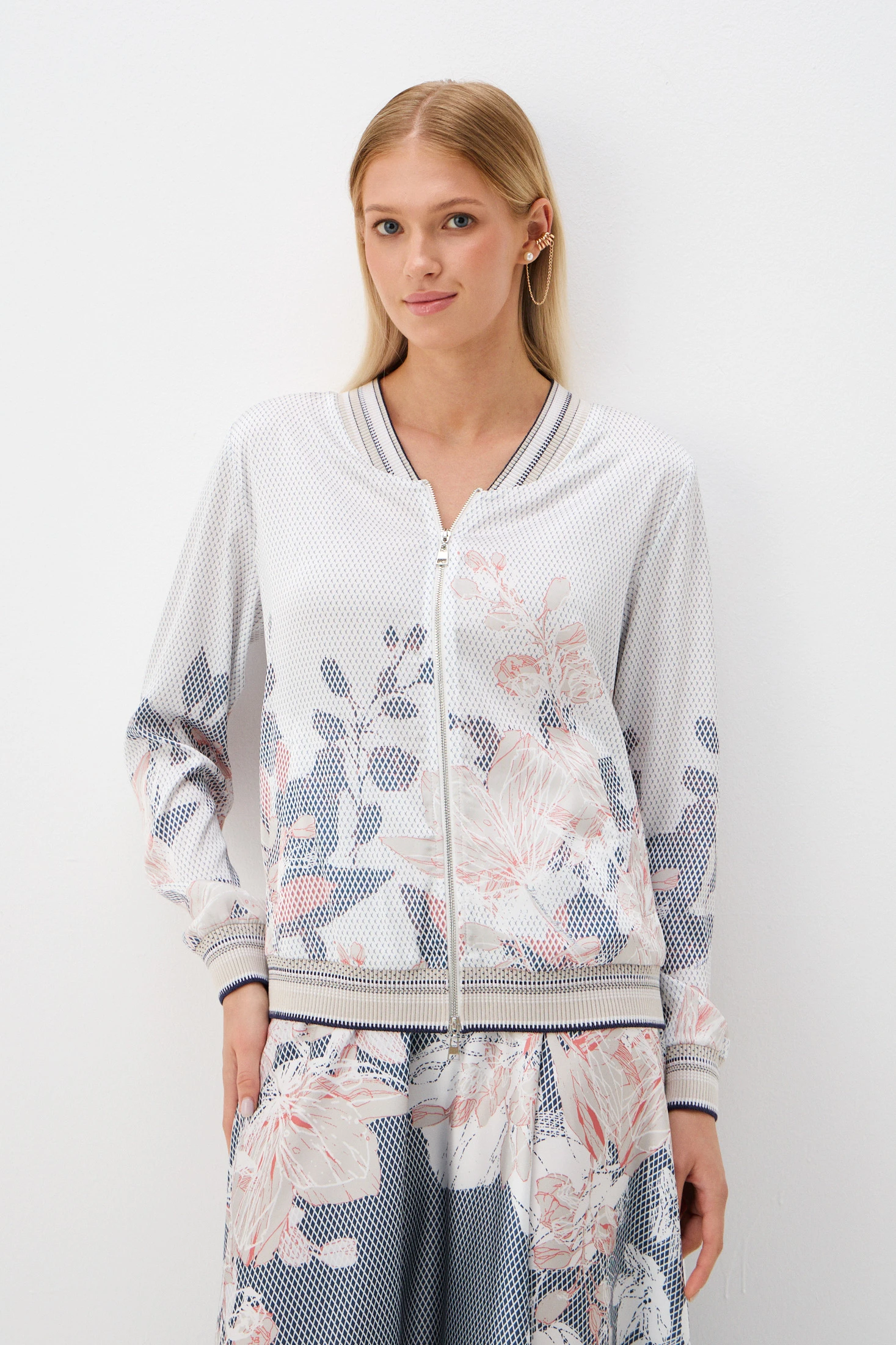 Удобный и женственный блузон в стиле спорт-шик – гордость каждой коллекции! Характер блузона – в изысканном летнем принте. На фон оттенка «белый шёпот» нанесён многослойный авторский принт в оттенках «коралл», «тёплый песок» и «синий пепел». Излюбленный приём бренда – сочетание флорального принта и геометрии. Удобный крой, карманы, застёжка на молнию – в блузоне предусмотрено всё для Вашего комфорта.