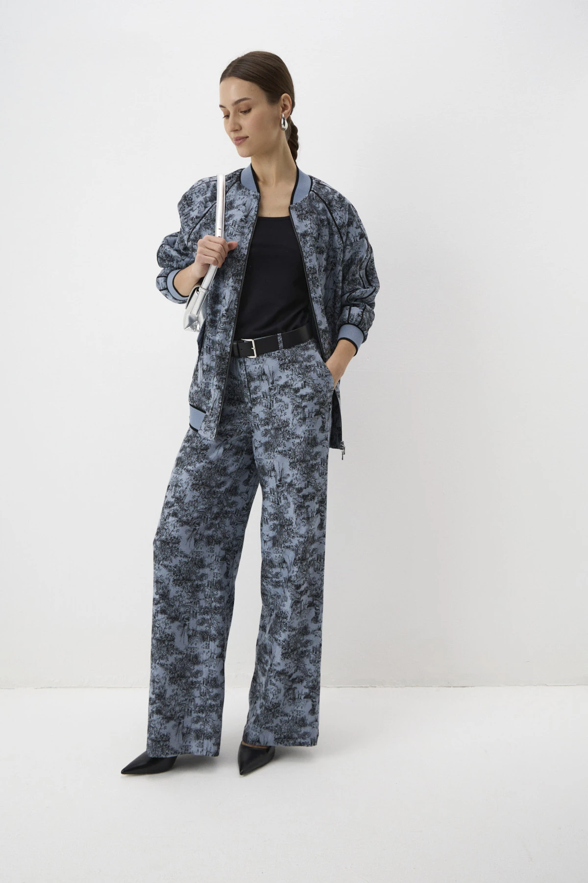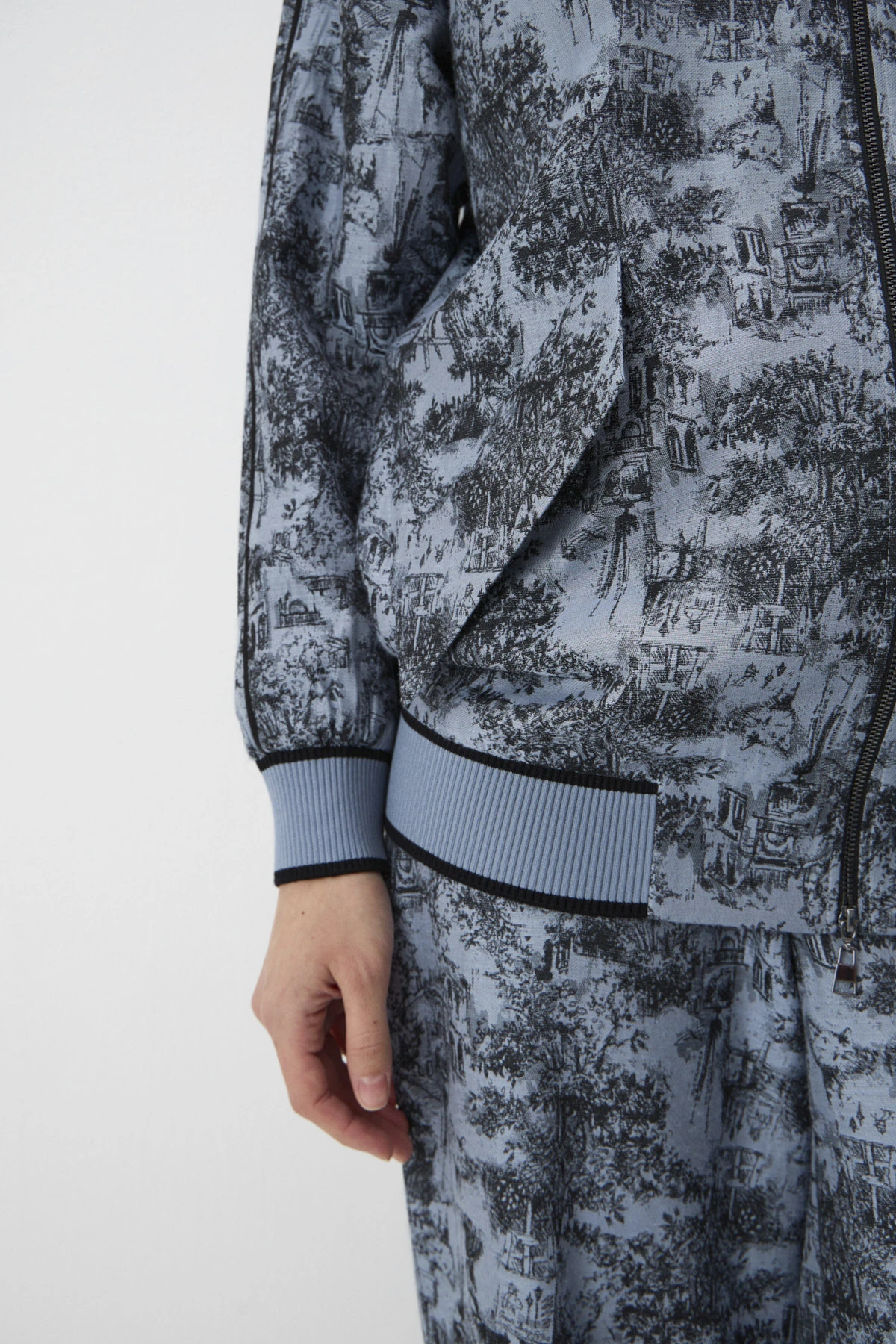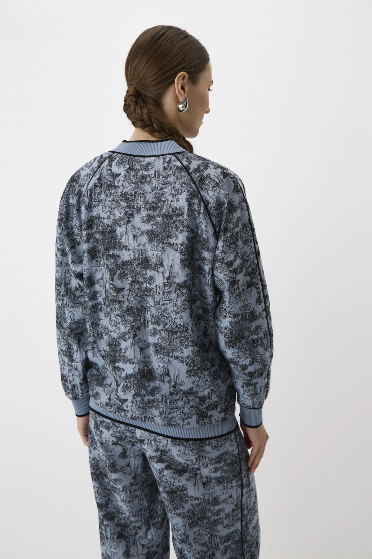 Удлинённый бомбер свободного кроя из авторского жаккарда, созданного по эскизам бренда. Синий оттенок Невы и таинственный цвет «затмение» придают особую графичность – детализированный принт в стилистике гравюры передаёт атмосферу Петербурга и приглашает нас в сказку! Рукав реглан формирует мягкий женственный силуэт в области плеча, а трикотажный пояс, вырез горловины и манжеты из авторской бейки придают расслабленный характер в стиле спорт-шик. В модели предусмотрены удобные карманы. Застёжка на двустороннюю молнию из шлифованного металла.