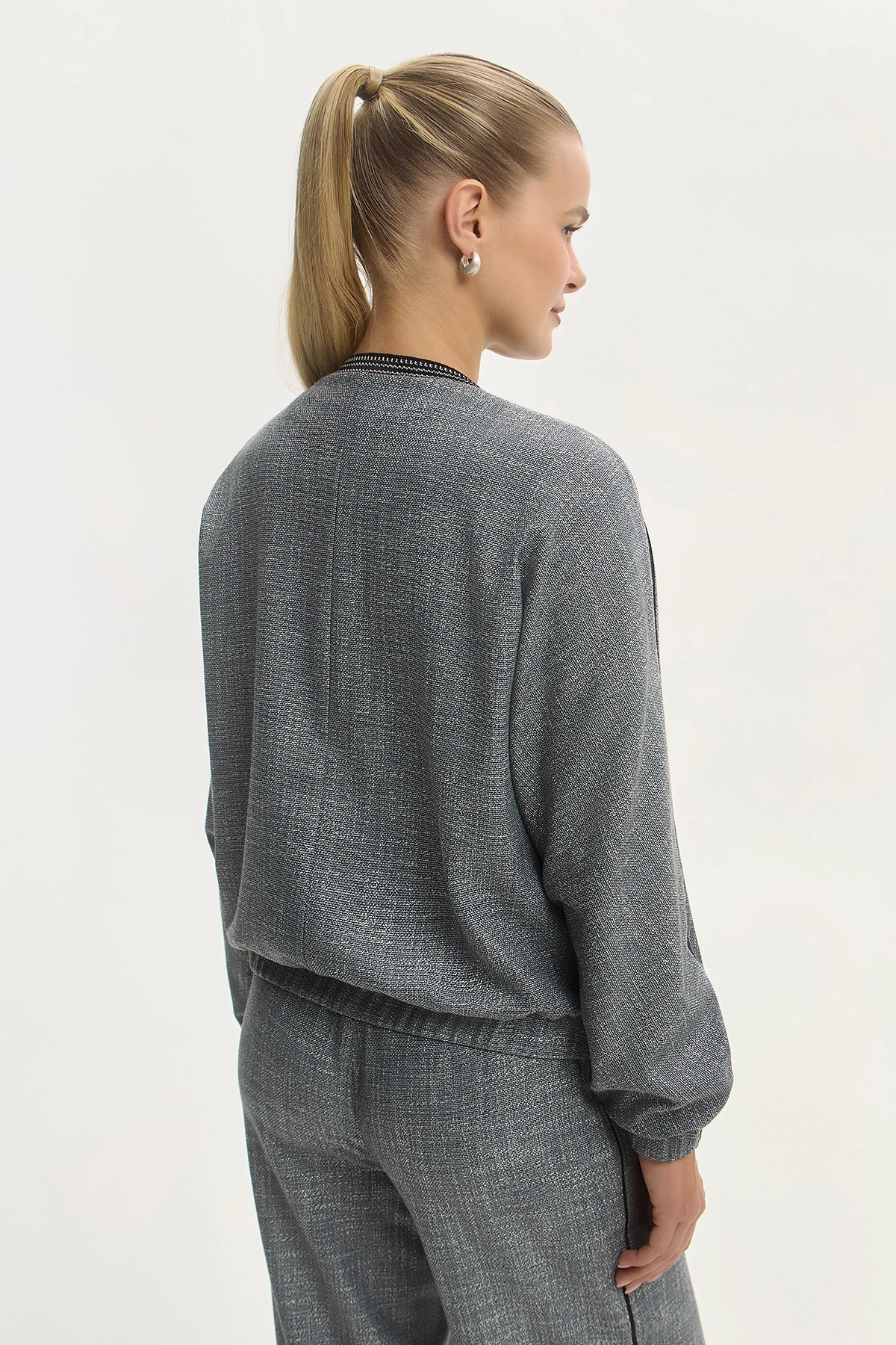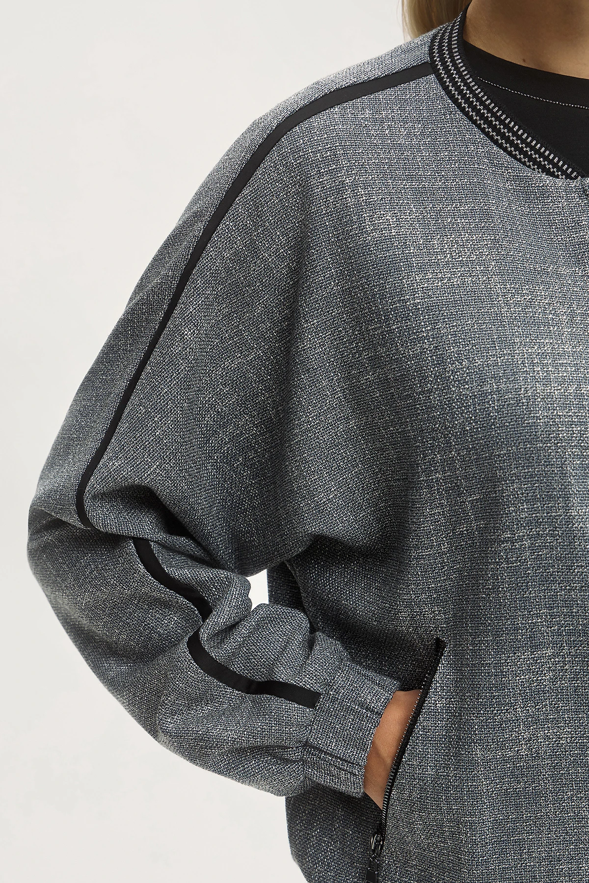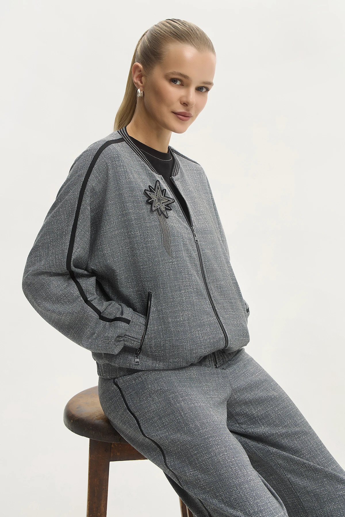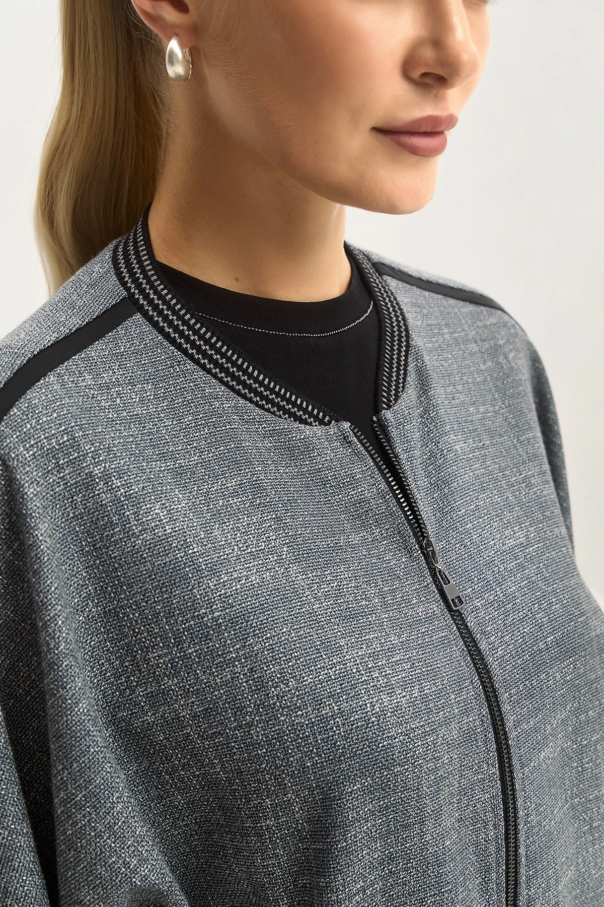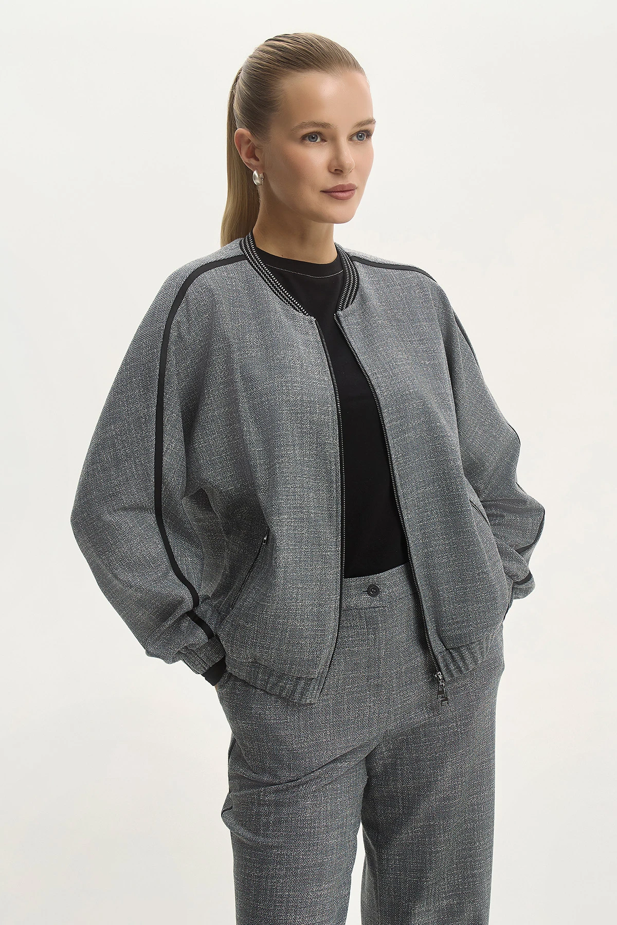 Бомбер свободного силуэта создаёт актуальный умеренный объём. Фактурная ткань с добавлением вискозы делает модель комфортной, универсальной и визуально ритмичной. Акцентный лампас придаёт образу выразительность в стиле спорт-шик. Модель идеальна для межсезонья и многослойных образов. Сочетается с однотонными базами и подходит как к брюкам из комплекта, так и к дениму, юбкам, платьям. Бомбер дополнен комфортными карманами.