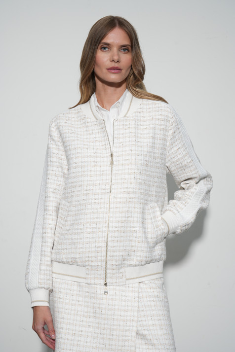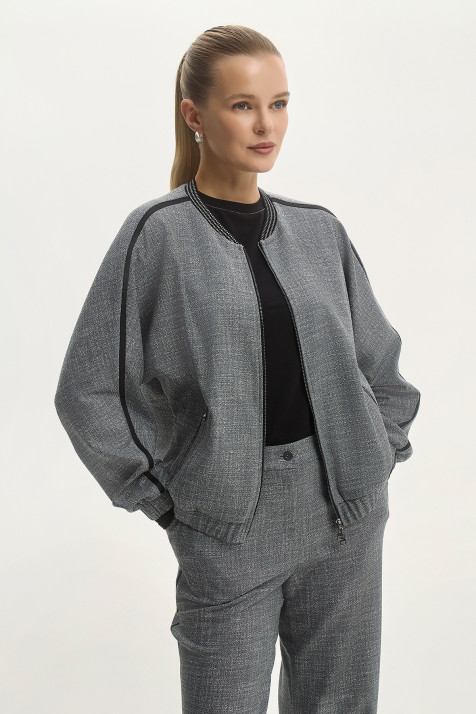 Бомбер свободного кроя на молнии — комфортная летняя модель, создающая настроение легкости и расслабленной элегантности. Ткань бомбера – шитьё из натурального хлопка с флорально-геометричным раппортным узором-пер¬форацией в сочном ягодном оттенке. По низу модели – кулиска, регулирующая степень прилегания. Широкие втачные рукава длины ¾ со спущенной линией плеча придают бомберу непринужденную изысканность и создают визуальную легкость. Круглый вырез горловины оформлен монохромной бейкой в рубчик. Контрастная черная двусторонняя молния создает гармонию и стильный акцент.