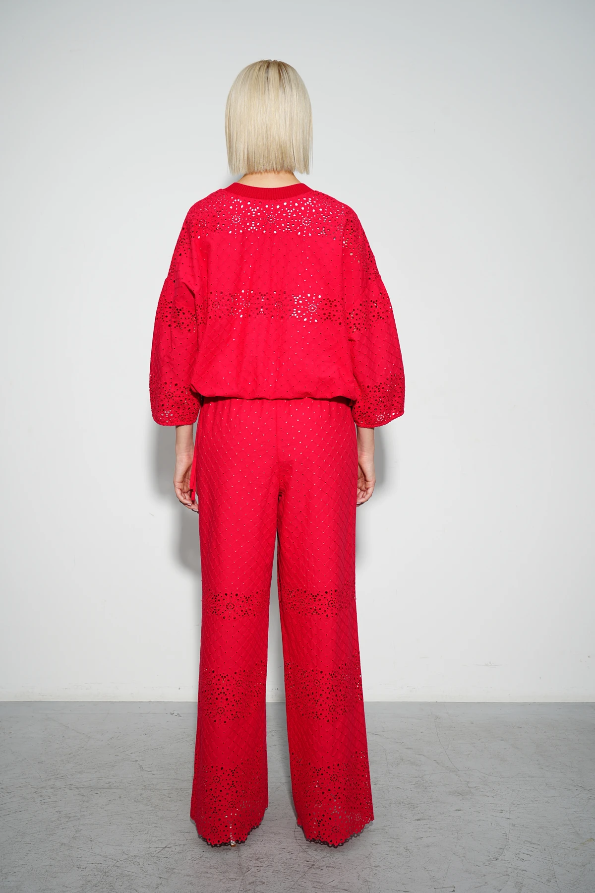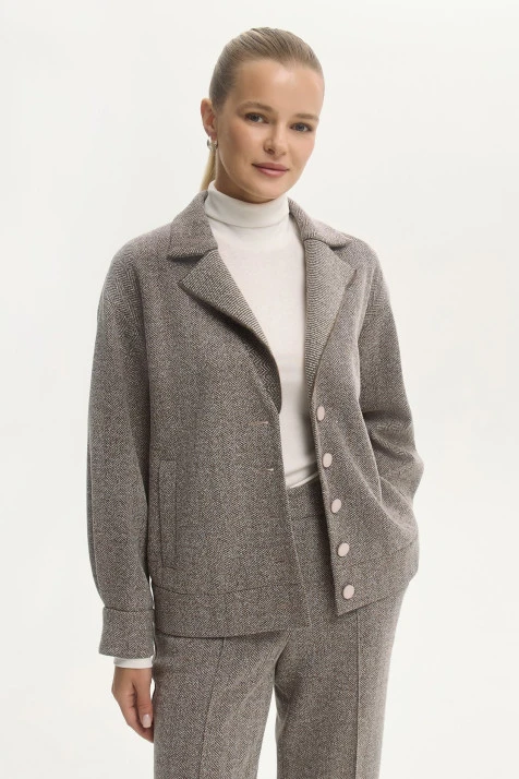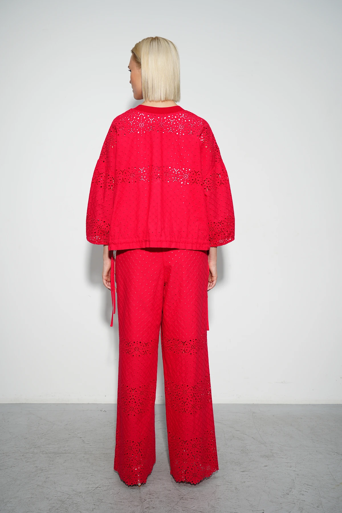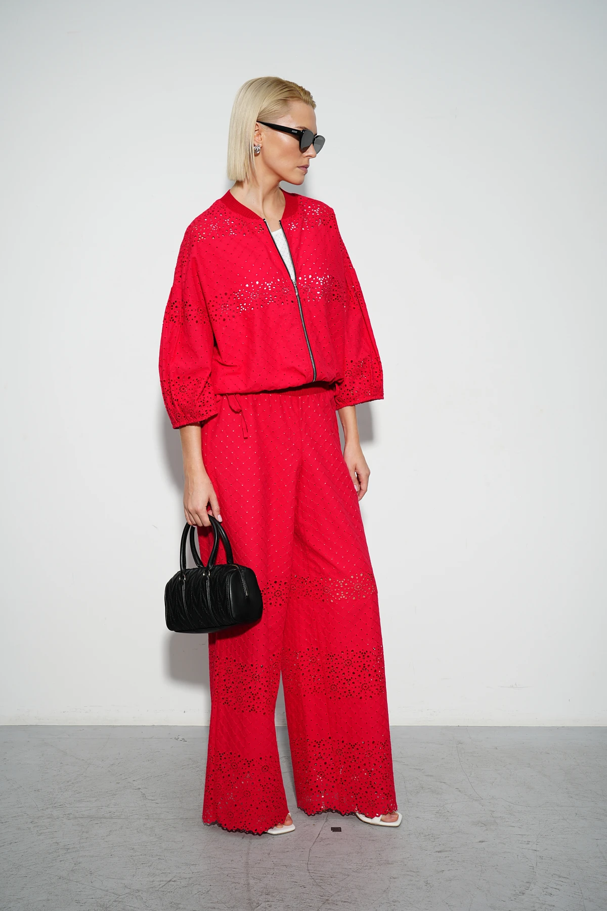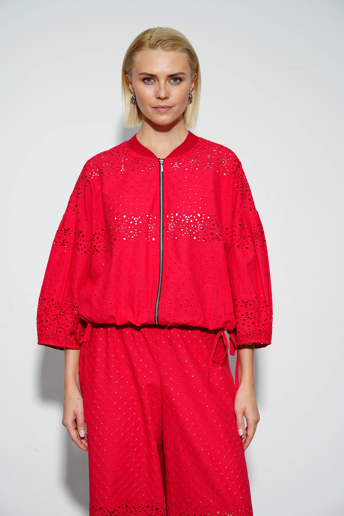 Бомбер свободного кроя на молнии — комфортная летняя модель, создающая настроение легкости и расслабленной элегантности. Ткань бомбера – шитьё из натурального хлопка с флорально-геометричным раппортным узором-пер¬форацией в сочном ягодном оттенке. По низу модели – кулиска, регулирующая степень прилегания. Широкие втачные рукава длины ¾ со спущенной линией плеча придают бомберу непринужденную изысканность и создают визуальную легкость. Круглый вырез горловины оформлен монохромной бейкой в рубчик. Контрастная черная двусторонняя молния создает гармонию и стильный акцент.