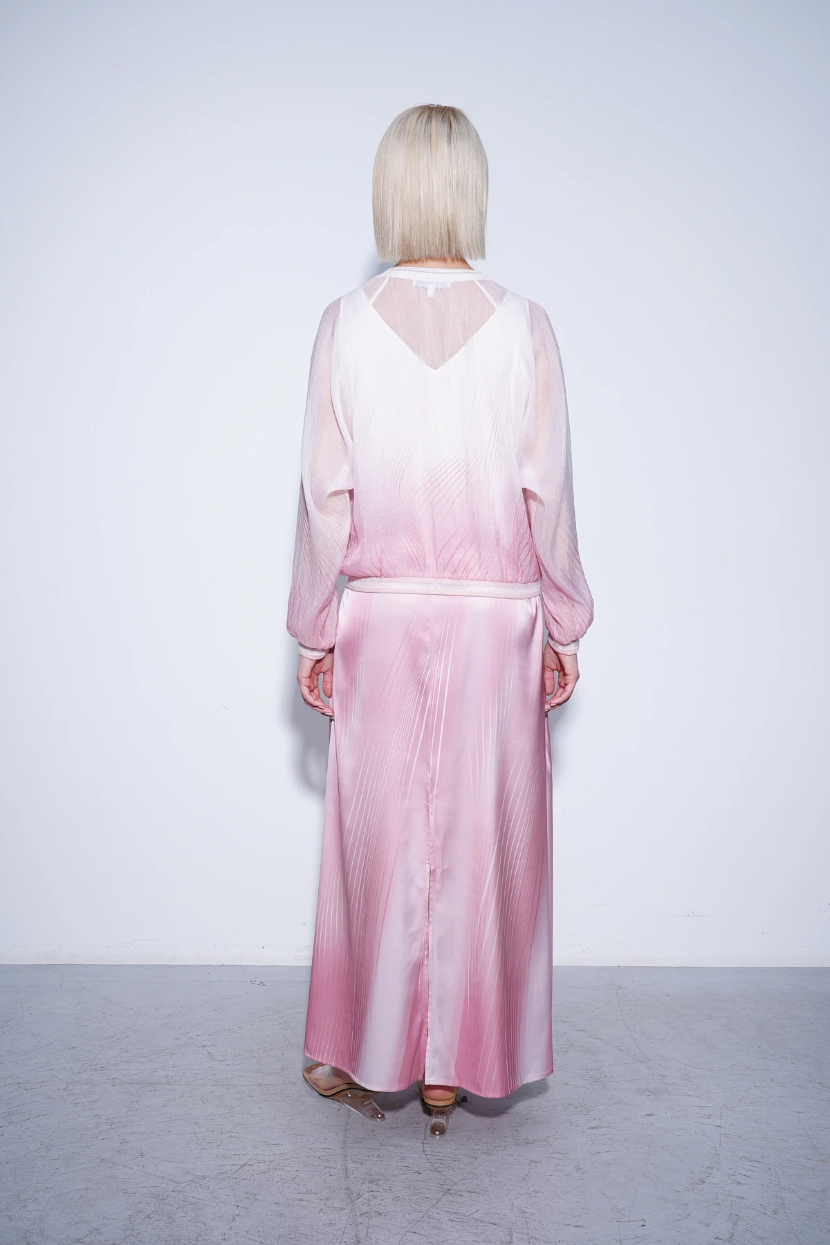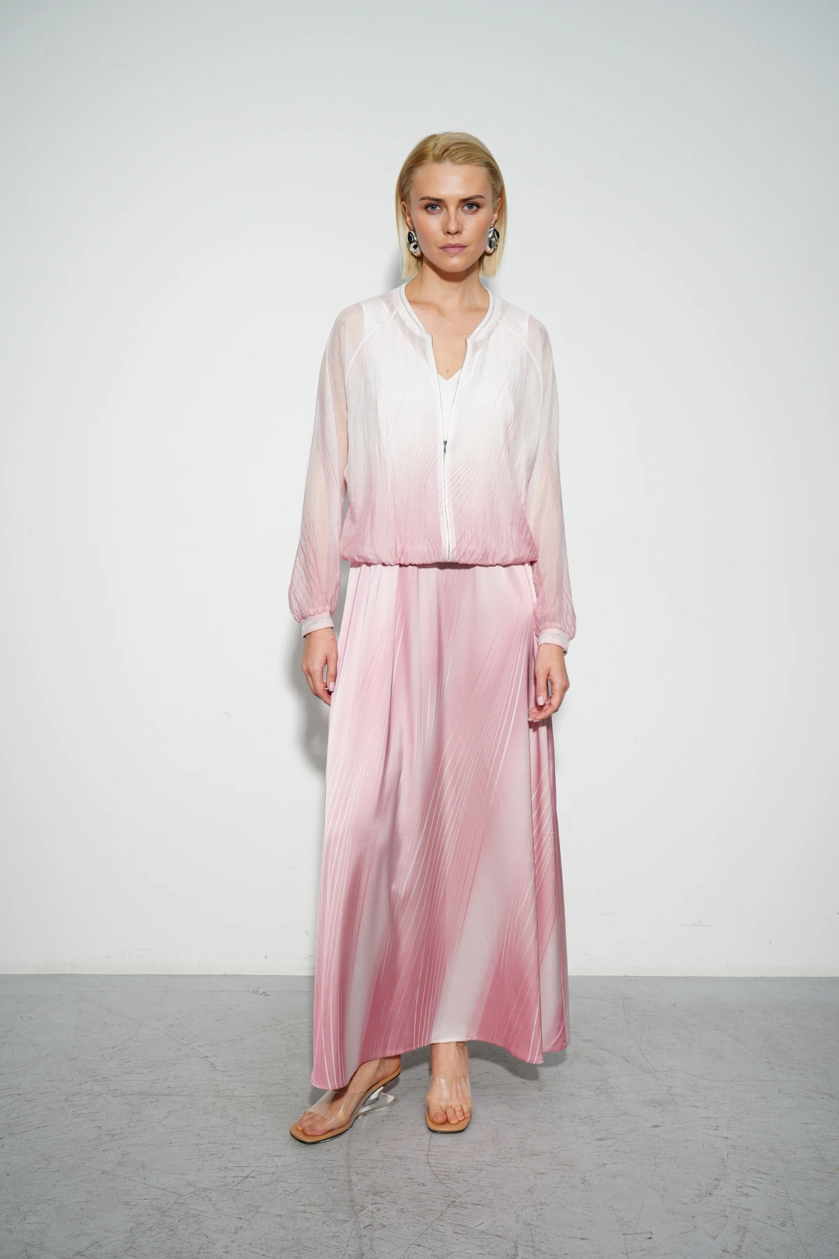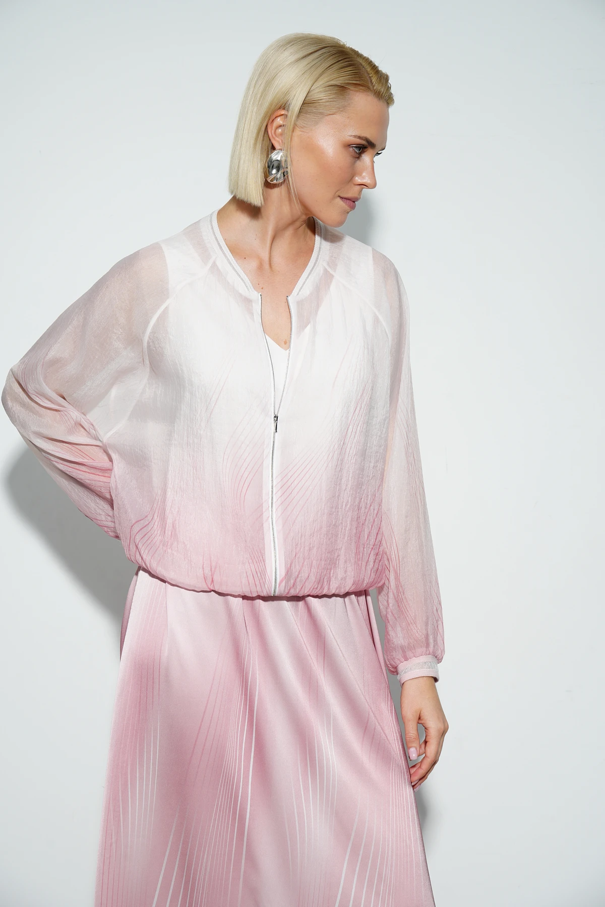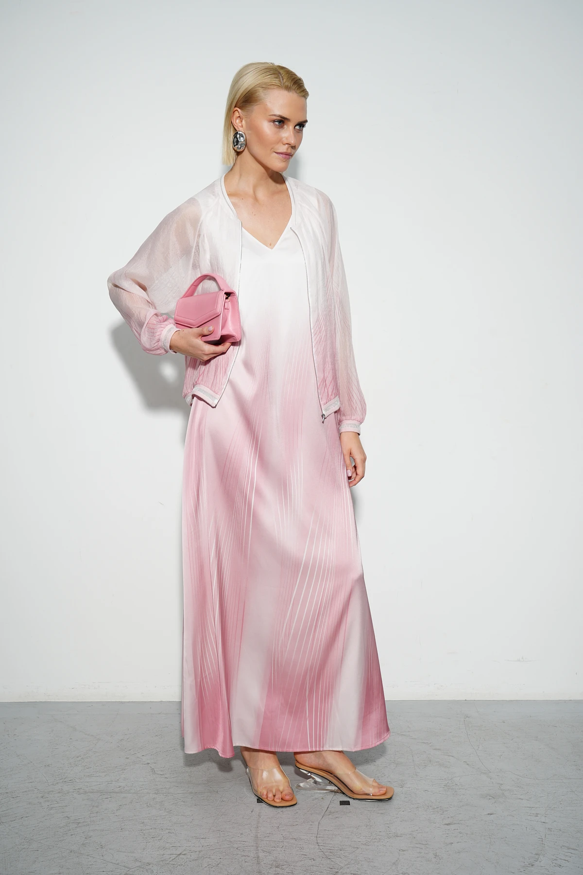 Бомбер из жатой органзы с цветовой растяжкой в оттенке «розовый персик» и динамичными полосами в принте — романтичная модель, которая привлекает внимание своей необычной фактурой и стильным дизайном. Свободный силуэт на молнии дарит комфорт и свободу движений, а рукава реглан полной длины на манжетах добавляют легкости и динамичности. Круглый вырез горловины, манжеты и низ бомбера оформлены авторской бейкой, что придает модели яркие акценты и завершенность. Игра контрастов и фактур между мягким, плотным трикотажем и жесткой, воздушной сеткой создает уникальный визуальный эффект, делая бомбер стильным и выразительным элементом гардероба.