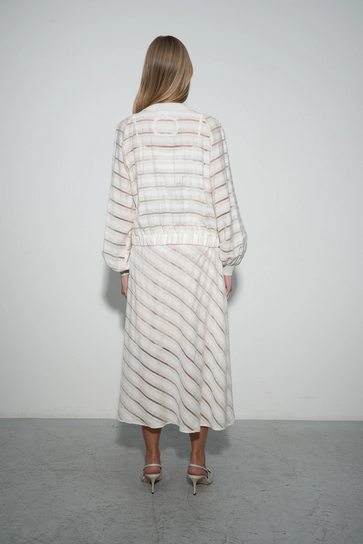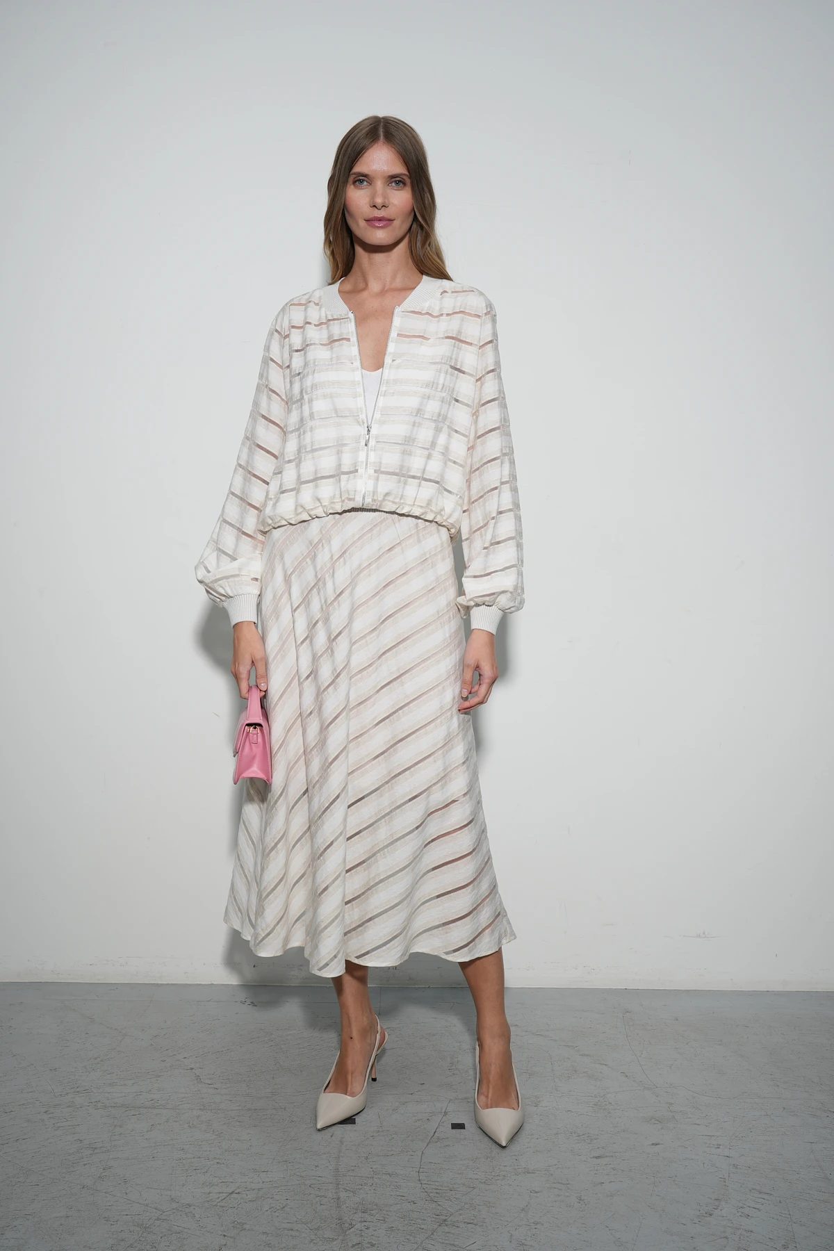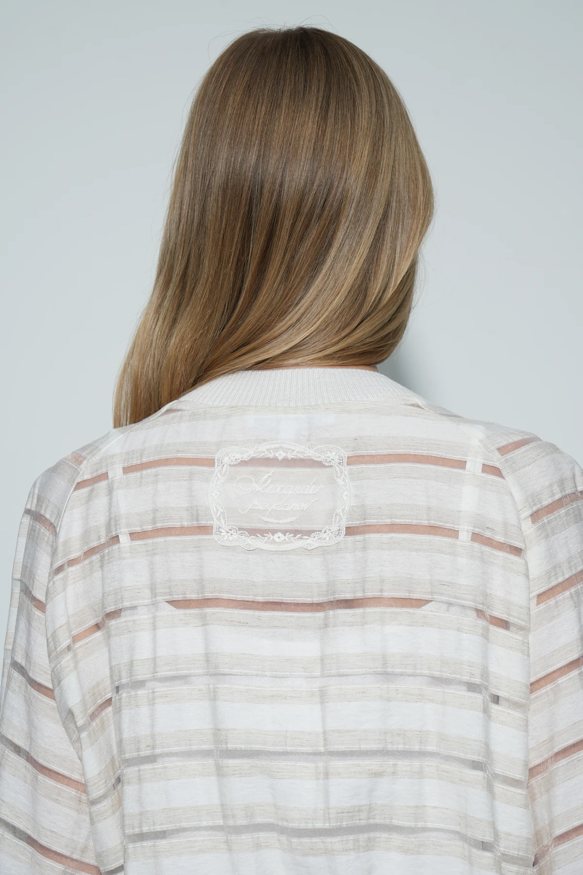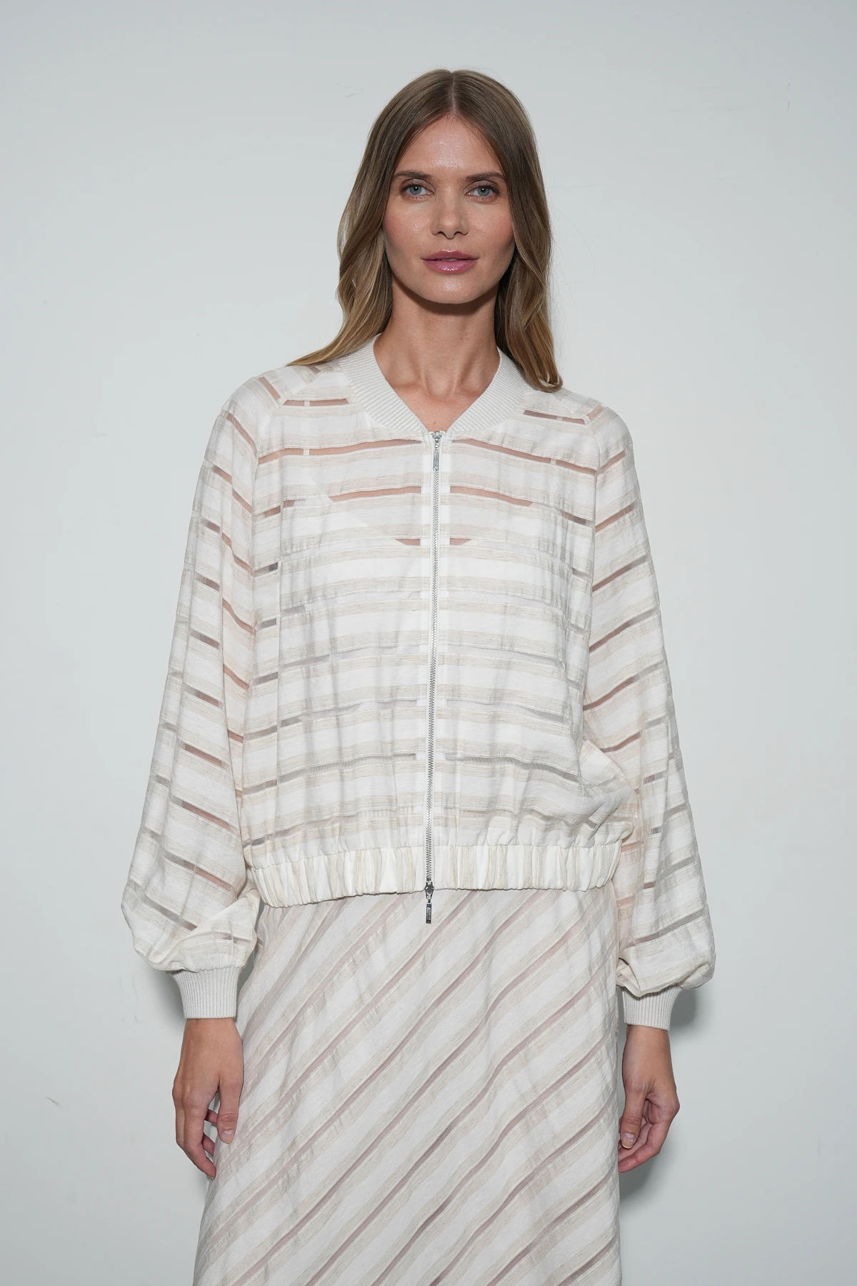 Бомбер из ткани восхитительного состава – премиальный район и натуральный лён. Фактура ткани имеет характерные льняные оттенки и вставки-полосы из нейлона, создающие воздушный полупрозрачный эффект.