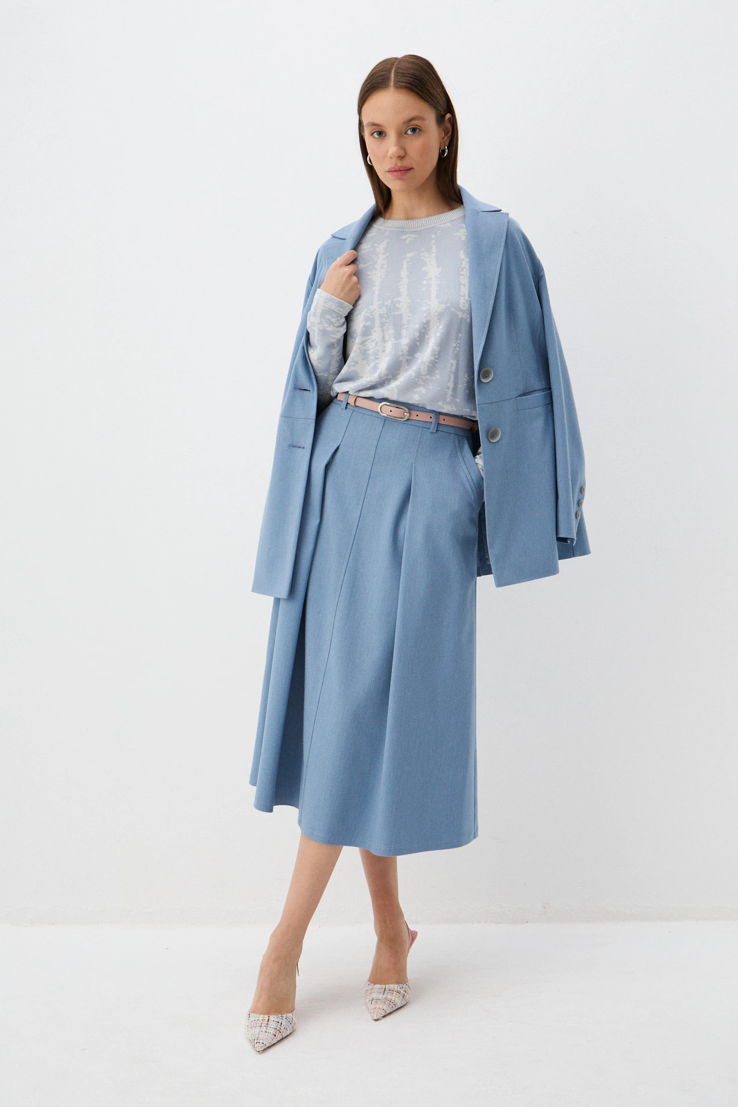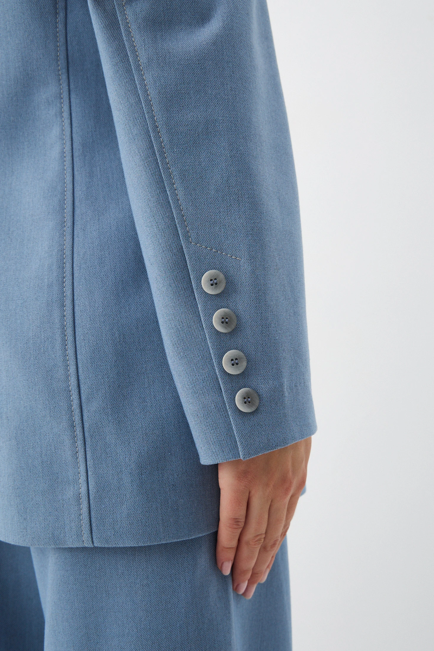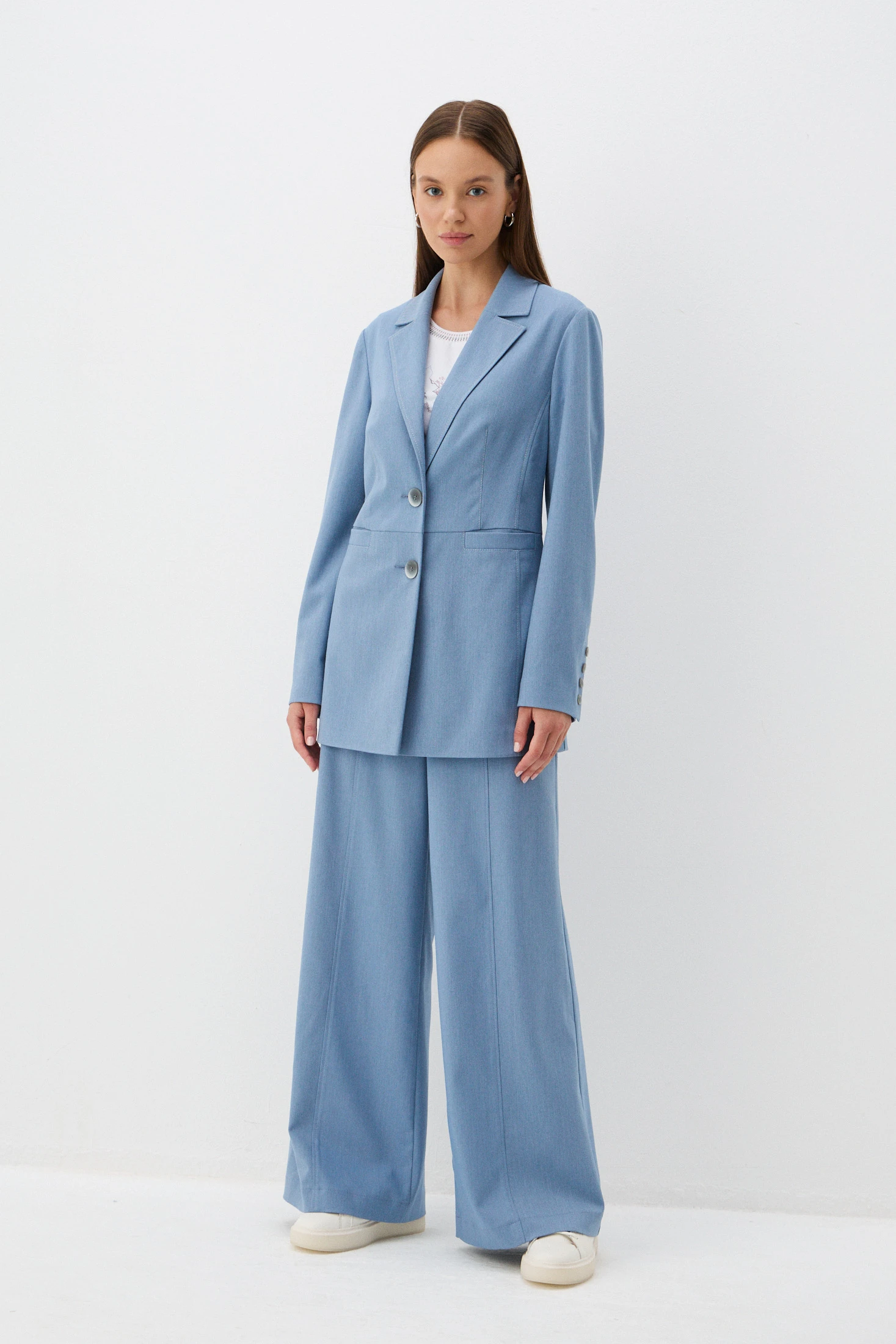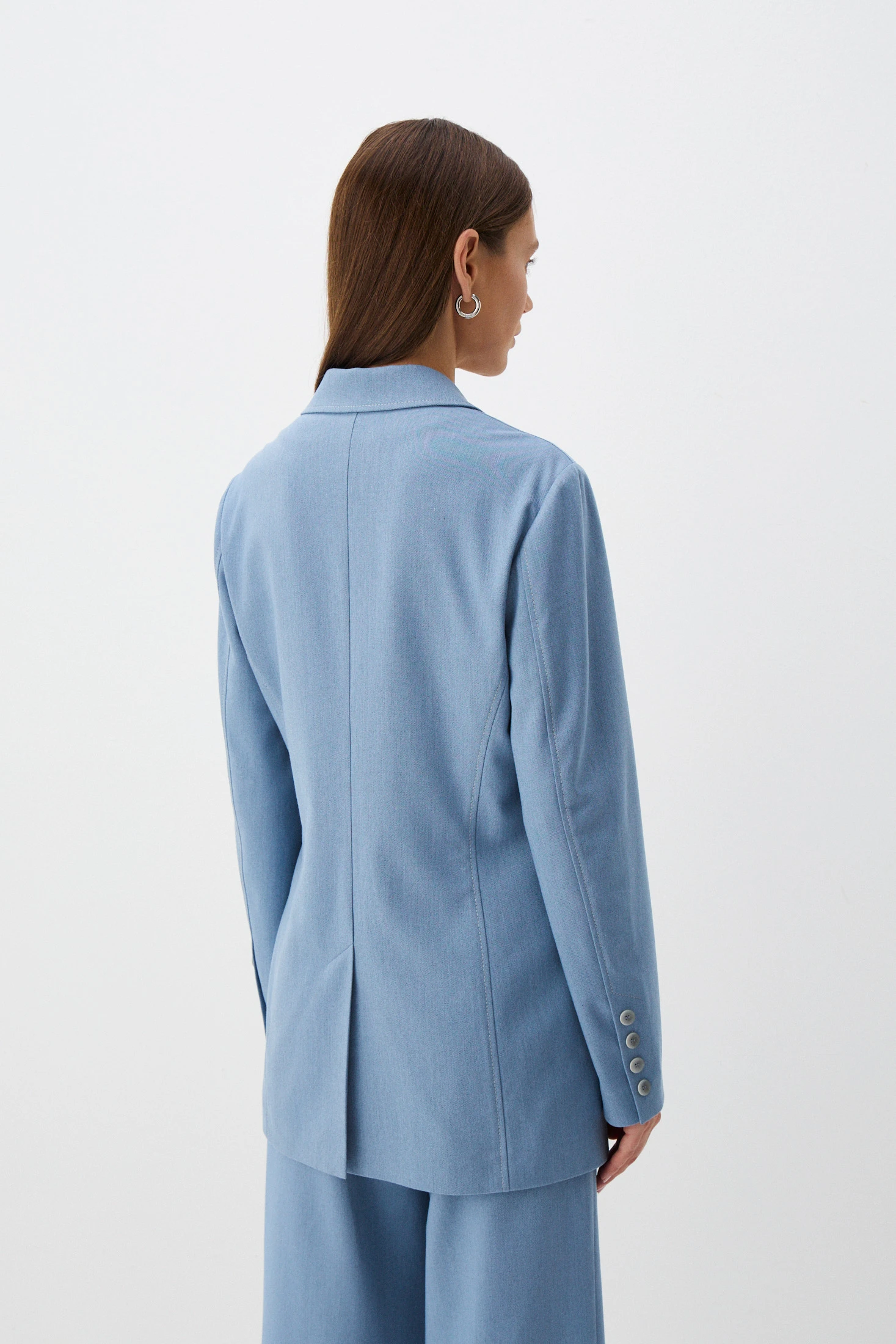 Удлиненный жакет из костюмной ткани с фактурой денима – модель в классическом стиле с расслабленным настроением. Жакет будет смотреться одинаково уместно и на деловой встрече, и на вечерней прогулке. В зависимости от модели-компаньона жакет можно «увести» в разные стили – например, в casual в паре с джинсами или в романтику с лёгким кокейльным платьем.