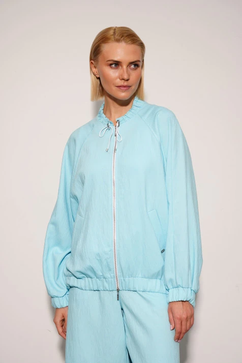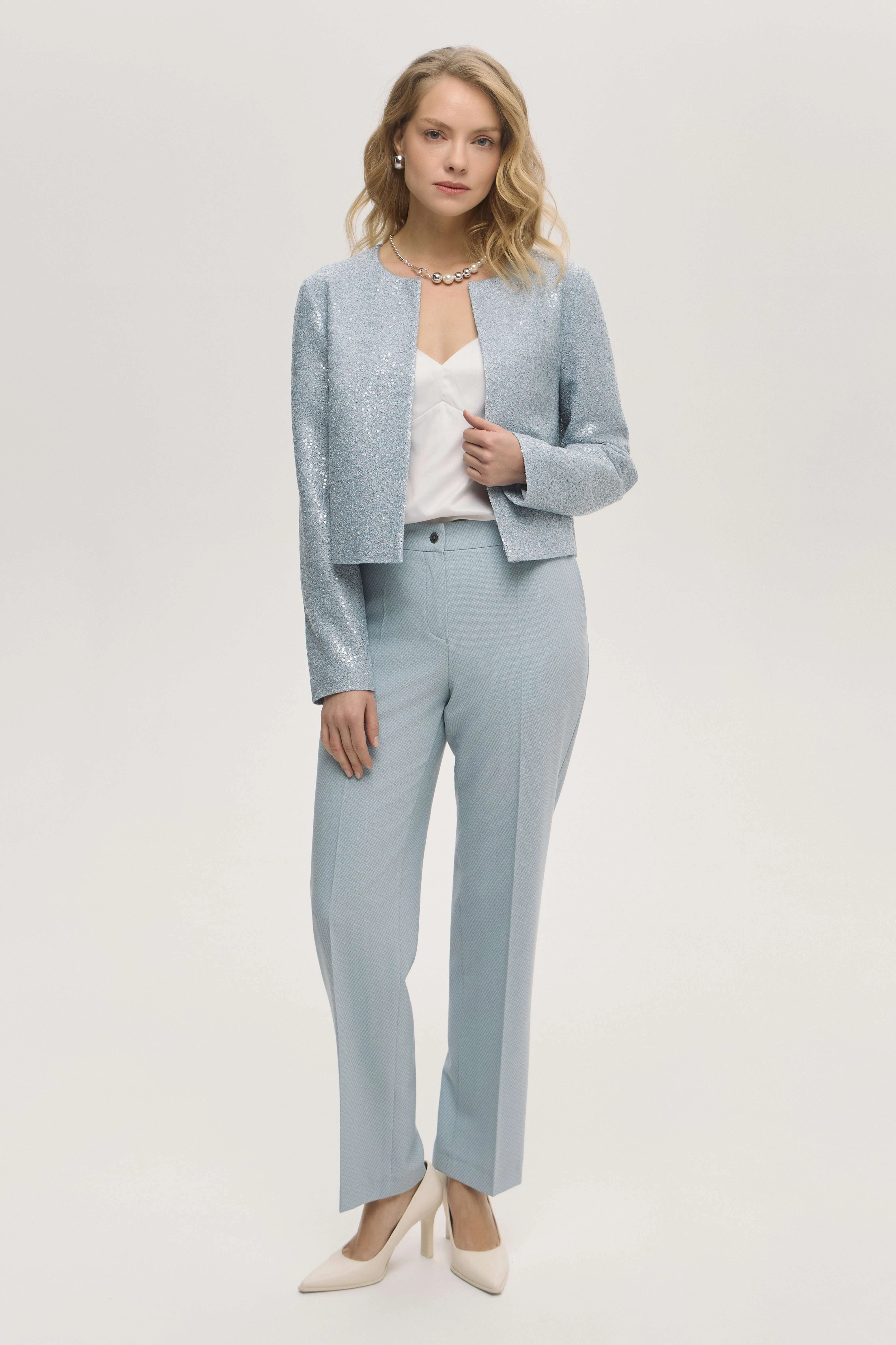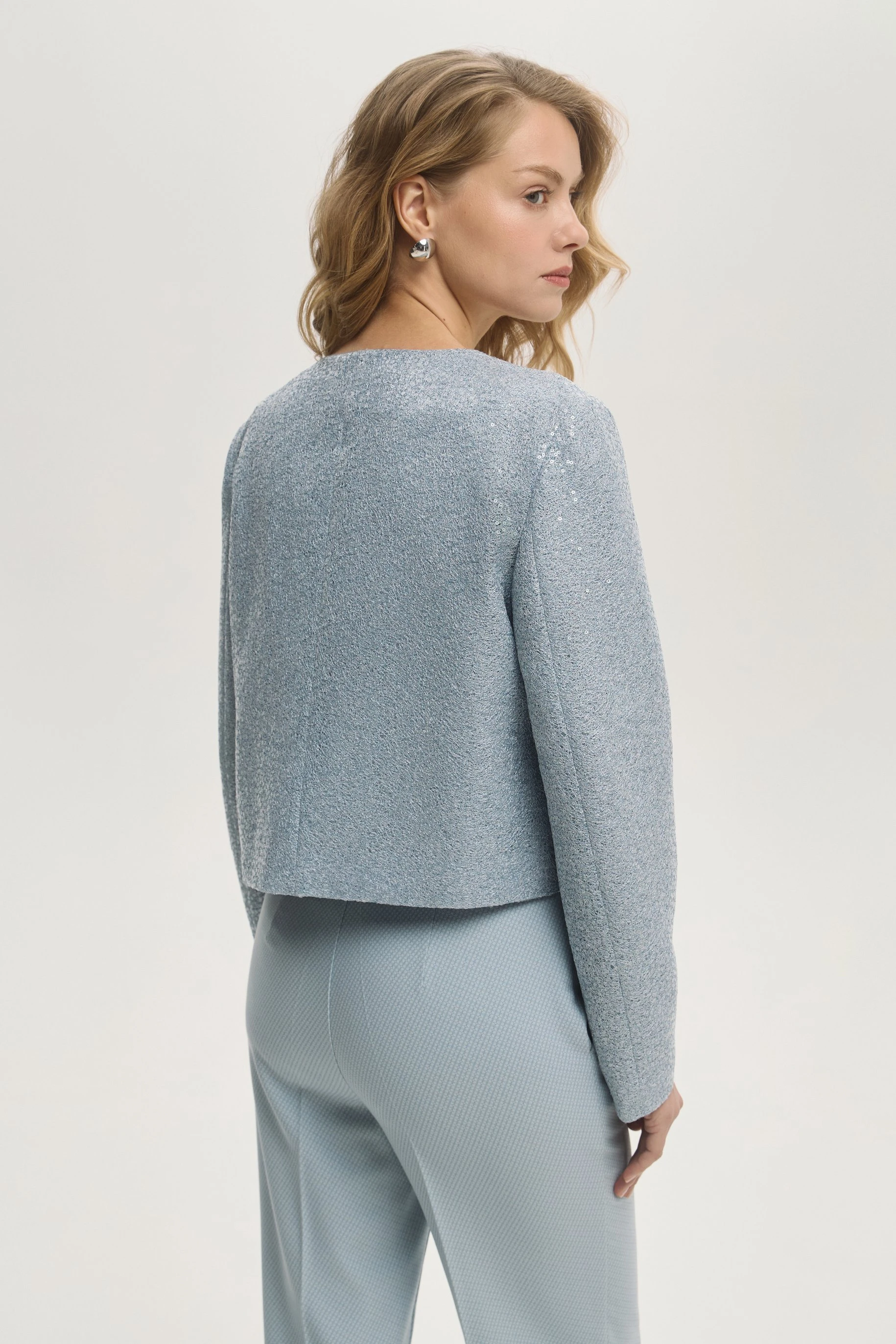 Прямой крой и трендовый укороченный силуэт подчёркивают фигуру. Фактурная ткань с пайетками придаёт жакету утончённый блеск. Стильный минимализм линий в сочетании с пайетками делает жакет универсальным, подходящим как для коктейльных мероприятий, так и для повседневных образов. Светлый небесный оттенок — трендовый и нежный. Элегантный дизайн позволяет сочетать жакет с различными типами одежды — от брюк до платьев.
