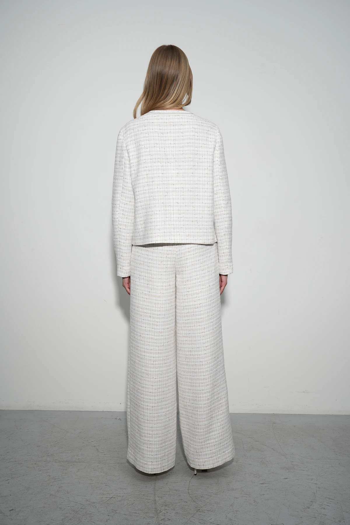 Жакет из фактурного твида с добавлением хлопка сочетает в себе элегантность и утончённый стиль. Молочные и песочные оттенки нитей образуют изысканную геометрическую клетку, добавляя модели гармонию строгости и романтичности. Однобортный прямой силуэт без воротника выполнен в культовом стиле Шанель, а втачные рукава полной длины подчёркивают комфорт и универсальность. Изюминкой жакета является авторский подклад с принтом «Природа полёта» и вдохновляющей легендой о бабочках. Накладные карманы и круглый вырез горловины украшены молочной тесьмой с изысканной цепочкой мониль, гармонирующей с пуговицами из шлифованного металла. Модель станет стильным акцентом вашего гардероба, идеально дополняя как деловые, так и повседневные образы.