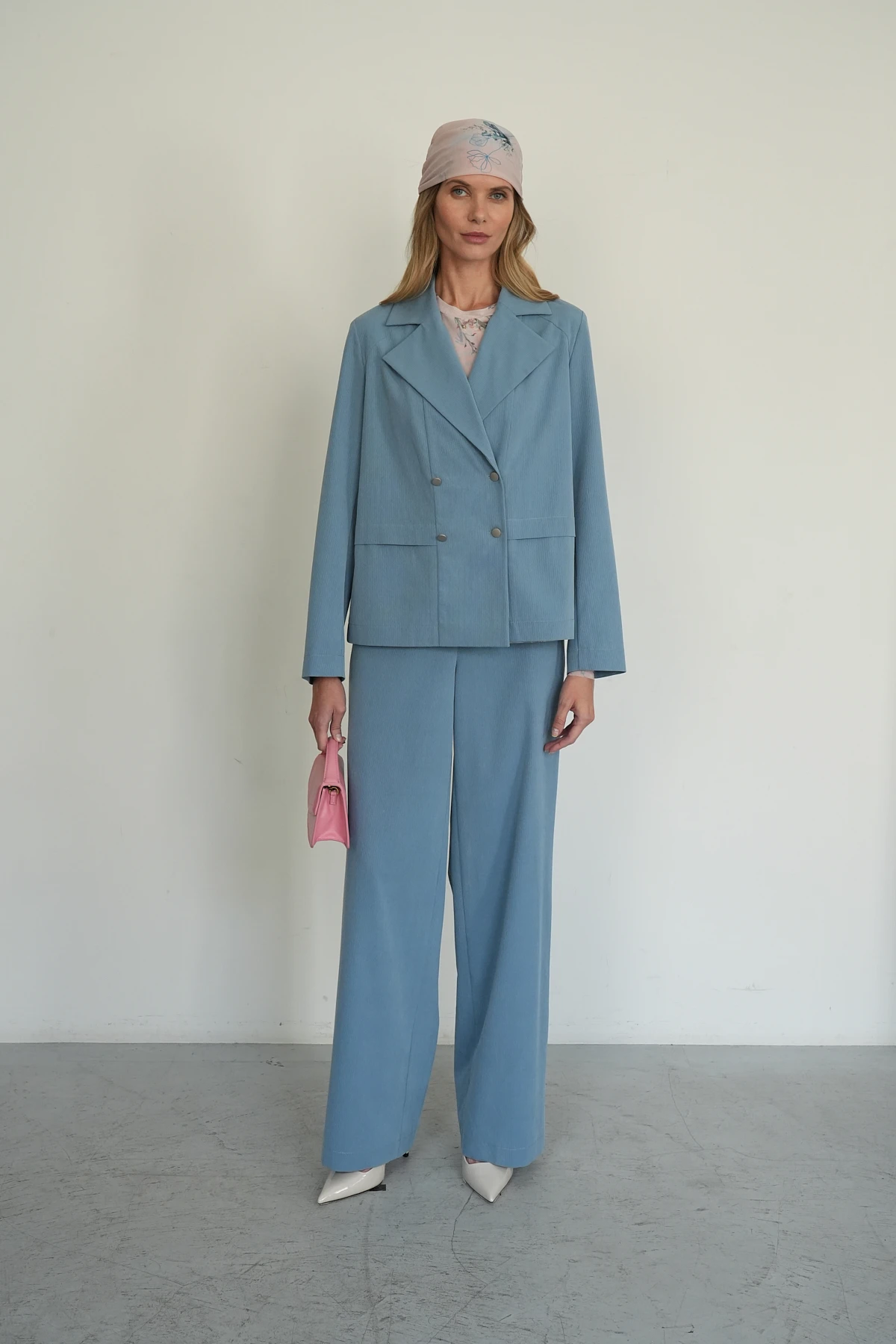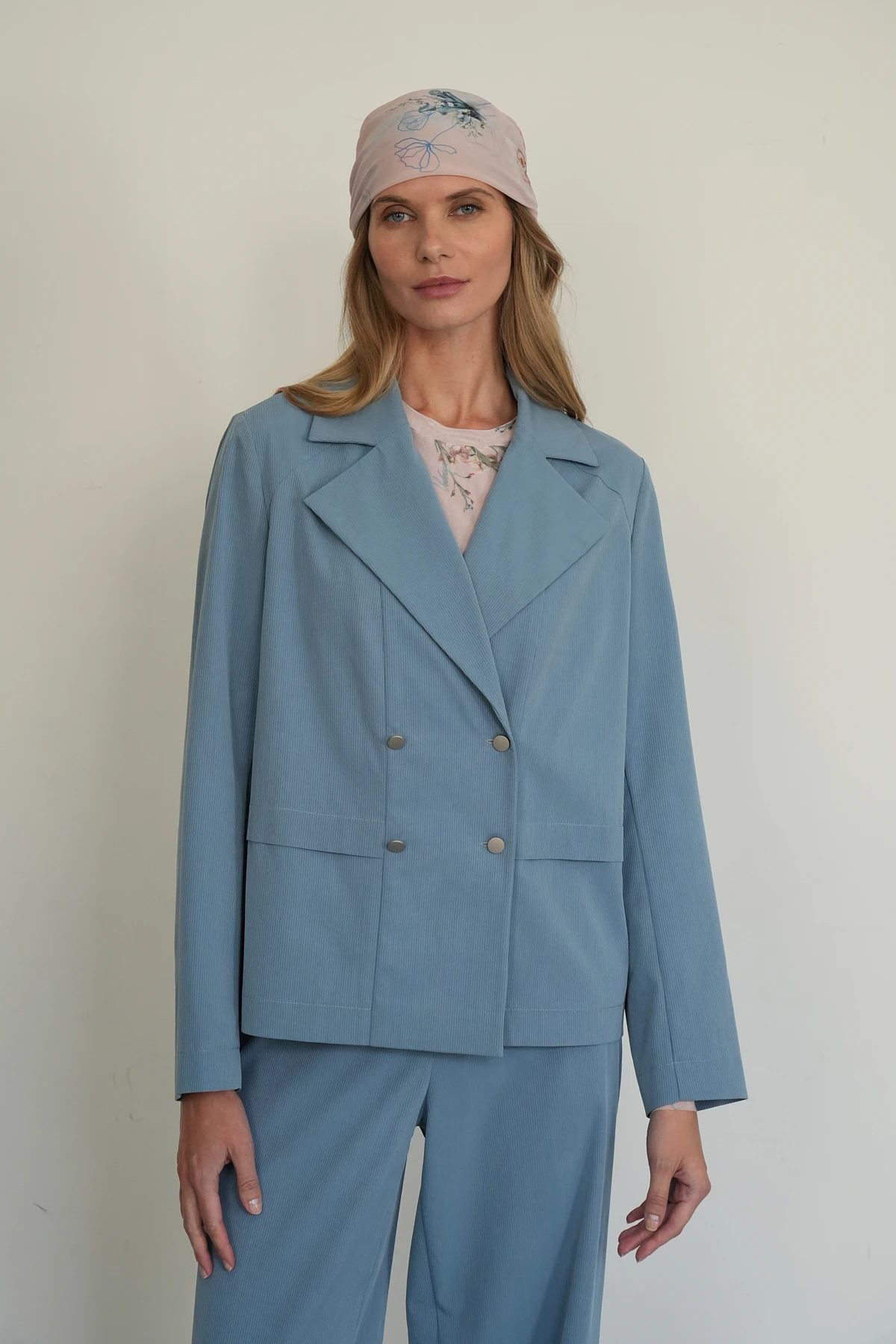 Монохромный жакет из ткани на основе премиального района с эффектом бархатистого вельвета в изысканном серо-голубом оттенке — элегантный выбор для стильного образа. Двубортный крой прямого силуэта с английским воротником подчёркивает строгость и утончённость модели. Декоративные швы на плечах создают эффект реглана, добавляя интересную текстурную деталь. Втачные рукава полной длины и декоративная полоса из основной ткани на линии талии подчёркивают сбалансированность дизайна. Жакет застёгивается на матовые серебристые пуговицы, что придаёт образу современную элегантность.