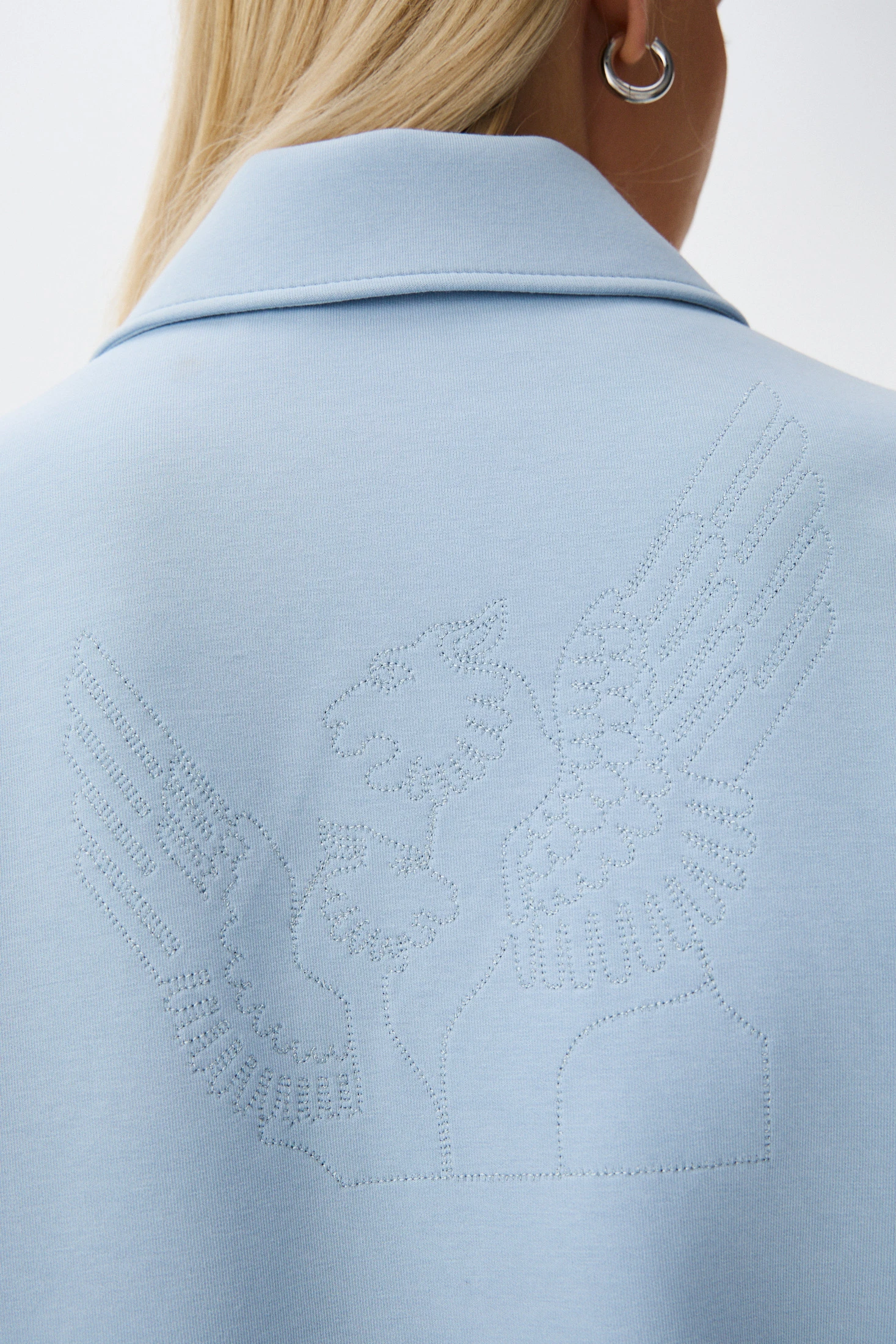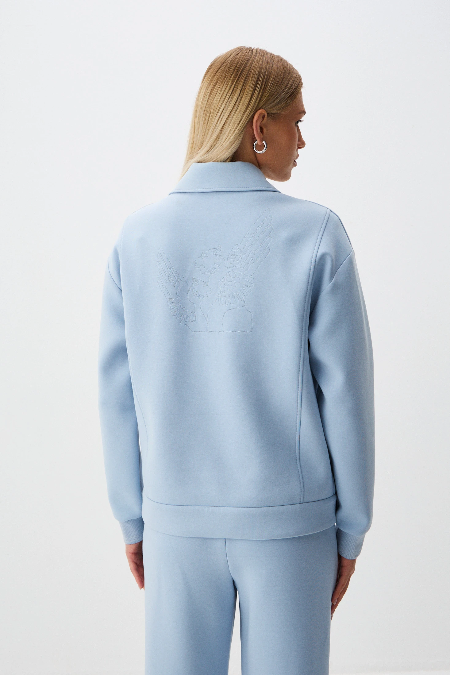 Монохромный жакет свободного кроя в нежном оттенке - выбор для тех, кто ценит сочетание комфорта, функциональности и стиля. Плотный трикотаж на основе хлопка гигроскопичен и прост в уходе. Застёжка на молнию, практичные карманы – удобные детали, создающие комфорт в носке. Главная изюминка жакета – фактурная вышивка грифона по спинке.