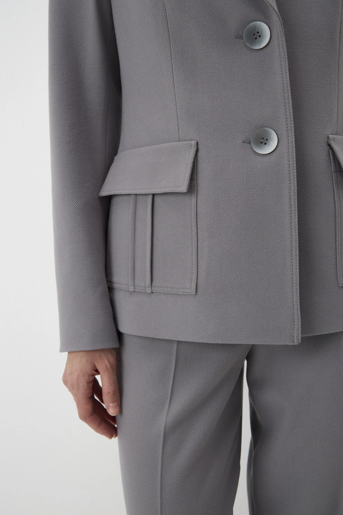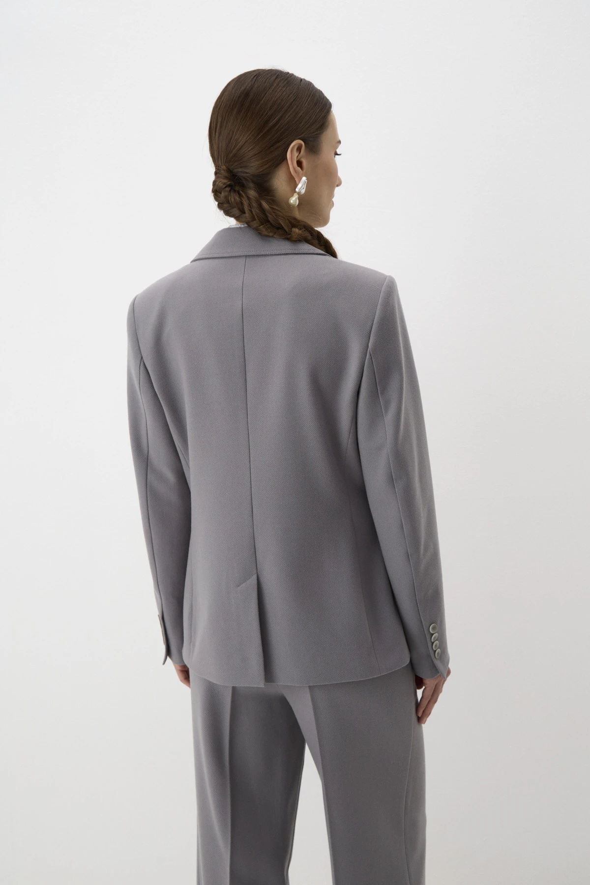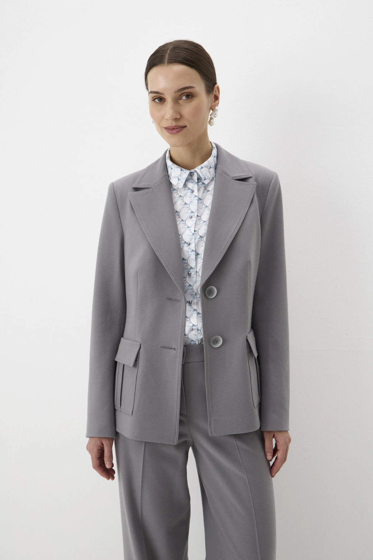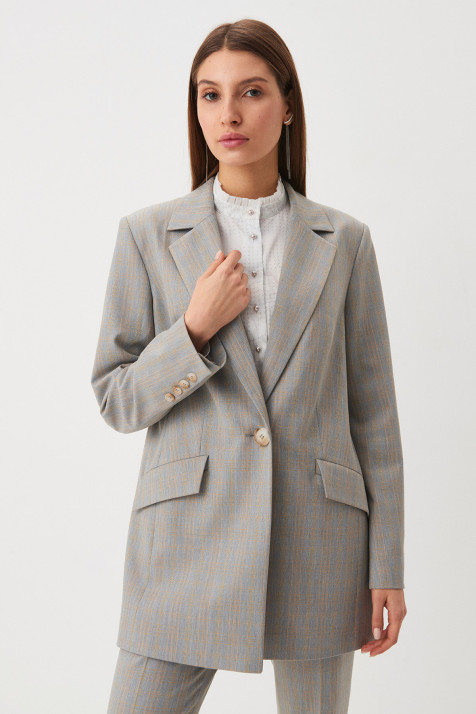 Однобортный жакет полуприлегающего силуэта с английским воротником. Модель выполнена из костюмной ткани, имитирующей фактуру тонкого сукна. Строгость основной ткани серого оттенка смягчена подкладом с авторским принтом и романтичной легендой. Комфортную посадку по фигуре обеспечивают отрезные бочки и рельефы. По переду – накладные карманы с клапанами и декоративными отстрочками, по спинке – шлица. В зависимости от модели-компаньона жакет можно «увести» в разные стили – например, в casual в паре с джинсами или в романтику с лёгким кокейльным платьем.