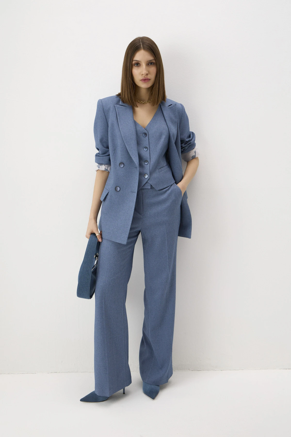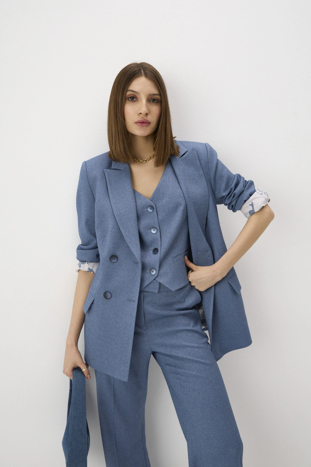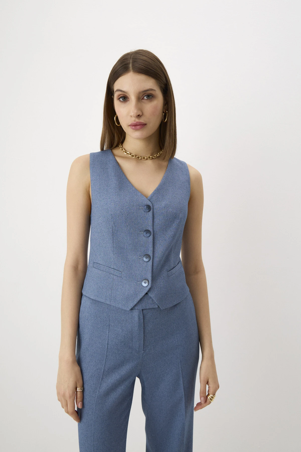 Жилет из костюмной ткани с добавлением вискозы с деликатно стилизованным узором «fishbone», добавляющим фактурности. Жилет полуприлегающего силуэта с ассиметричной линией низа. V-образный вырез переходит в однобортную застёжку на пуговицы. Умеренная глубина выреза позволяет носить жилет как с блузками, водолазками, футболками, лонгсливами, так и самостоятельно. Застёжка на матовые пуговицы.