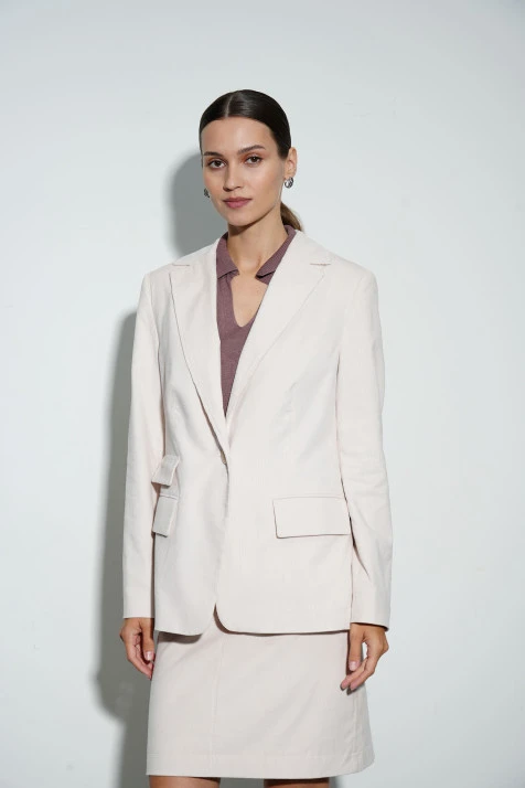 Жилет из костюмной ткани с добавлением вискозы с деликатно стилизованным узором «fishbone», добавляющим фактурности. Жилет полуприлегающего силуэта с ассиметричной линией низа. V-образный вырез переходит в однобортную застёжку на пуговицы. Умеренная глубина выреза позволяет носить жилет как с блузками, водолазками, футболками, лонгсливами, так и самостоятельно. Застёжка на матовые пуговицы.