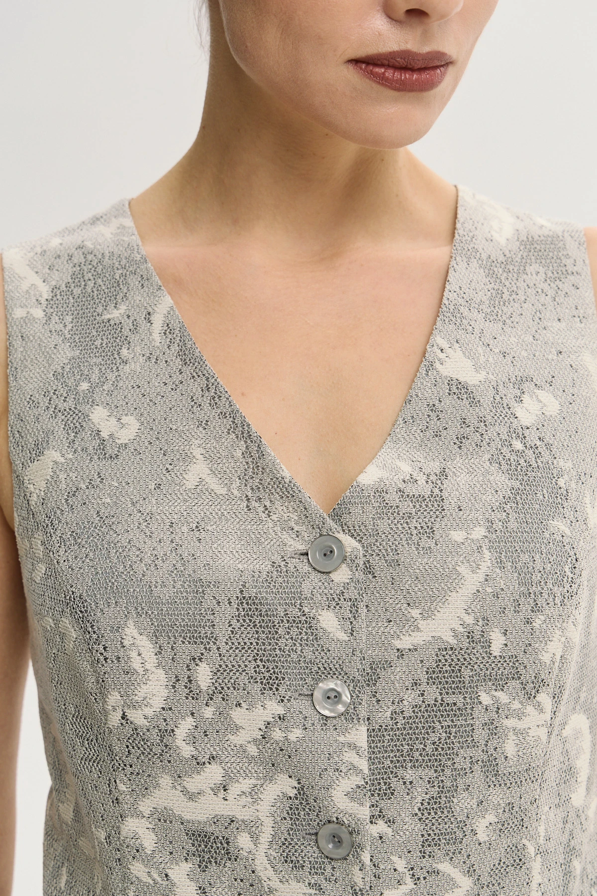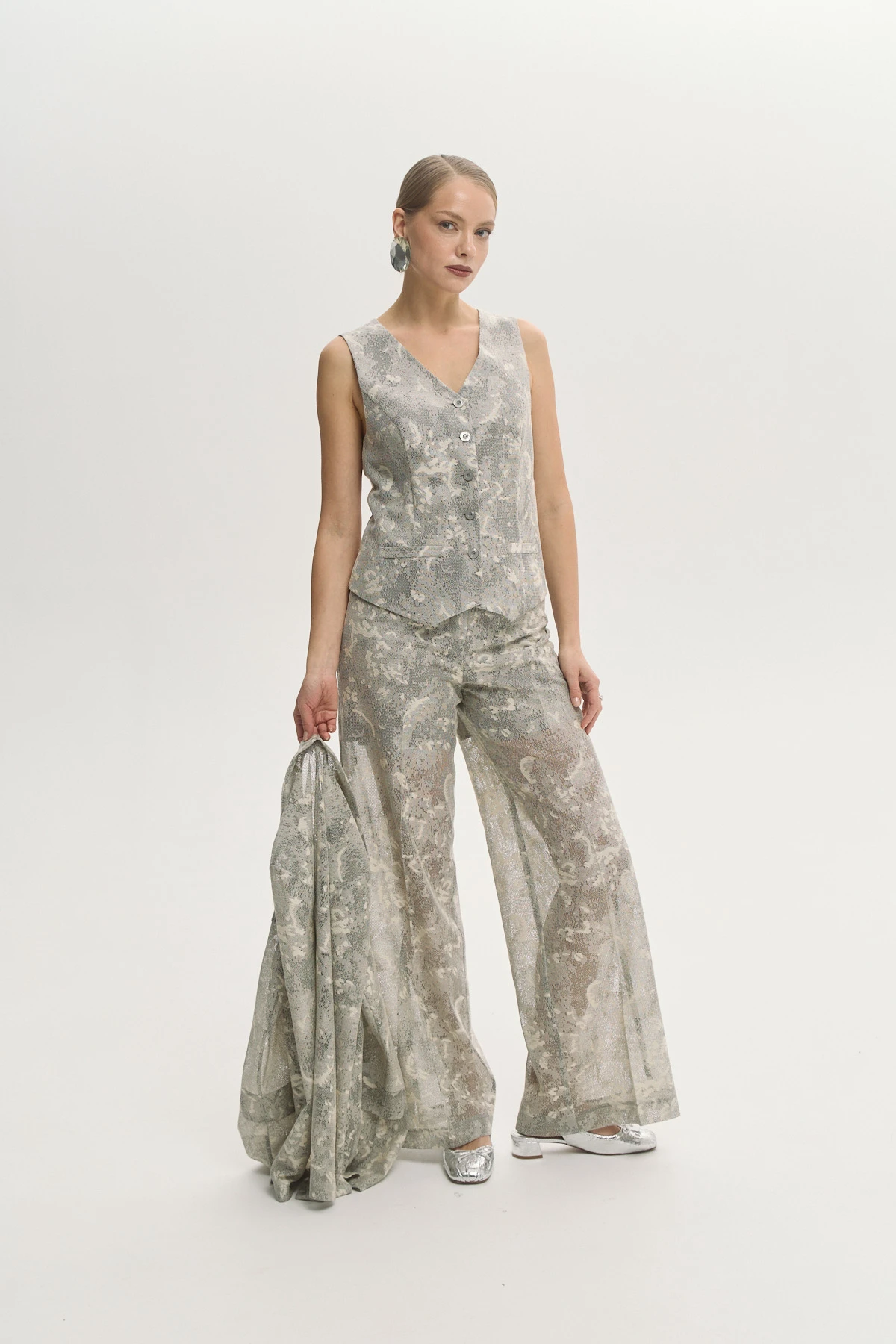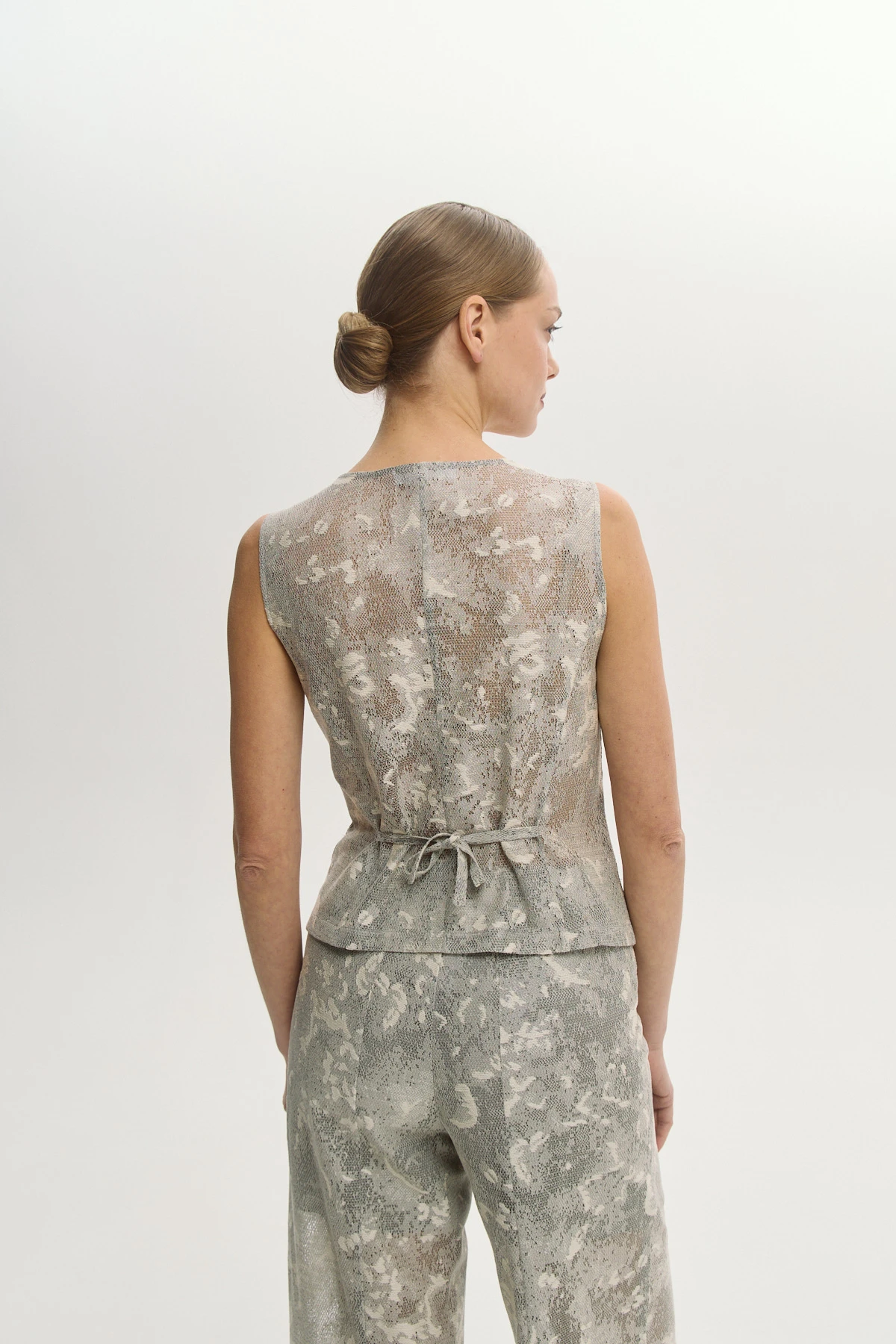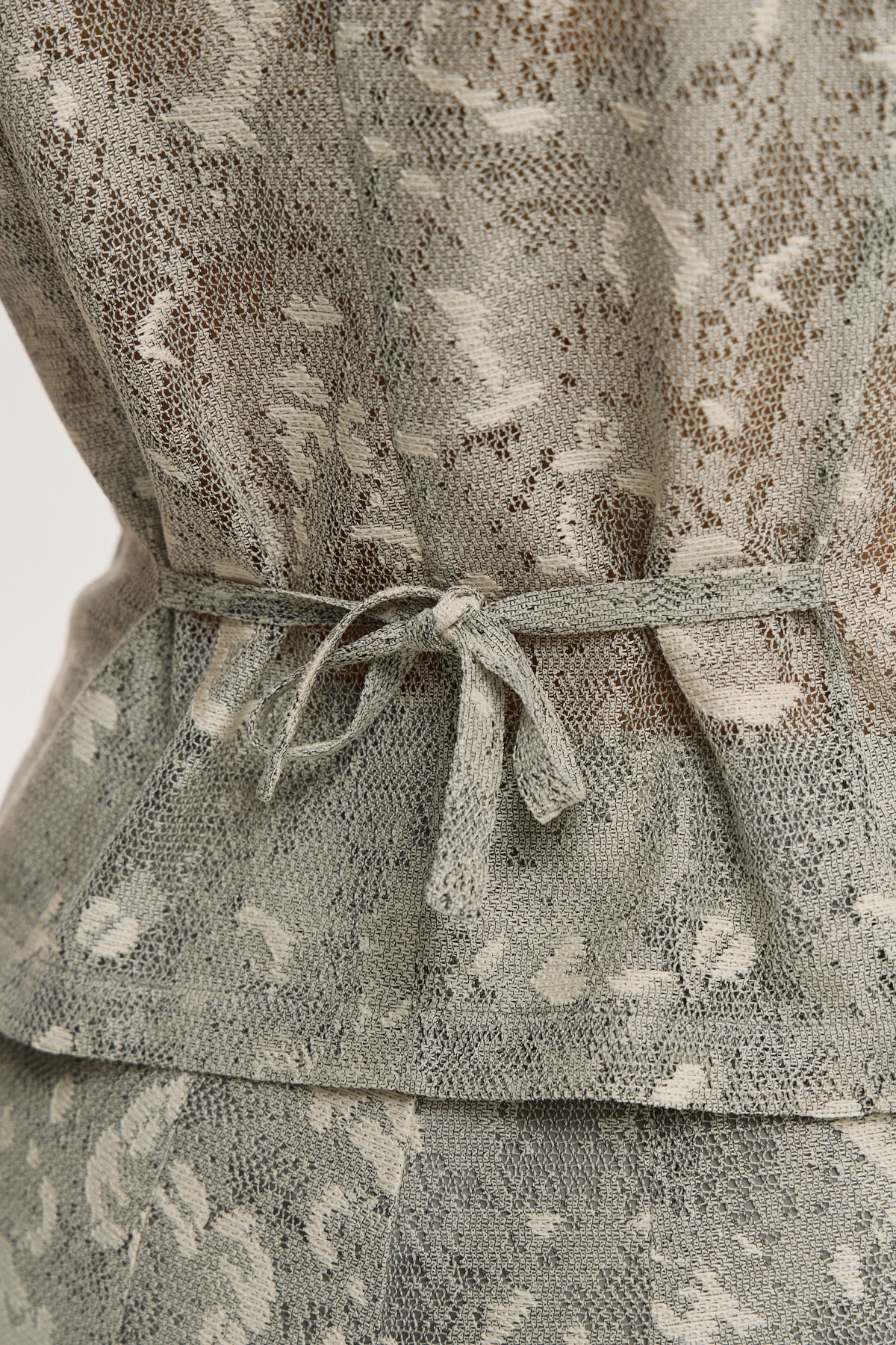 Жилет из ажурной сетки с градиентом в бежево-золотистых оттенках, создающим «мраморный» эффект. Подклад переда – мягкий гигроскопичный хлопок. Жилет приталенного силуэта с фигурной линией низа. По переду – рельефы и декоративные листочки. По спинке – хлястик на завязках, регулирующий степень прилегания жилета. Застёжка на перламутровые пуговицы с металлическим ободком.