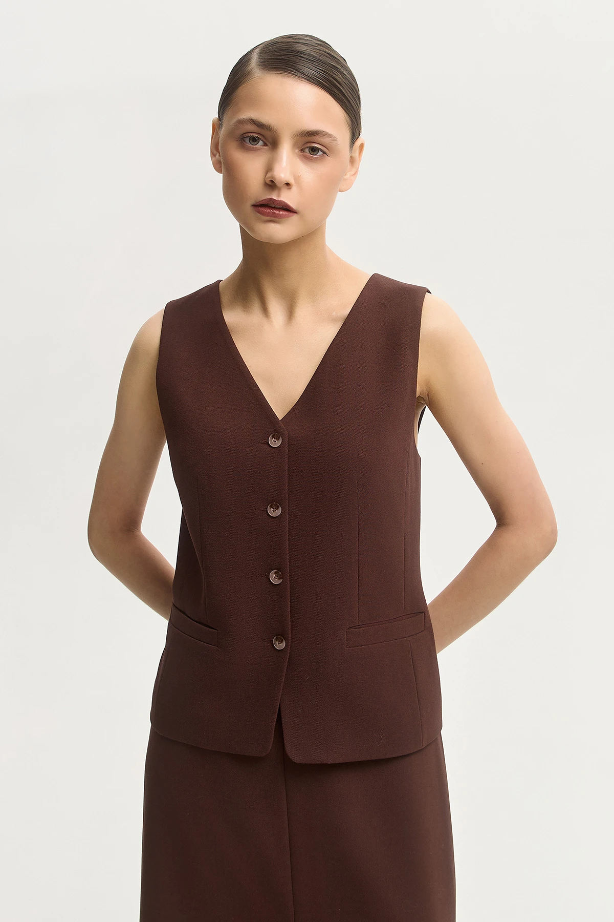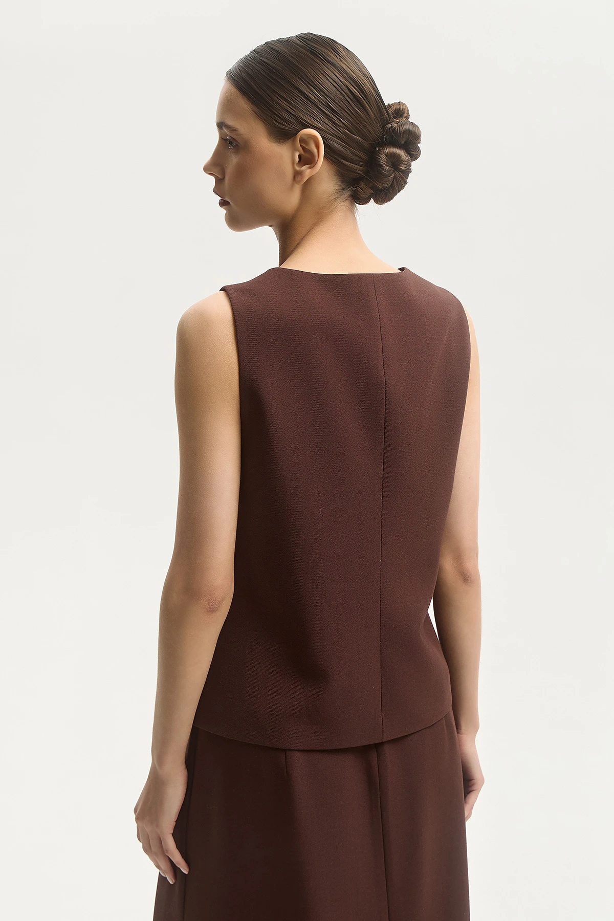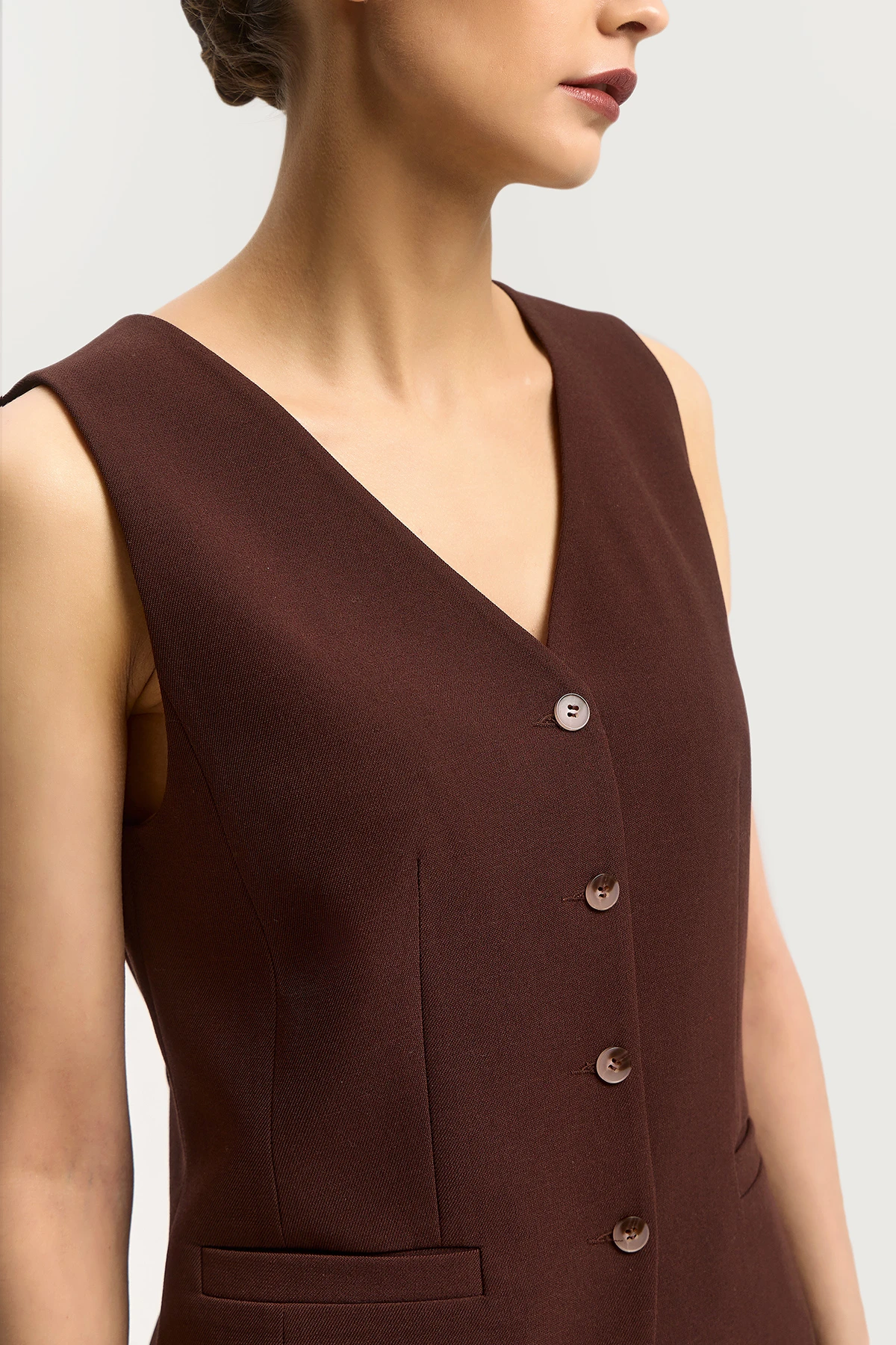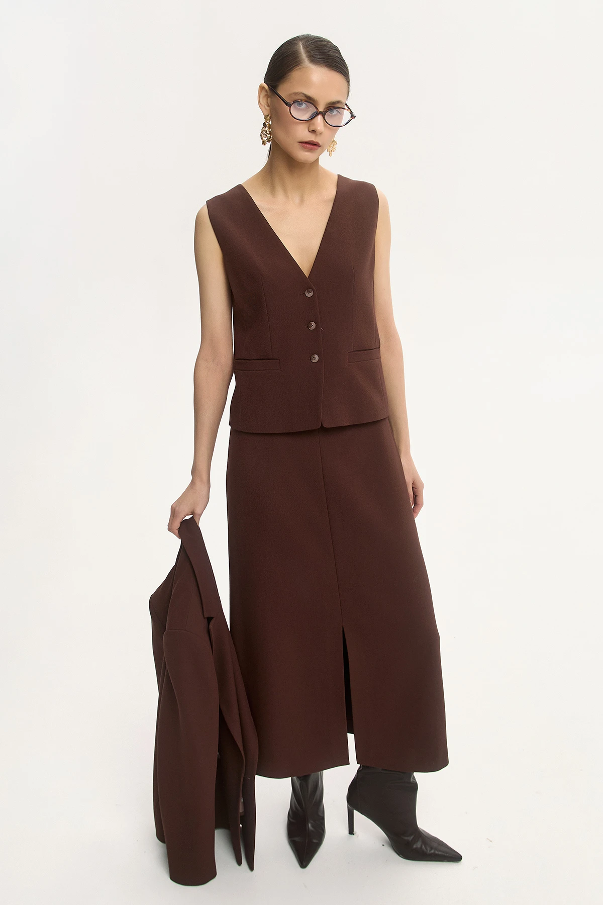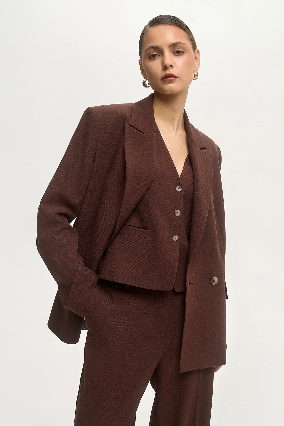 Аккуратные листочки добавляют структурности и баланса. Мягкая костюмная ткань комфортна и отлично держит форму. Шоколадный оттенок — глубокий и универсальный, подходит как для будней, так и для событий.