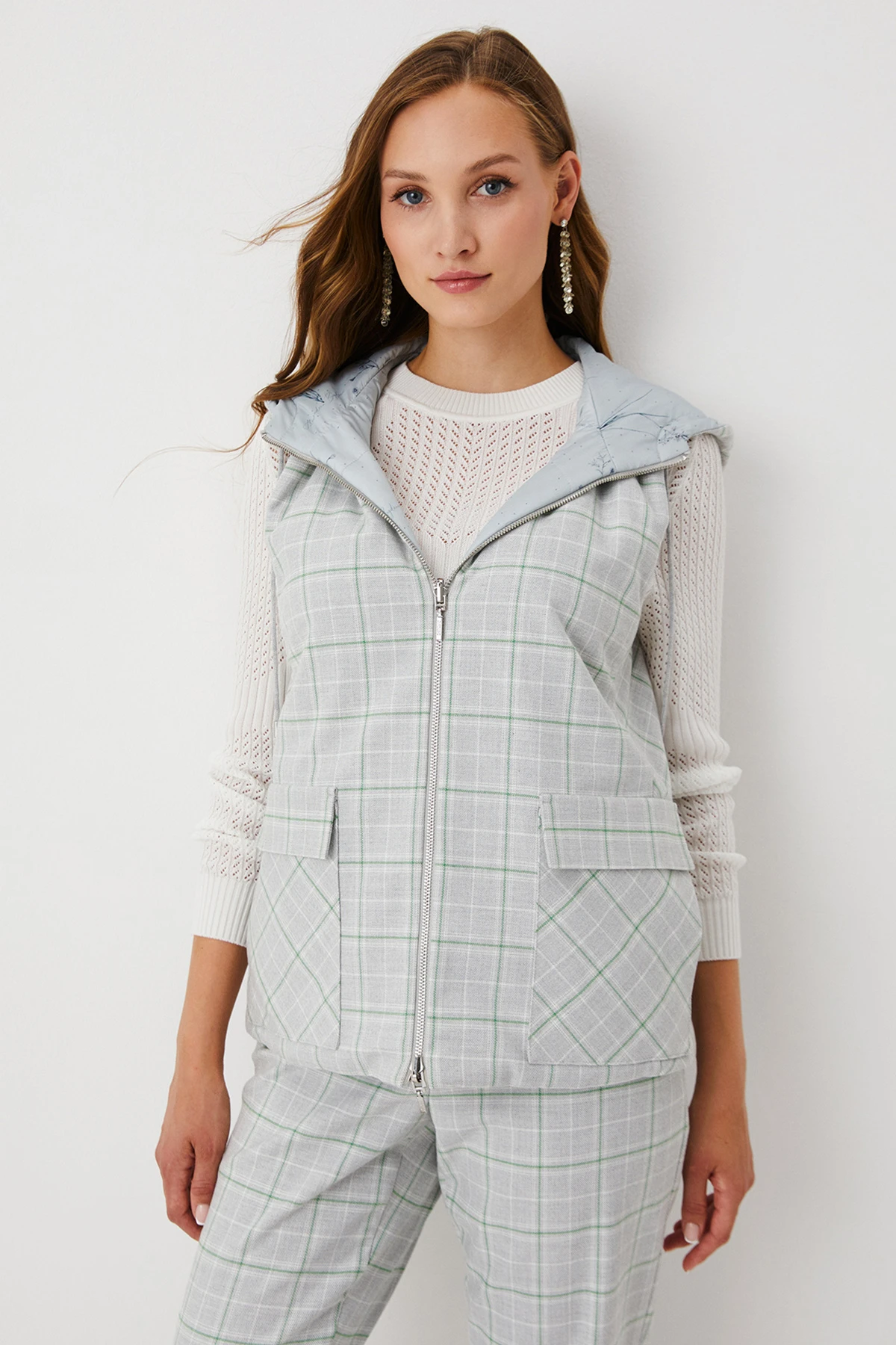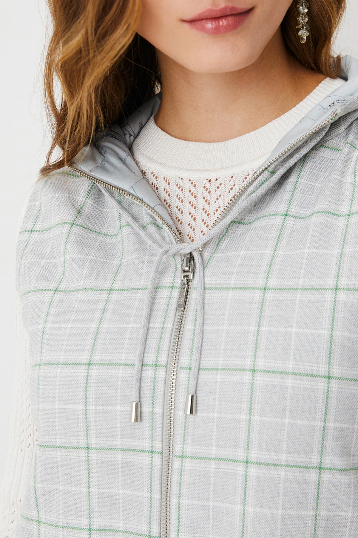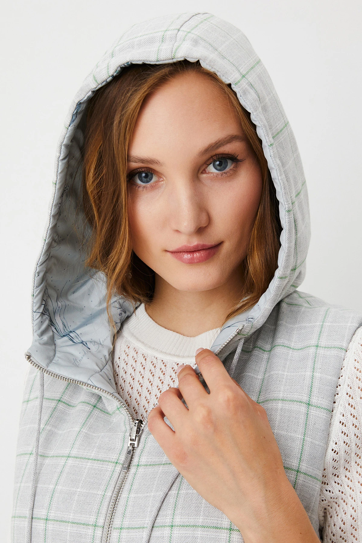 Ткань: Двусторонний жилет выполнен из материалов разных фактур: одна сторона – из ткани смешанного состава в клетку, другая – из практичного стёганого лаке с авторским принтом. Утеплитель Isosoft отличается лёгкостью, высокими теплозащитными свойствами и простотой в уходе.