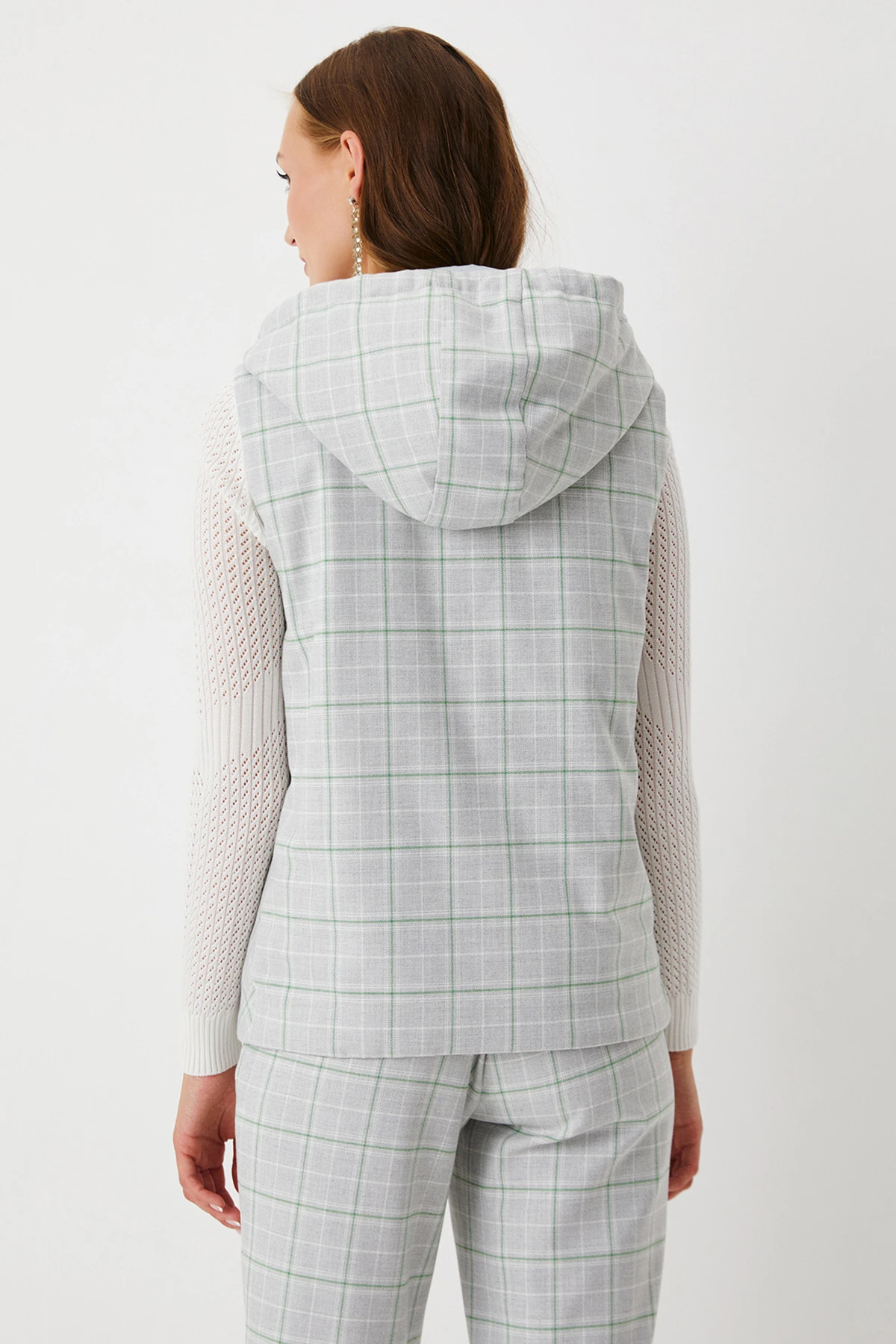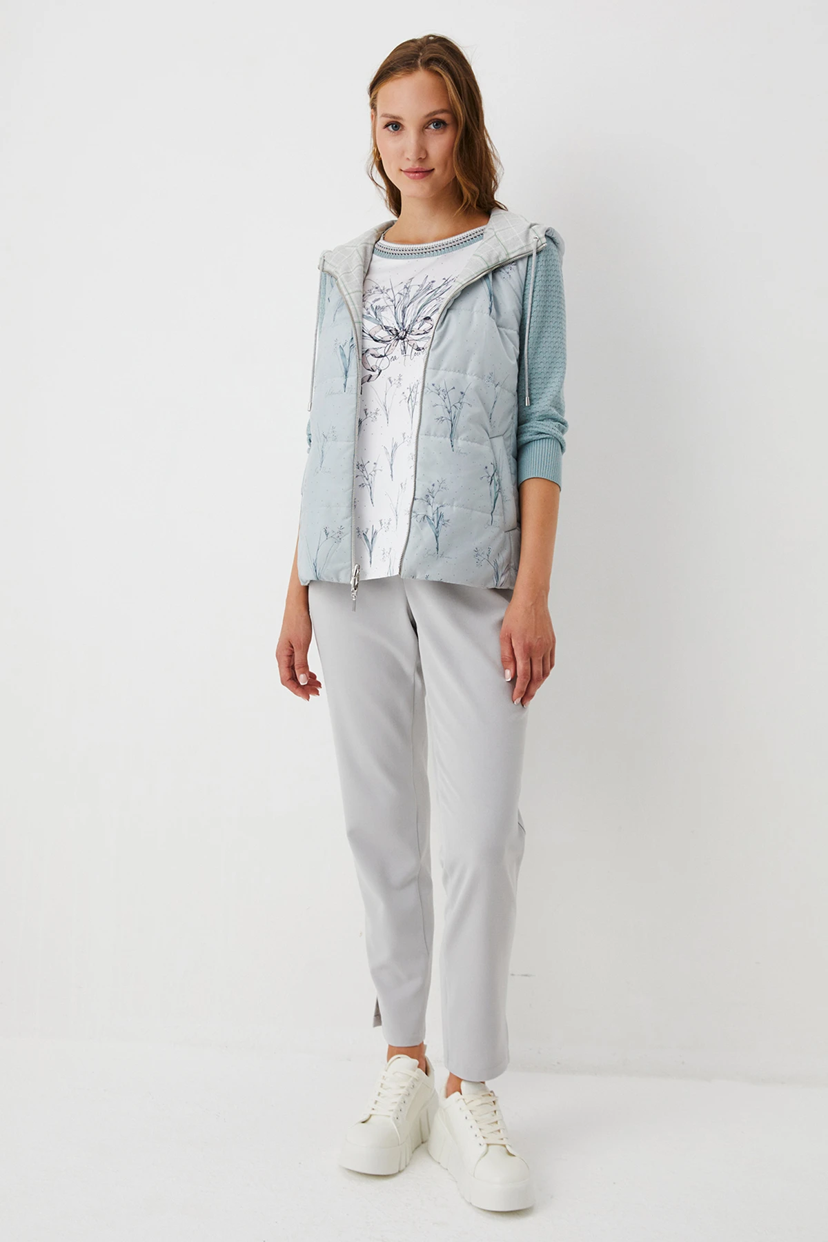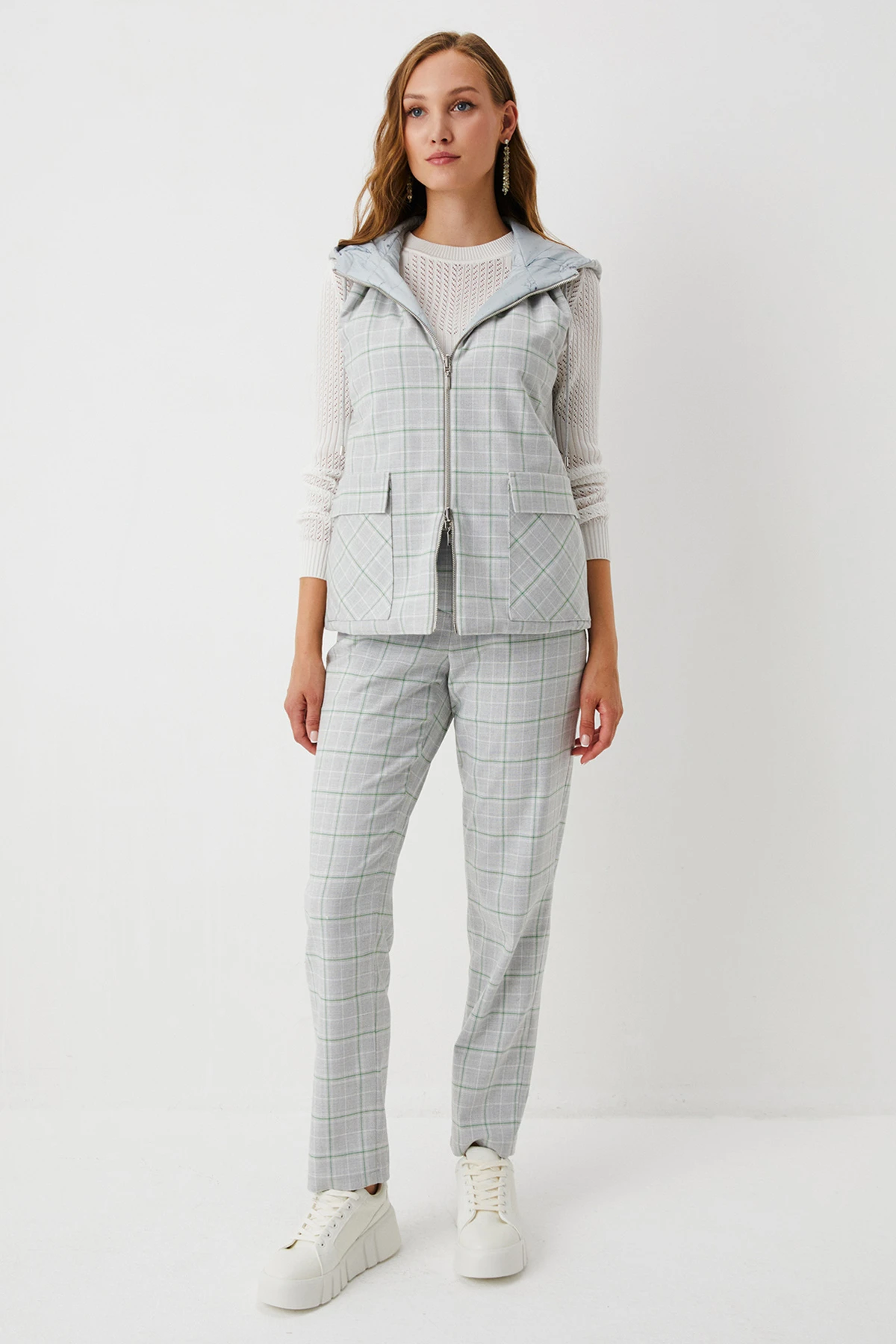 Ткань: Двусторонний жилет выполнен из материалов разных фактур: одна сторона – из ткани смешанного состава в клетку, другая – из практичного стёганого лаке с авторским принтом. Утеплитель Isosoft отличается лёгкостью, высокими теплозащитными свойствами и простотой в уходе.